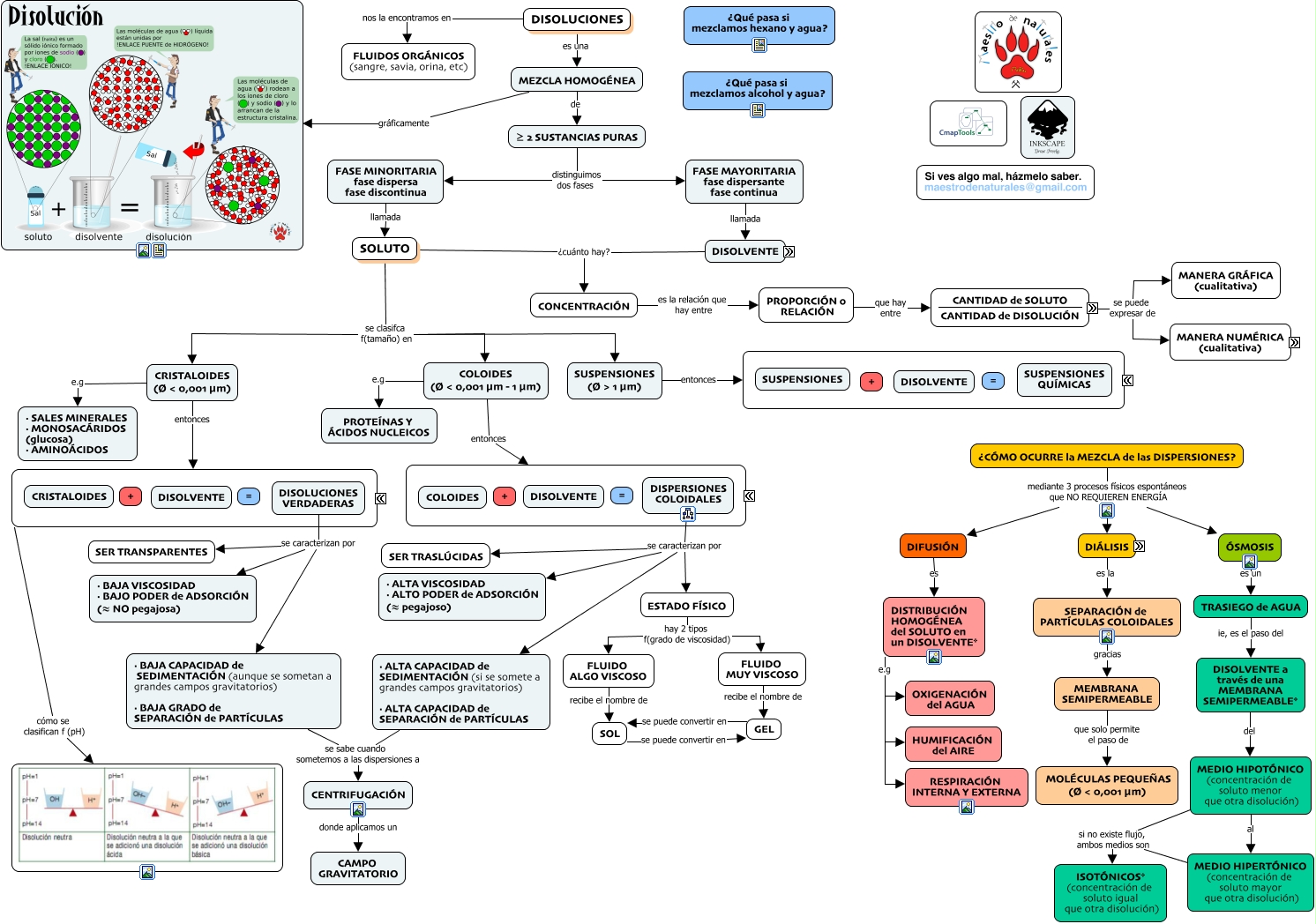 Este Cmap, tiene información relacionada con: 1.5.1 Dispersiones acuosas, MEDIO HIPERTÓNICO (concentración de soluto mayor que otra disolución) si no existe flujo, ambos medios son ISOTÓNICOS* (concentración de soluto igual que otra disolución), <math xmlns="http://www.w3.org/1998/Math/MathML"> <mrow> <mfrac> <mtext> CANTIDAD de SOLUTO </mtext> <mtext> CANTIDAD de DISOLUCIÓN </mtext> </mfrac> </mrow> </math> se expresa MOLARIDAD, DISTRIBUCIÓN HOMOGÉNEA del SOLUTO en un DISOLVENTE* e.g HUMIFICACIÓN del AIRE, MOLALIDAD i.e <math xmlns="http://www.w3.org/1998/Math/MathML"> <mrow> <mfenced open="(" close=")"> <mfrac> <mtext> moles de soluto </mtext> <mtext> kilogramos de disolución </mtext> </mfrac> </mfenced> <mtext> ×100 </mtext> </mrow> </math>, MEMBRANA SEMIPERMEABLE que permite el paso de MOLÉCULAS PEQUEÑAS (Ø < 0,001 μm), COLOIDES (Ø < 0,001 μm - 1 μm) entonces DISPERSIONES COLOIDALES, PORCENTAJE masa/masa i.e <math xmlns="http://www.w3.org/1998/Math/MathML"> <mrow> <mfenced open="(" close=")"> <mfrac> <mtext> masa de soluto </mtext> <mtext> masa de disolución </mtext> </mfrac> </mfenced> <mtext> ×100 </mtext> </mrow> </math>, SOLUTO se clasifca f(tamaño) en COLOIDES (Ø < 0,001 μm - 1 μm), DISTRIBUCIÓN HOMOGÉNEA del SOLUTO en un DISOLVENTE* e.g RESPIRACIÓN INTERNA Y EXTERNA, SOL se puede convertir en GEL, DISOLVENTES APOLARES presentan en su estructura molecular DISTRIBUCIÓN ASIMÉTRICA de la CARGA, DISOLVENTE (fase continua) se clasifican f(polaridad) DISOLVENTES POLARES, DISOLUCIONES VERDADERAS se caracterizan por · BAJA VISCOSIDAD · BAJO PODER de ADSORCIÓN (≈ NO pegajosa), <math xmlns="http://www.w3.org/1998/Math/MathML"> <mrow> <mfrac> <mtext> CANTIDAD de SOLUTO </mtext> <mtext> CANTIDAD de DISOLUCIÓN </mtext> </mfrac> </mrow> </math> se expresa PORCENTAJE masa/volumen, PROPORCIÓN o RELACIÓN que hay entre <math xmlns="http://www.w3.org/1998/Math/MathML"> <mrow> <mfrac> <mtext> CANTIDAD de SOLUTO </mtext> <mtext> CANTIDAD de DISOLUCIÓN </mtext> </mfrac> </mrow> </math>, MEZCLA HOMOGÉNEA gráficamente, DISOLUCIONES VERDADERAS cómo se clasifican f (pH), ≥ 2 SUSTANCIAS PURAS distinguimos dos fases FASE MINORITARIA fase dispersa fase discontinua, ¿CÓMO OCURRE la MEZCLA de las DISPERSIONES? mediante 3 procesos físicos espontáneos que NO REQUIEREN ENERGÍA DIFUSIÓN, SUSPENSIONES (Ø > 1 μm) entonces SUSPENSIONES QUÍMICAS