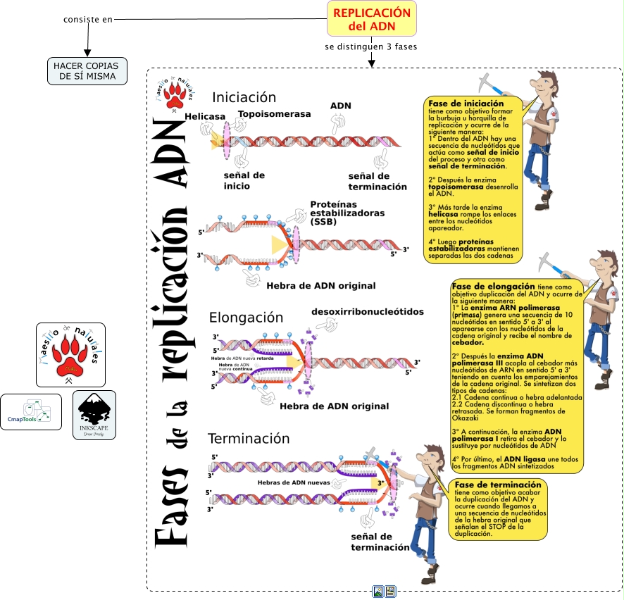Este Cmap, tiene información relacionada con: Tema 14.3 Cómo se fabrica el ADN, REPLICACIÓN del ADN consiste en HACER COPIAS DE SÍ MISMA, REPLICACIÓN del ADN se distinguen 3 fases