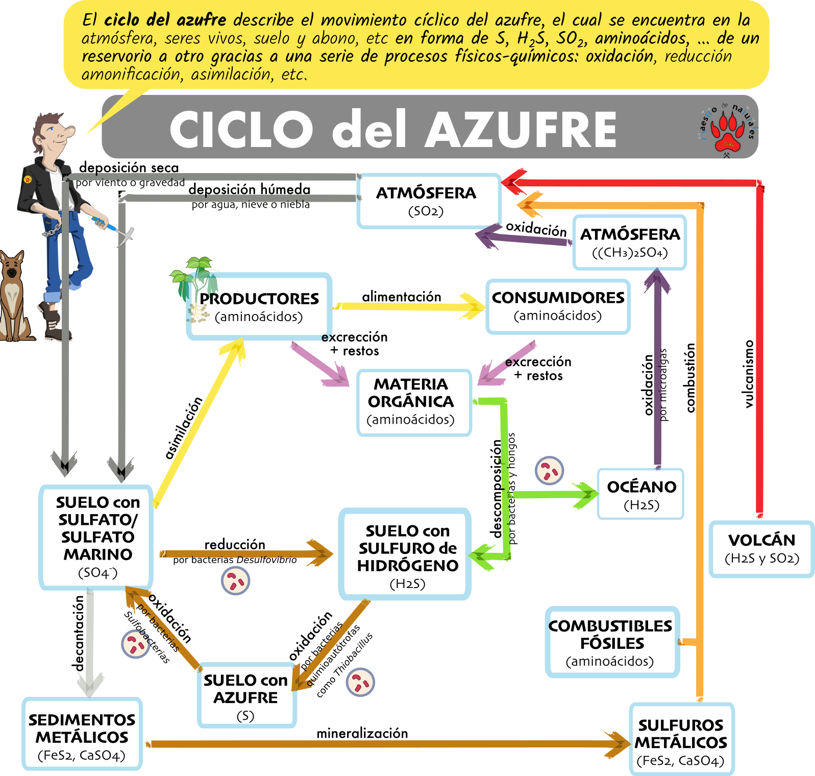 Este Cmap, tiene información relacionada con: Tema 17.6 Microorganismos y el ciclo de la materia, DISTINTOS RESERVORIOS del AZUFRE SUFRE una serie de TRANSFORMACIONES FÍSICO -QUÍMICAS que hace que AZUFRE se mueva entre la ATMÓSFERA, GEOSFERA, HIDROSFERA y BISOFERA ¿cuáles son esas transformaciones? REDUCCIÓN es la ganancia de electrones, MOVIMIENTOS CÍCLICOS de los ELEMENTOS QUÍMICOS (N, C, O, H, Ca, Na, S, P, etc) de un RESERVARIO a otro RESERVORIO gracias a una serie de PROCESOS FÍSICOS-QUÍMICOS los más importantes son CICLO del FÓSFORO, DISTINTOS RESERVORIOS del FÓSFORO SUFRE una serie de TRANSFORMACIONES FÍSICO -QUÍMICAS que hace que FÓSFORO se mueva entre la ATMÓSFERA, GEOSFERA, HIDROSFERA y BISOFERA ¿cuáles son esas transformaciones? ASIMILACIÓN: los plantas toman el fosfato y lo utilizan para fabricar ácidos nucleicos, M.O mediante FERMENTACIÓN BUTÍRICA (Clostridium butyricum), MOVIMIENTOS CÍCLICOS de los ELEMENTOS QUÍMICOS (N, C, O, H, Ca, Na, S, P, etc) de un RESERVARIO a otro RESERVORIO gracias a una serie de PROCESOS FÍSICOS-QUÍMICOS los más importantes son CICLO del AZUFRE, ARQUEASBACTERIAS METANÓGENAS descomponen M.O y producen CH4, OXIDACIÓN por BACTERIASThiobacilus (H2S →S), DISTINTOS RESERVORIOS del AZUFRE SUFRE una serie de TRANSFORMACIONES FÍSICO -QUÍMICAS que hace que AZUFRE se mueva entre la ATMÓSFERA, GEOSFERA, HIDROSFERA y BISOFERA ¿cuáles son esos reservorios? ATMÓSFERA: el azufre se encuentra en forma de gases como SO, SO2 y SO4, la importancia de los microorganismos radiaca en que ARQUEASBACTERIAS METANÓGENAS, CICLO del AZUFRE es el movimiento ciclico de los DISTINTOS RESERVORIOS del AZUFRE SUFRE una serie de TRANSFORMACIONES FÍSICO -QUÍMICAS que hace que AZUFRE se mueva entre la ATMÓSFERA, GEOSFERA, HIDROSFERA y BISOFERA, DISTINTOS RESERVORIOS del CARBONO SUFRE una serie de TRANSFORMACIONES FÍSICO -QUÍMICAS que hace que CARBONO se mueva entre la ATMÓSFERA, GEOSFERA, HIDROSFERA y BISOFERA ¿cuáles son esos reservorios? AGUA del MAR: el CO y CO2 se encuentra disuelto en el agua, DISTINTOS RESERVORIOS del NITRÓGENO SUFRE una serie de TRANSFORMACIONES FÍSICO -QUÍMICAS que hace que NITRÓGENO se mueva entre la ATMÓSFERA, GEOSFERA, HIDROSFERA y BISOFERA ¿cuáles son esas transformaciones? FIJACIÓN: proceso mediante el cual el ENZIMA NITROGENASA reduce el nitrógeno atmosférico, MOVIMIENTOS CÍCLICOS de los ELEMENTOS QUÍMICOS (N, C, O, H, Ca, Na, S, P, etc) de un RESERVARIO a otro RESERVORIO gracias a una serie de PROCESOS FÍSICOS-QUÍMICOS los más importantes son CICLO del CARBONO, OXIDACIÓN por BACTERIAS Sulfobacterias (S →SO4), DISTINTOS RESERVORIOS del CARBONO SUFRE una serie de TRANSFORMACIONES FÍSICO -QUÍMICAS que hace que CARBONO se mueva entre la ATMÓSFERA, GEOSFERA, HIDROSFERA y BISOFERA ¿cuáles son esas transformaciones? PRECIPITACIÓN: proceso mediante el cual el CARBONO cae como fina lluvia sobre caparazones y el fondo marino, DESCOMPOSICIÓN RESTOS ORGÁNICOS (m.o →m.i) por HONGOS, DISTINTOS RESERVORIOS del NITRÓGENO SUFRE una serie de TRANSFORMACIONES FÍSICO -QUÍMICAS que hace que NITRÓGENO se mueva entre la ATMÓSFERA, GEOSFERA, HIDROSFERA y BISOFERA ¿cuáles son esos reservorios? SUELOS con AMONIACO, AMONIO, NITRITOS y NITRATOS, DESCOMPOSICIÓN RESTOS ORGÁNICOS (m.o →m.i) por HONGOS, DISTINTOS RESERVORIOS del NITRÓGENO SUFRE una serie de TRANSFORMACIONES FÍSICO -QUÍMICAS que hace que NITRÓGENO se mueva entre la ATMÓSFERA, GEOSFERA, HIDROSFERA y BISOFERA ¿cuáles son esas transformaciones? DESNITRIFICACIÓN: transformación del nitrato en nitrógeno atmosférico (N2) por bacterias denitrificantes como Pseudomonas, DISTINTOS RESERVORIOS del CARBONO SUFRE una serie de TRANSFORMACIONES FÍSICO -QUÍMICAS que hace que CARBONO se mueva entre la ATMÓSFERA, GEOSFERA, HIDROSFERA y BISOFERA ¿cuáles son esas transformaciones? SEDIMENTACIÓN: proceso mediante el cual el CARBONO es se deposita en el fondo marino