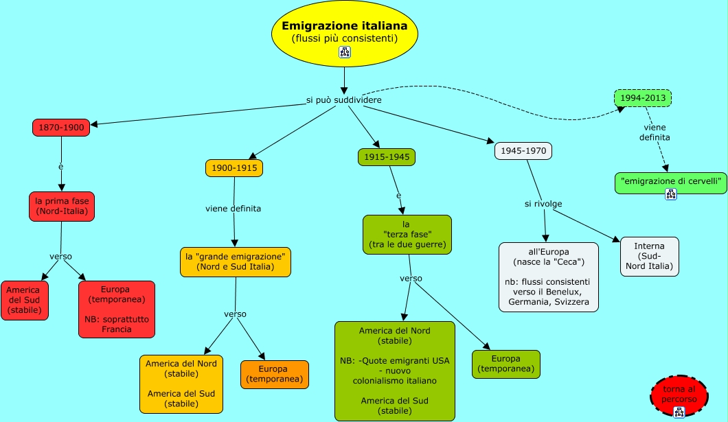 Questa Cmap, creata con IHMC CmapTools, contiene informazioni relative a: emigrazione totale, Emigrazione italiana (flussi più consistenti) si può suddividere 1915-1945, Emigrazione italiana (flussi più consistenti) si può suddividere 1994-2013, Emigrazione italiana (flussi più consistenti) si può suddividere 1870-1900, la "terza fase" (tra le due guerre) verso America del Nord (stabile) NB: -Quote emigranti USA - nuovo colonialismo italiano America del Sud (stabile), la prima fase (Nord-Italia) verso America del Sud (stabile), 1994-2013 viene definita "emigrazione di cervelli", Emigrazione italiana (flussi più consistenti) si può suddividere 1900-1915, Emigrazione italiana (flussi più consistenti) si può suddividere 1945-1970, 1870-1900 è la prima fase (Nord-Italia), 1900-1915 viene definita la "grande emigrazione" (Nord e Sud Italia), la "grande emigrazione" (Nord e Sud Italia) verso America del Nord (stabile) America del Sud (stabile), la prima fase (Nord-Italia) verso Europa (temporanea) NB: soprattutto Francia, 1945-1970 si rivolge Interna (Sud- Nord Italia), 1915-1945 è la "terza fase" (tra le due guerre), 1945-1970 si rivolge all'Europa (nasce la "Ceca") nb: flussi consistenti verso il Benelux, Germania, Svizzera, la "grande emigrazione" (Nord e Sud Italia) verso Europa (temporanea), la "terza fase" (tra le due guerre) verso Europa (temporanea)
