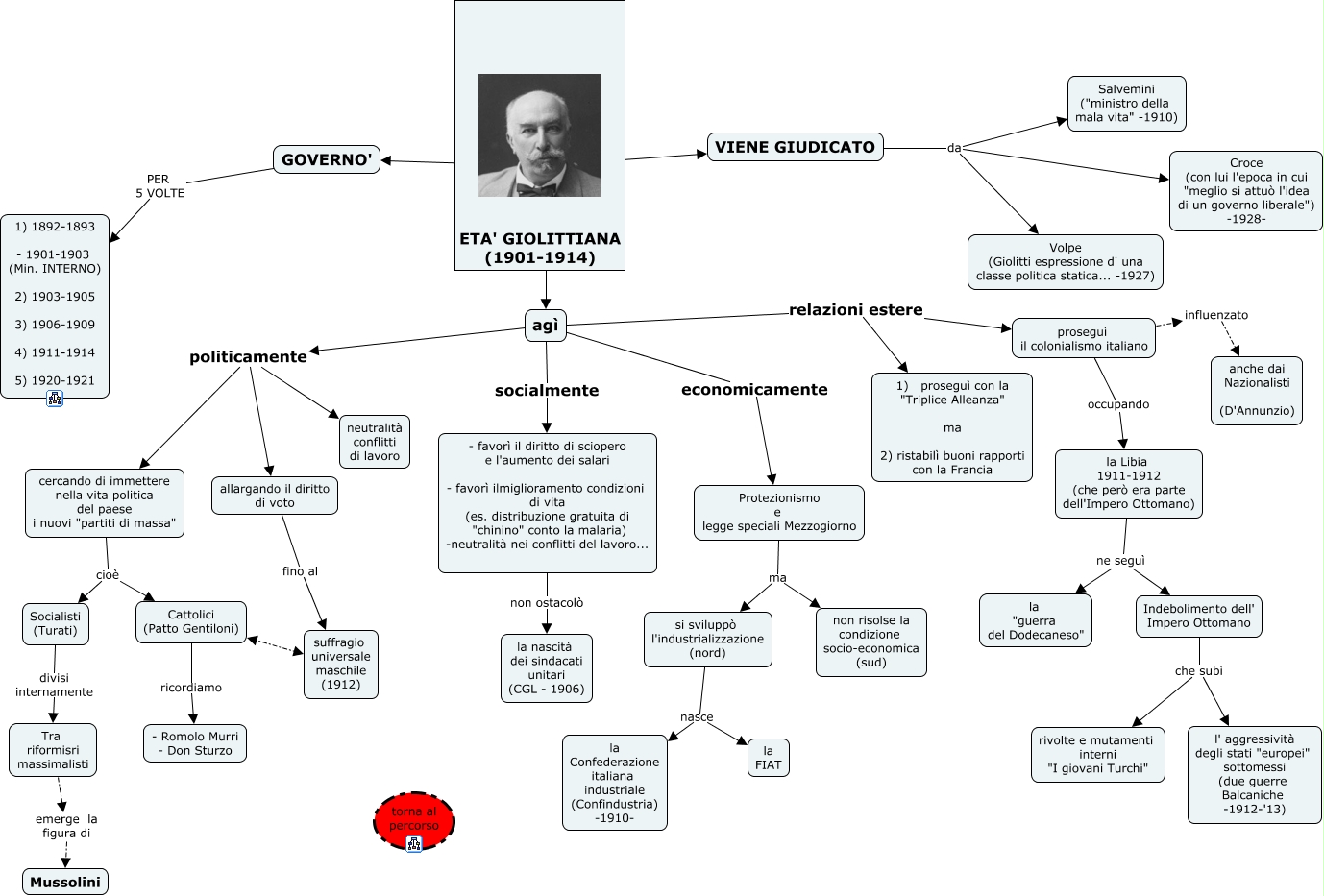 Questa Cmap, creata con IHMC CmapTools, contiene informazioni relative a: Età giolittiana, agì socialmente - favorì il diritto di sciopero e l'aumento dei salari - favorì ilmiglioramento condizioni di vita (es. distribuzione gratuita di "chinino" conto la malaria) -neutralità nei conflitti del lavoro..., Socialisti (Turati) divisi internamente Tra riformisri massimalisti, agì politicamente cercando di immettere nella vita politica del paese i nuovi "partiti di massa", cercando di immettere nella vita politica del paese i nuovi "partiti di massa" cioè Socialisti (Turati), ETA' GIOLITTIANA (1901-1914) G. GIOLITTI agì, si sviluppò l'industrializzazione (nord) nasce la FIAT, proseguì il colonialismo italiano influenzato anche dai Nazionalisti (D'Annunzio), ETA' GIOLITTIANA (1901-1914) G. GIOLITTI GOVERNO', VIENE GIUDICATO da Salvemini ("ministro della mala vita" -1910), la Libia 1911-1912 (che però era parte dell'Impero Ottomano) ne seguì Indebolimento dell' Impero Ottomano, Protezionismo e legge speciali Mezzogiorno ma non risolse la condizione socio-economica (sud), agì politicamente neutralità conflitti di lavoro, Tra riformisri massimalisti emerge la figura di Mussolini, Protezionismo e legge speciali Mezzogiorno ma si sviluppò l'industrializzazione (nord), la Libia 1911-1912 (che però era parte dell'Impero Ottomano) ne seguì la "guerra del Dodecaneso", cercando di immettere nella vita politica del paese i nuovi "partiti di massa" cioè Cattolici (Patto Gentiloni), Indebolimento dell' Impero Ottomano che subì rivolte e mutamenti interni "I giovani Turchi", agì relazioni estere 1) proseguì con la "Triplice Alleanza" ma 2) ristabilì buoni rapporti con la Francia, proseguì il colonialismo italiano occupando la Libia 1911-1912 (che però era parte dell'Impero Ottomano), ETA' GIOLITTIANA (1901-1914) G. GIOLITTI VIENE GIUDICATO