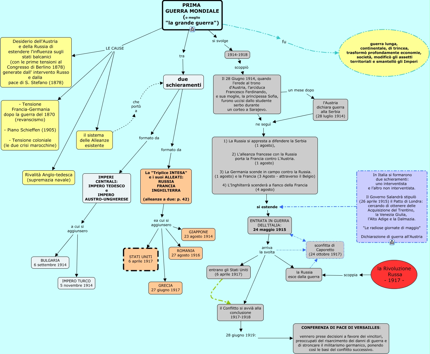 Questa Cmap, creata con IHMC CmapTools, contiene informazioni relative a: prima guerra mondiale vc.cmap, PRIMA GUERRA MONDIALE (o meglio "la grande guerra") fu guerra lunga, continentale, di trincea, trasformò profondamente economie, società, modificò gli assetti territoriali e smantellò gli Imperi, il sistema delle Alleanze esistente che portò a due schieramenti, due schieramenti formato da IMPERI CENTRALI: IMPERO TEDESCO e IMPERO AUSTRO-UNGHERESE, la Rivoluzione Russa - 1917 - scoppia la Russia esce dalla guerra, IMPERI CENTRALI: IMPERO TEDESCO e IMPERO AUSTRO-UNGHERESE a cui si aggiunsero IMPERO TURCO 5 novembre 1914, ENTRATA IN GUERRA DELL’ITALIA: 24 maggio 1915 arriva la svolta la Russia esce dalla guerra, Il 28 Giugno 1914, quando l'erede al trono d'Austria, l'arciduca Francesco Ferdinando, e sua moglie, la principessa Sofia, furono uccisi dallo studente serbo durante un corteo a Sarajevo. ne seguì 1) La Russia si appresta a difendere la Serbia (1 agosto), 2) L'alleanza francese con la Russia porta la Francia contro L'Austria. (1 agosto) 3) La Germania scende in campo contro la Russia. (1 agosto) e la Francia (3 Agosto - attraverso il Belgio) 4) L'Inghilterrà scenderà a fianco della Francia (4 agosto), La "Triplice INTESA" e i suoi ALLEATI: RUSSIA FRANCIA INGHILTERRA (alleanze a due: p. 42) ea cui si aggiunsero STATI UNITI 6 aprile 1917, Il 28 Giugno 1914, quando l'erede al trono d'Austria, l'arciduca Francesco Ferdinando, e sua moglie, la principessa Sofia, furono uccisi dallo studente serbo durante un corteo a Sarajevo. un mese dopo l'Austria dichiara guerra alla Serbia (28 luglio 1914), l'Austria dichiara guerra alla Serbia (28 luglio 1914) ne seguì 1) La Russia si appresta a difendere la Serbia (1 agosto), 2) L'alleanza francese con la Russia porta la Francia contro L'Austria. (1 agosto) 3) La Germania scende in campo contro la Russia. (1 agosto) e la Francia (3 Agosto - attraverso il Belgio) 4) L'Inghilterrà scenderà a fianco della Francia (4 agosto), sconfitta di Caporetto (24 ottobre 1917) ENTRATA IN GUERRA DELL’ITALIA: 24 maggio 1915, la Russia esce dalla guerra sconfitta di Caporetto (24 ottobre 1917), due schieramenti formato da La "Triplice INTESA" e i suoi ALLEATI: RUSSIA FRANCIA INGHILTERRA (alleanze a due: p. 42), entrano gli Stati Uniti (6 aprile 1917) il Conflitto si avvià alla conclusione 1917-1918, PRIMA GUERRA MONDIALE (o meglio "la grande guerra") si svolge 1914-1918, PRIMA GUERRA MONDIALE (o meglio "la grande guerra") LE CAUSE - Tensione Francia-Germania dopo la guerra del 1870 (revanscismo) - Piano Schieffen (1905) - Tensione coloniale (le due crisi marocchine), ENTRATA IN GUERRA DELL’ITALIA: 24 maggio 1915 arriva la svolta il Conflitto si avvià alla conclusione 1917-1918, 1914-1918 scoppiò Il 28 Giugno 1914, quando l'erede al trono d'Austria, l'arciduca Francesco Ferdinando, e sua moglie, la principessa Sofia, furono uccisi dallo studente serbo durante un corteo a Sarajevo., il Conflitto si avvià alla conclusione 1917-1918 28 giugno 1919: CONFERENZA DI PACE DI VERSAILLES: vennero prese decisioni a favore dei vincitori, preoccupati del risarcimento dei danni di guerra e di stroncare il militarismo germanico, ponendo così le basi del conflitto successivo., 1) La Russia si appresta a difendere la Serbia (1 agosto), 2) L'alleanza francese con la Russia porta la Francia contro L'Austria. (1 agosto) 3) La Germania scende in campo contro la Russia. (1 agosto) e la Francia (3 Agosto - attraverso il Belgio) 4) L'Inghilterrà scenderà a fianco della Francia (4 agosto) si estende ENTRATA IN GUERRA DELL’ITALIA: 24 maggio 1915