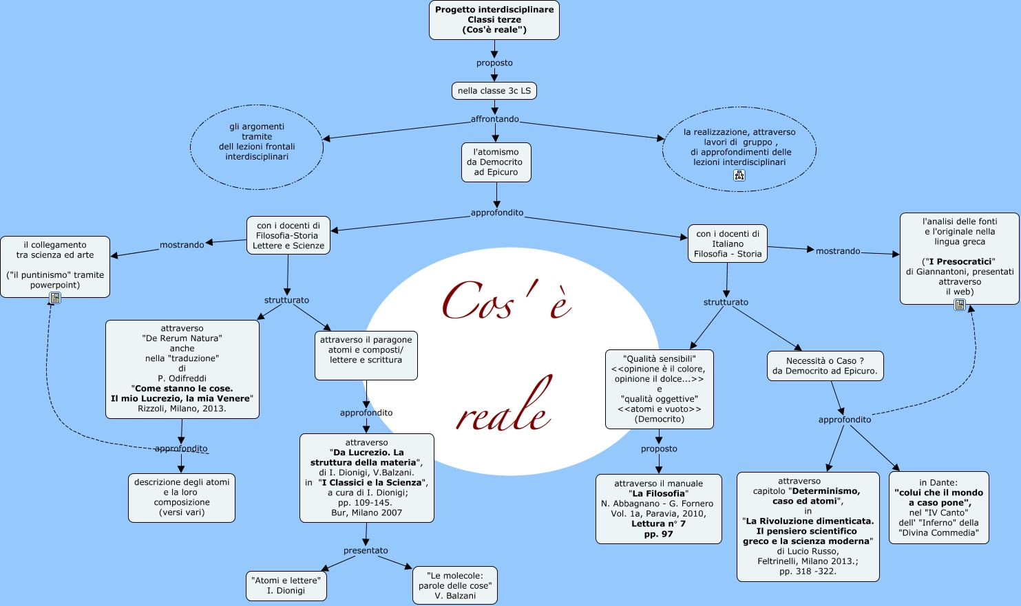 Questa Cmap, creata con IHMC CmapTools, contiene informazioni relative a: proposta classe terza C ls atomismo, Necessità o Caso ? da Democrito ad Epicuro. approfondito l'analisi delle fonti e l'originale nella lingua greca ("I Presocratici" di Giannantoni, presentati attraverso il web), con i docenti di Italiano Filosofia - Storia strutturato "Qualità sensibili" <<opinione è il colore, opinione il dolce...>> e "qualità oggettive" <<atomi e vuoto>> (Democrito), attraverso "De Rerum Natura" anche nella "traduzione" di P. Odifreddi "Come stanno le cose. Il mio Lucrezio, la mia Venere" Rizzoli, Milano, 2013. approfondito il collegamento tra scienza ed arte ("il puntinismo" tramite powerpoint), nella classe 3c LS affrontando l'atomismo da Democrito ad Epicuro, Progetto interdisciplinare Classi terze (Cos'è reale") proposto nella classe 3c LS, l'atomismo da Democrito ad Epicuro approfondito con i docenti di Italiano Filosofia - Storia, con i docenti di Italiano Filosofia - Storia mostrando l'analisi delle fonti e l'originale nella lingua greca ("I Presocratici" di Giannantoni, presentati attraverso il web), Necessità o Caso ? da Democrito ad Epicuro. approfondito in Dante: "colui che il mondo a caso pone", nel "IV Canto" dell' "Inferno" della "Divina Commedia", con i docenti di Filosofia-Storia Lettere e Scienze strutturato attraverso "De Rerum Natura" anche nella "traduzione" di P. Odifreddi "Come stanno le cose. Il mio Lucrezio, la mia Venere" Rizzoli, Milano, 2013., "Qualità sensibili" <<opinione è il colore, opinione il dolce...>> e "qualità oggettive" <<atomi e vuoto>> (Democrito) proposto attraverso il manuale "La Filosofia" N. Abbagnano - G. Fornero Vol. 1a, Paravia, 2010, Lettura n° 7 pp. 97, attraverso "Da Lucrezio. La struttura della materia", di I. Dionigi, V.Balzani. in "I Classici e la Scienza", a cura di I. Dionigi; pp. 109-145. Bur, Milano 2007 presentato "Atomi e lettere" I. Dionigi, nella classe 3c LS affrontando la realizzazione, attraverso lavori di gruppo , di approfondimenti delle lezioni interdisciplinari, l'atomismo da Democrito ad Epicuro approfondito con i docenti di Filosofia-Storia Lettere e Scienze, attraverso "Da Lucrezio. La struttura della materia", di I. Dionigi, V.Balzani. in "I Classici e la Scienza", a cura di I. Dionigi; pp. 109-145. Bur, Milano 2007 presentato "Le molecole: parole delle cose" V. Balzani, con i docenti di Filosofia-Storia Lettere e Scienze strutturato attraverso il paragone atomi e composti/ lettere e scrittura, attraverso "De Rerum Natura" anche nella "traduzione" di P. Odifreddi "Come stanno le cose. Il mio Lucrezio, la mia Venere" Rizzoli, Milano, 2013. approfondito descrizione degli atomi e la loro composizione (versi vari), con i docenti di Filosofia-Storia Lettere e Scienze mostrando il collegamento tra scienza ed arte ("il puntinismo" tramite powerpoint), attraverso il paragone atomi e composti/ lettere e scrittura approfondito attraverso "Da Lucrezio. La struttura della materia", di I. Dionigi, V.Balzani. in "I Classici e la Scienza", a cura di I. Dionigi; pp. 109-145. Bur, Milano 2007, Necessità o Caso ? da Democrito ad Epicuro. approfondito attraverso capitolo "Determinismo, caso ed atomi", in "La Rivoluzione dimenticata. Il pensiero scientifico greco e la scienza moderna" di Lucio Russo, Feltrinelli, Milano 2013.; pp. 318 -322., nella classe 3c LS affrontando gli argomenti tramite dell lezioni frontali interdisciplinari