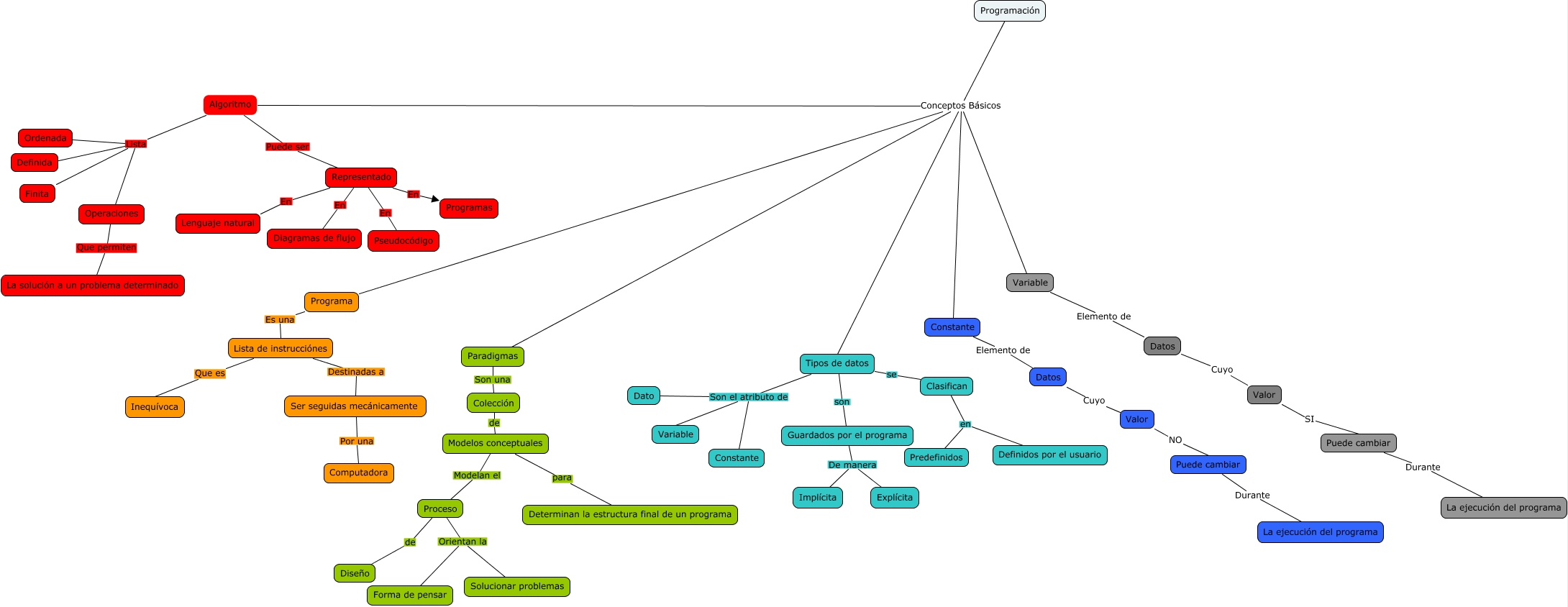 Este Cmap, tiene información relacionada con: Programación, Datos Cuyo Valor, Paradigmas Son una Colección, Proceso de Diseño, Constante Elemento de Datos, Programación Conceptos Básicos Tipos de datos, Programación Conceptos Básicos Constante, Representado En Diagramas de flujo, Datos Cuyo Valor, Puede cambiar Durante La ejecución del programa, Tipos de datos Son el atributo de Dato, Algoritmo Lista Definida, Programación Conceptos Básicos Variable, Modelos conceptuales Modelan el Proceso, Representado En Pseudocódigo, Puede cambiar Durante La ejecución del programa, Algoritmo Puede ser Representado, Proceso Orientan la Solucionar problemas, Modelos conceptuales para Determinan la estructura final de un programa, Guardados por el programa De manera Implícita, Algoritmo Lista Finita