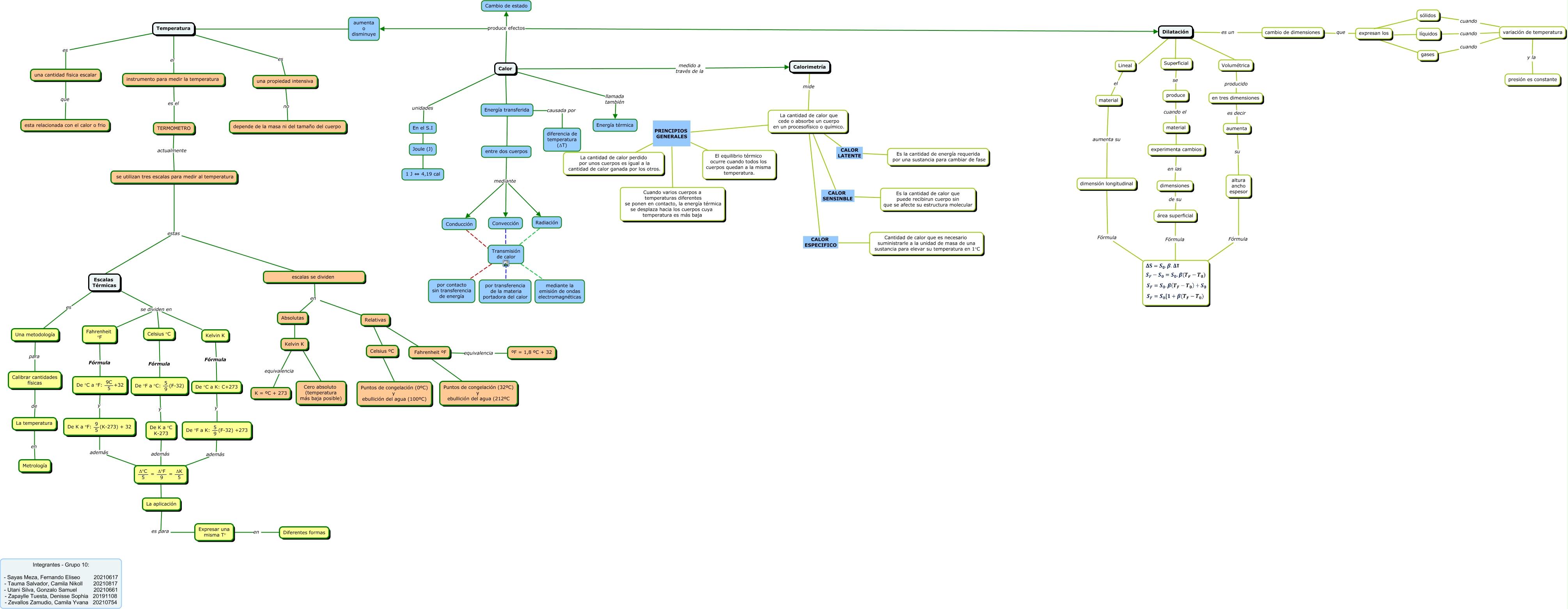 Este Cmap, tiene información relacionada con: Mapa conceptual de calor, Fahrenheit ºF ???? Puntos de congelación (32ºC) y ebullición del agua (212ºC, Temperatura es una cantidad fisica escalar, Calibrar cantidades físicas de La temperatura, se utilizan tres escalas para medir al temperatura estas Escalas Térmicas, Calor produce efectos aumenta o disminuye, gases expresan los, <math xmlns="http://www.w3.org/1998/Math/MathML"> <mrow> <mtext> De K a °F: </mtext> <mfrac> <mtext> 9 </mtext> <mtext> 5 </mtext> </mfrac> <mtext> (K-273) + 32 </mtext> </mrow> </math> además <math xmlns="http://www.w3.org/1998/Math/MathML"> <mrow> <mfrac> <mtext> Δ°C </mtext> <mtext> 5 </mtext> </mfrac> <mtext> = </mtext> <mfrac> <mtext> Δ°F </mtext> <mtext> 9 </mtext> </mfrac> <mtext> = </mtext> <mfrac> <mtext> ΔK </mtext> <mtext> 5 </mtext> </mfrac> </mrow> </math>, entre dos cuerpos mediante Convección, Dilatación Lineal, una cantidad fisica escalar que esta relacionada con el calor o frio, área superficial Fórmula, Dilatación Superficial, Convección ???? Transmisión de calor, Calor produce efectos Cambio de estado, TERMOMETRO actualmente se utilizan tres escalas para medir al temperatura, La cantidad de calor que cede o absorbe un cuerpo en un procesofísico o químico. PRINCIPIOS GENERALES Cuando varios cuerpos a temperaturas diferentes se ponen en contacto, la energía térmica se desplaza hacia los cuerpos cuya temperatura es más baja, líquidos expresan los, Fahrenheit ºF equivalencia ºF = 1,8 ºC + 32, Calor unidades En el S.I, aumenta o disminuye ???? Temperatura