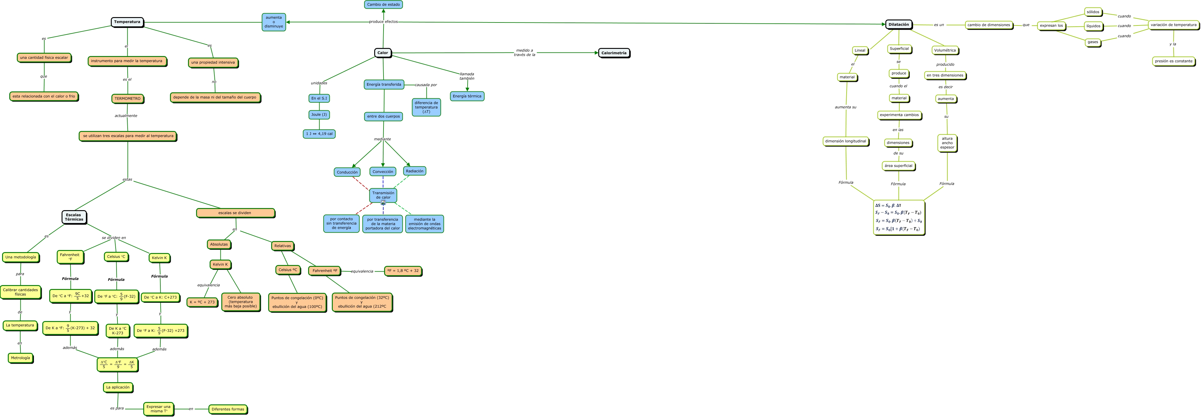 Este Cmap, tiene información relacionada con: Mapa conceptual de calor3, Fahrenheit ºF ???? Puntos de congelación (32ºC) y ebullición del agua (212ºC, Temperatura es una cantidad fisica escalar, Transmisión de calor ???? por contacto sin transferencia de energía, experimenta cambios en las dimensiones, líquidos cuando variación de temperatura, Dilatación Superficial, Escalas Térmicas es Una metodología, Dilatación es un cambio de dimensiones, De °C a K: C+273 y <math xmlns="http://www.w3.org/1998/Math/MathML"> <mrow> <mtext> De °F a K: </mtext> <mfrac> <mtext> 5 </mtext> <mtext> 9 </mtext> </mfrac> <mtext> (F-32) +273 </mtext> </mrow> </math>, Temperatura el instrumento para medir la temperatura, Dilatación Volumétrica, Kelvin K Fórmula De °C a K: C+273, Calor produce efectos aumenta o disminuye, Radiación ???? Transmisión de calor, Calor llamada también Energía térmica, Escalas Térmicas se dividen en Fahrenheit °F, Relativas ???? Celsius ºC, Calor unidades En el S.I, material experimenta cambios, Fórmula altura ancho espesor