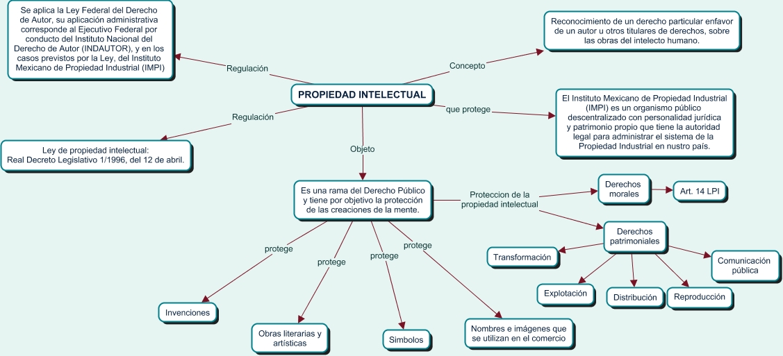 Este Cmap, tiene información relacionada con: PROPIEDAD INTELECTUAL, Derechos morales ???? Art. 14 LPI, Es una rama del Derecho Público y tiene por objetivo la protección de las creaciones de la mente. protege Obras literarias y artísticas, Derechos patrimoniales ???? Distribución, Derechos patrimoniales ???? Explotación, Derechos patrimoniales ???? Transformación, Es una rama del Derecho Público y tiene por objetivo la protección de las creaciones de la mente. Proteccion de la propiedad intelectual Derechos morales, PROPIEDAD INTELECTUAL que protege El Instituto Mexicano de Propiedad Industrial (IMPI) es un organismo público descentralizado con personalidad jurídica y patrimonio propio que tiene la autoridad legal para administrar el sistema de la Propiedad Industrial en nustro país., PROPIEDAD INTELECTUAL Regulación Ley de propiedad intelectual: Real Decreto Legislativo 1/1996, del 12 de abril., PROPIEDAD INTELECTUAL Objeto Es una rama del Derecho Público y tiene por objetivo la protección de las creaciones de la mente., Es una rama del Derecho Público y tiene por objetivo la protección de las creaciones de la mente. protege Invenciones, Derechos patrimoniales ???? Reproducción, PROPIEDAD INTELECTUAL Regulación Se aplica la Ley Federal del Derecho de Autor, su aplicación administrativa corresponde al Ejecutivo Federal por conducto del Instituto Nacional del Derecho de Autor (INDAUTOR), y en los casos previstos por la Ley, del Instituto Mexicano de Propiedad Industrial (IMPI), Derechos patrimoniales ???? Comunicación pública, Es una rama del Derecho Público y tiene por objetivo la protección de las creaciones de la mente. protege Nombres e imágenes que se utilizan en el comercio, Es una rama del Derecho Público y tiene por objetivo la protección de las creaciones de la mente. protege Simbolos, PROPIEDAD INTELECTUAL Concepto Reconocimiento de un derecho particular enfavor de un autor u otros titulares de derechos, sobre las obras del intelecto humano., Es una rama del Derecho Público y tiene por objetivo la protección de las creaciones de la mente. Proteccion de la propiedad intelectual Derechos patrimoniales