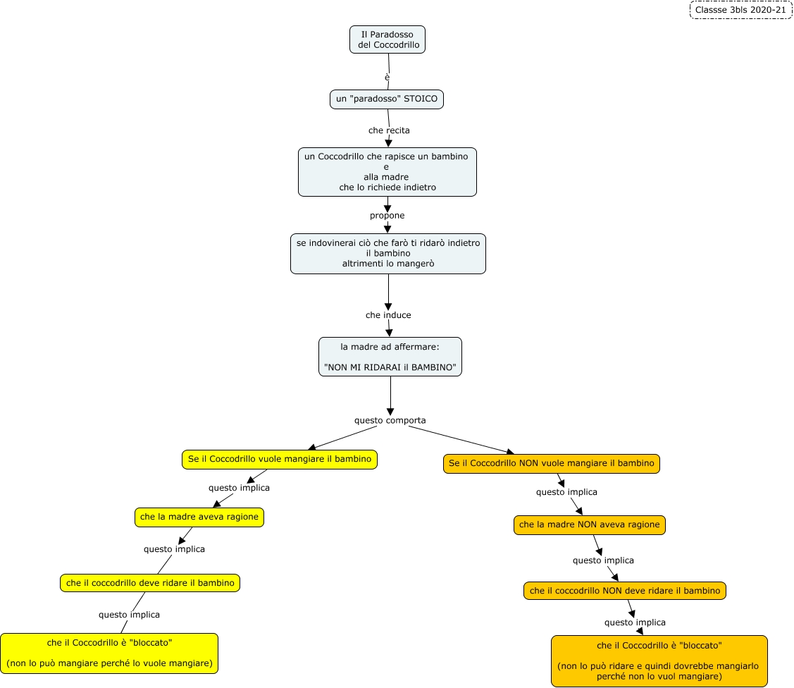 Questa Cmap, creata con IHMC CmapTools, contiene informazioni relative a: Paradosso del Coccodrillo Matteacci, un "paradosso" STOICO che recita un Coccodrillo che rapisce un bambino e alla madre che lo richiede indietro, Il Paradosso del Coccodrillo è un "paradosso" STOICO, Se il Coccodrillo NON vuole mangiare il bambino questo implica che la madre NON aveva ragione, la madre ad affermare: "NON MI RIDARAI il BAMBINO" questo comporta Se il Coccodrillo NON vuole mangiare il bambino, che la madre aveva ragione questo implica che il coccodrillo deve ridare il bambino, la madre ad affermare: "NON MI RIDARAI il BAMBINO" questo comporta Se il Coccodrillo vuole mangiare il bambino, se indovinerai ciò che farò ti ridarò indietro il bambino altrimenti lo mangerò che induce la madre ad affermare: "NON MI RIDARAI il BAMBINO", un Coccodrillo che rapisce un bambino e alla madre che lo richiede indietro propone se indovinerai ciò che farò ti ridarò indietro il bambino altrimenti lo mangerò, Se il Coccodrillo vuole mangiare il bambino questo implica che la madre aveva ragione, che la madre NON aveva ragione questo implica che il coccodrillo NON deve ridare il bambino, che il coccodrillo deve ridare il bambino questo implica che il Coccodrillo è "bloccato" (non lo può mangiare perché lo vuole mangiare), che il coccodrillo NON deve ridare il bambino questo implica che il Coccodrillo è "bloccato" (non lo può ridare e quindi dovrebbe mangiarlo perché non lo vuol mangiare)