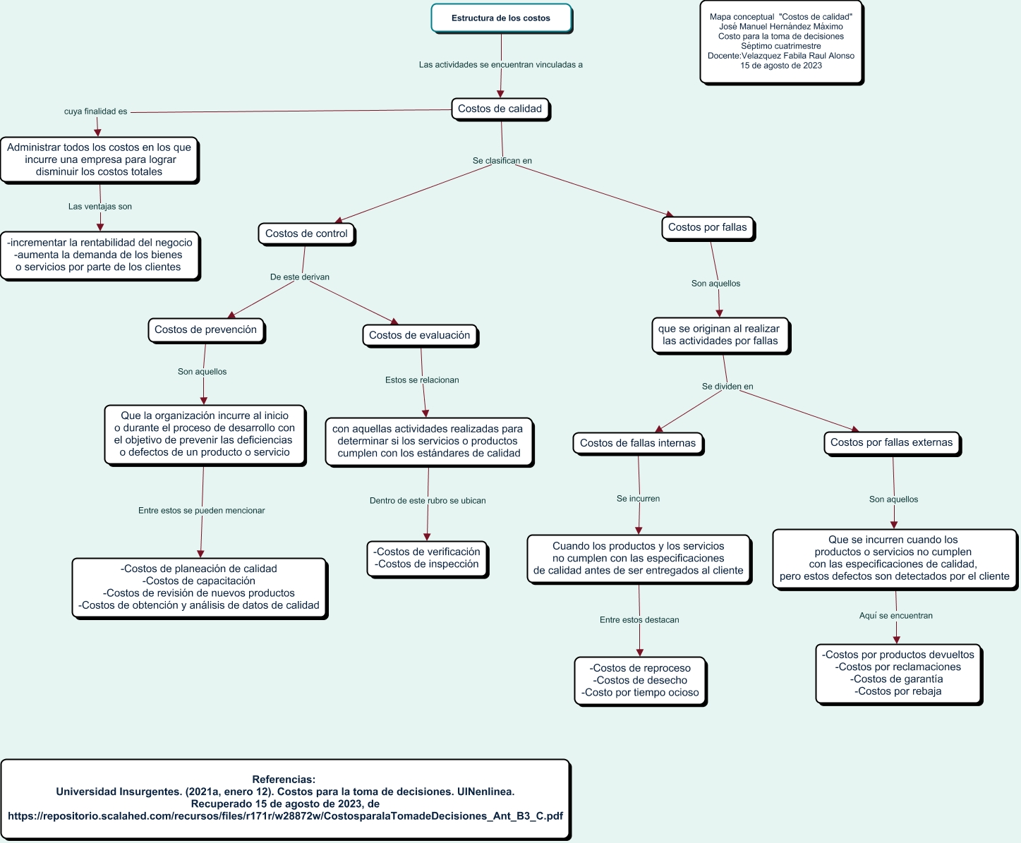 Este Cmap, tiene información relacionada con: mapa pasivo, que se originan al realizar las actividades por fallas Se dividen en Costos de fallas internas, con aquellas actividades realizadas para determinar si los servicios o productos cumplen con los estándares de calidad Dentro de este rubro se ubican -Costos de verificación -Costos de inspección, Administrar todos los costos en los que incurre una empresa para lograr disminuir los costos totales Las ventajas son -incrementar la rentabilidad del negocio -aumenta la demanda de los bienes o servicios por parte de los clientes, Costos de fallas internas Se incurren Cuando los productos y los servicios no cumplen con las especificaciones de calidad antes de ser entregados al cliente, Que se incurren cuando los productos o servicios no cumplen con las especificaciones de calidad, pero estos defectos son detectados por el cliente Aquí se encuentran -Costos por productos devueltos -Costos por reclamaciones -Costos de garantía -Costos por rebaja, Estructura de los costos Las actividades se encuentran vinculadas a Costos de calidad, que se originan al realizar las actividades por fallas Se dividen en Costos por fallas externas, Que la organización incurre al inicio o durante el proceso de desarrollo con el objetivo de prevenir las deficiencias o defectos de un producto o servicio Entre estos se pueden mencionar -Costos de planeación de calidad -Costos de capacitación -Costos de revisión de nuevos productos -Costos de obtención y análisis de datos de calidad, Costos de control De este derivan Costos de prevención, Costos de control De este derivan Costos de evaluación, Costos de calidad Se clasifican en Costos por fallas, Costos de calidad Se clasifican en Costos de control, Costos de prevención Son aquellos Que la organización incurre al inicio o durante el proceso de desarrollo con el objetivo de prevenir las deficiencias o defectos de un producto o servicio, Costos de evaluación Estos se relacionan con aquellas actividades realizadas para determinar si los servicios o productos cumplen con los estándares de calidad, Cuando los productos y los servicios no cumplen con las especificaciones de calidad antes de ser entregados al cliente Entre estos destacan -Costos de reproceso -Costos de desecho -Costo por tiempo ocioso, Costos por fallas externas Son aquellos Que se incurren cuando los productos o servicios no cumplen con las especificaciones de calidad, pero estos defectos son detectados por el cliente, Costos de calidad cuya finalidad es Administrar todos los costos en los que incurre una empresa para lograr disminuir los costos totales, Costos por fallas Son aquellos que se originan al realizar las actividades por fallas