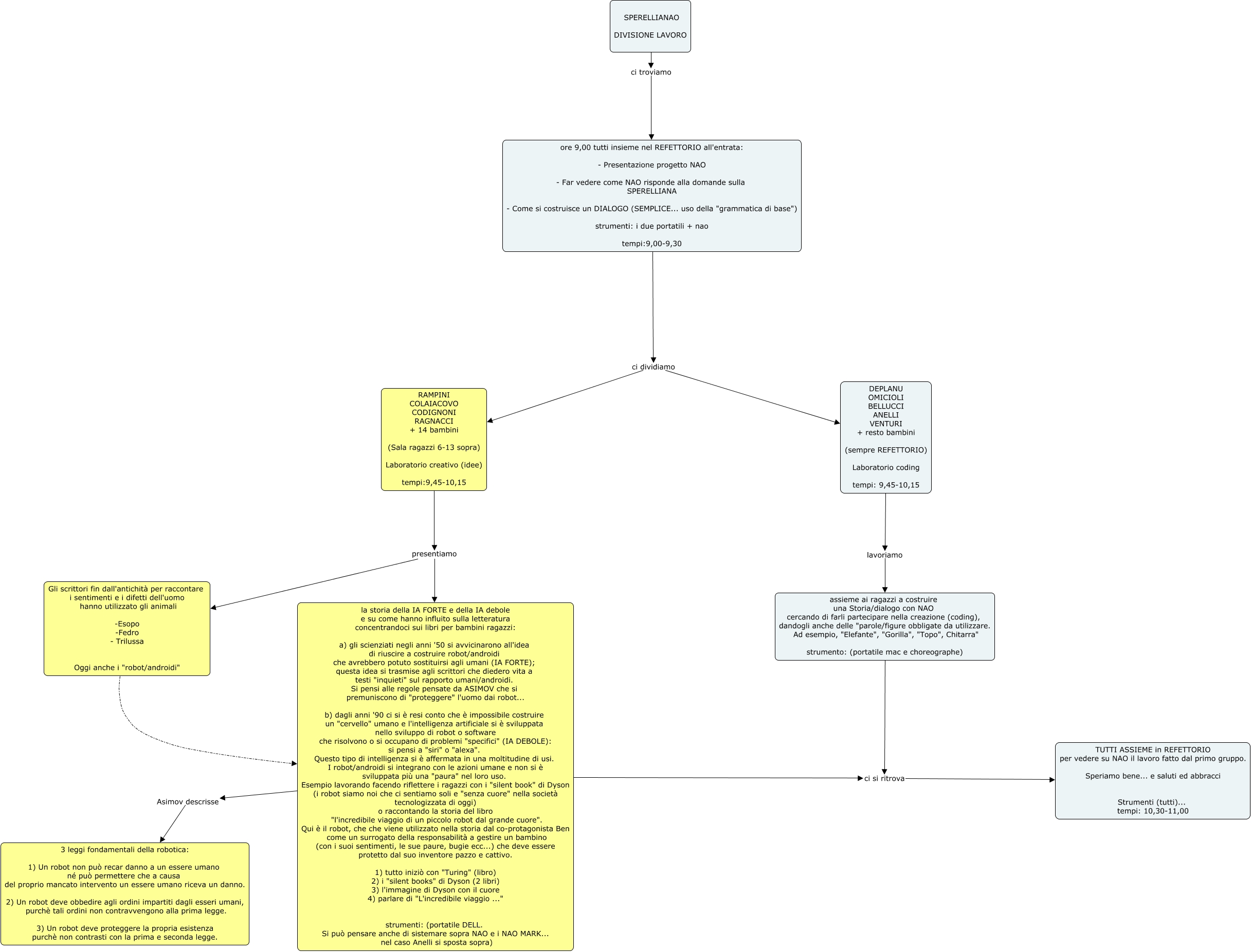 Questa Cmap, creata con IHMC CmapTools, contiene informazioni relative a: ia sperellianao, SPERELLIANAO DIVISIONE LAVORO ci troviamo ore 9,00 tutti insieme nel REFETTORIO all'entrata: - Presentazione progetto NAO - Far vedere come NAO risponde alla domande sulla SPERELLIANA - Come si costruisce un DIALOGO (SEMPLICE... uso della "grammatica di base") strumenti: i due portatili + nao tempi:9,00-9,30, DEPLANU OMICIOLI BELLUCCI ANELLI VENTURI + resto bambini (sempre REFETTORIO) Laboratorio coding tempi: 9,45-10,15 lavoriamo assieme ai ragazzi a costruire una Storia/dialogo con NAO cercando di farli partecipare nella creazione (coding), dandogli anche delle "parole/figure obbligate da utilizzare. Ad esempio, "Elefante", "Gorilla", "Topo", Chitarra" strumento: (portatile mac e choreographe), RAMPINI COLAIACOVO CODIGNONI RAGNACCI + 14 bambini (Sala ragazzi 6-13 sopra) Laboratorio creativo (idee) tempi:9,45-10,15 presentiamo la storia della IA FORTE e della IA debole e su come hanno influito sulla letteratura concentrandoci sui libri per bambini ragazzi: a) gli scienziati negli anni '50 si avvicinarono all'idea di riuscire a costruire robot/androidi che avrebbero potuto sostituirsi agli umani (IA FORTE); questa idea si trasmise agli scrittori che diedero vita a testi "inquieti" sul rapporto umani/androidi. Si pensi alle regole pensate da ASIMOV che si premuniscono di "proteggere" l'uomo dai robot... b) dagli anni '90 ci si è resi conto che è impossibile costruire un "cervello" umano e l'intelligenza artificiale si è sviluppata nello sviluppo di robot o software che risolvono o si occupano di problemi "specifici" (IA DEBOLE): si pensi a "siri" o "alexa". Questo tipo di intelligenza si è affermata in una moltitudine di usi. I robot/androidi si integrano con le azioni umane e non si è sviluppata più una "paura" nel loro uso. Esempio lavorando facendo riflettere i ragazzi con i "silent book" di Dyson (i robot siamo noi che ci sentiamo soli e "senza cuore" nella società tecnologizzata di oggi) o raccontando la storia del libro "l'incredibile viaggio di un piccolo robot dal grande cuore". Qui è il robot, che che viene utilizzato nella storia dal co-protagonista Ben come un surrogato della responsabilità a gestire un bambino (con i suoi sentimenti, le sue paure, bugie ecc...) che deve essere protetto dal suo inventore pazzo e cattivo. 1) tutto iniziò con "Turing" (libro) 2) i "silent books" di Dyson (2 libri) 3) l'immagine di Dyson con il cuore 4) parlare di "L'incredibile viaggio ..." strumenti: (portatile DELL. Si può pensare anche di sistemare sopra NAO e i NAO MARK... nel caso Anelli si sposta sopra), RAMPINI COLAIACOVO CODIGNONI RAGNACCI + 14 bambini (Sala ragazzi 6-13 sopra) Laboratorio creativo (idee) tempi:9,45-10,15 presentiamo Gli scrittori fin dall'antichità per raccontare i sentimenti e i difetti dell'uomo hanno utilizzato gli animali -Esopo -Fedro - Trilussa Oggi anche i "robot/androidi", assieme ai ragazzi a costruire una Storia/dialogo con NAO cercando di farli partecipare nella creazione (coding), dandogli anche delle "parole/figure obbligate da utilizzare. Ad esempio, "Elefante", "Gorilla", "Topo", Chitarra" strumento: (portatile mac e choreographe) ci si ritrova TUTTI ASSIEME in REFETTORIO per vedere su NAO il lavoro fatto dal primo gruppo. Speriamo bene... e saluti ed abbracci Strumenti (tutti)... tempi: 10,30-11,00, Gli scrittori fin dall'antichità per raccontare i sentimenti e i difetti dell'uomo hanno utilizzato gli animali -Esopo -Fedro - Trilussa Oggi anche i "robot/androidi" la storia della IA FORTE e della IA debole e su come hanno influito sulla letteratura concentrandoci sui libri per bambini ragazzi: a) gli scienziati negli anni '50 si avvicinarono all'idea di riuscire a costruire robot/androidi che avrebbero potuto sostituirsi agli umani (IA FORTE); questa idea si trasmise agli scrittori che diedero vita a testi "inquieti" sul rapporto umani/androidi. Si pensi alle regole pensate da ASIMOV che si premuniscono di "proteggere" l'uomo dai robot... b) dagli anni '90 ci si è resi conto che è impossibile costruire un "cervello" umano e l'intelligenza artificiale si è sviluppata nello sviluppo di robot o software che risolvono o si occupano di problemi "specifici" (IA DEBOLE): si pensi a "siri" o "alexa". Questo tipo di intelligenza si è affermata in una moltitudine di usi. I robot/androidi si integrano con le azioni umane e non si è sviluppata più una "paura" nel loro uso. Esempio lavorando facendo riflettere i ragazzi con i "silent book" di Dyson (i robot siamo noi che ci sentiamo soli e "senza cuore" nella società tecnologizzata di oggi) o raccontando la storia del libro "l'incredibile viaggio di un piccolo robot dal grande cuore". Qui è il robot, che che viene utilizzato nella storia dal co-protagonista Ben come un surrogato della responsabilità a gestire un bambino (con i suoi sentimenti, le sue paure, bugie ecc...) che deve essere protetto dal suo inventore pazzo e cattivo. 1) tutto iniziò con "Turing" (libro) 2) i "silent books" di Dyson (2 libri) 3) l'immagine di Dyson con il cuore 4) parlare di "L'incredibile viaggio ..." strumenti: (portatile DELL. Si può pensare anche di sistemare sopra NAO e i NAO MARK... nel caso Anelli si sposta sopra), ore 9,00 tutti insieme nel REFETTORIO all'entrata: - Presentazione progetto NAO - Far vedere come NAO risponde alla domande sulla SPERELLIANA - Come si costruisce un DIALOGO (SEMPLICE... uso della "grammatica di base") strumenti: i due portatili + nao tempi:9,00-9,30 ci dividiamo RAMPINI COLAIACOVO CODIGNONI RAGNACCI + 14 bambini (Sala ragazzi 6-13 sopra) Laboratorio creativo (idee) tempi:9,45-10,15, la storia della IA FORTE e della IA debole e su come hanno influito sulla letteratura concentrandoci sui libri per bambini ragazzi: a) gli scienziati negli anni '50 si avvicinarono all'idea di riuscire a costruire robot/androidi che avrebbero potuto sostituirsi agli umani (IA FORTE); questa idea si trasmise agli s