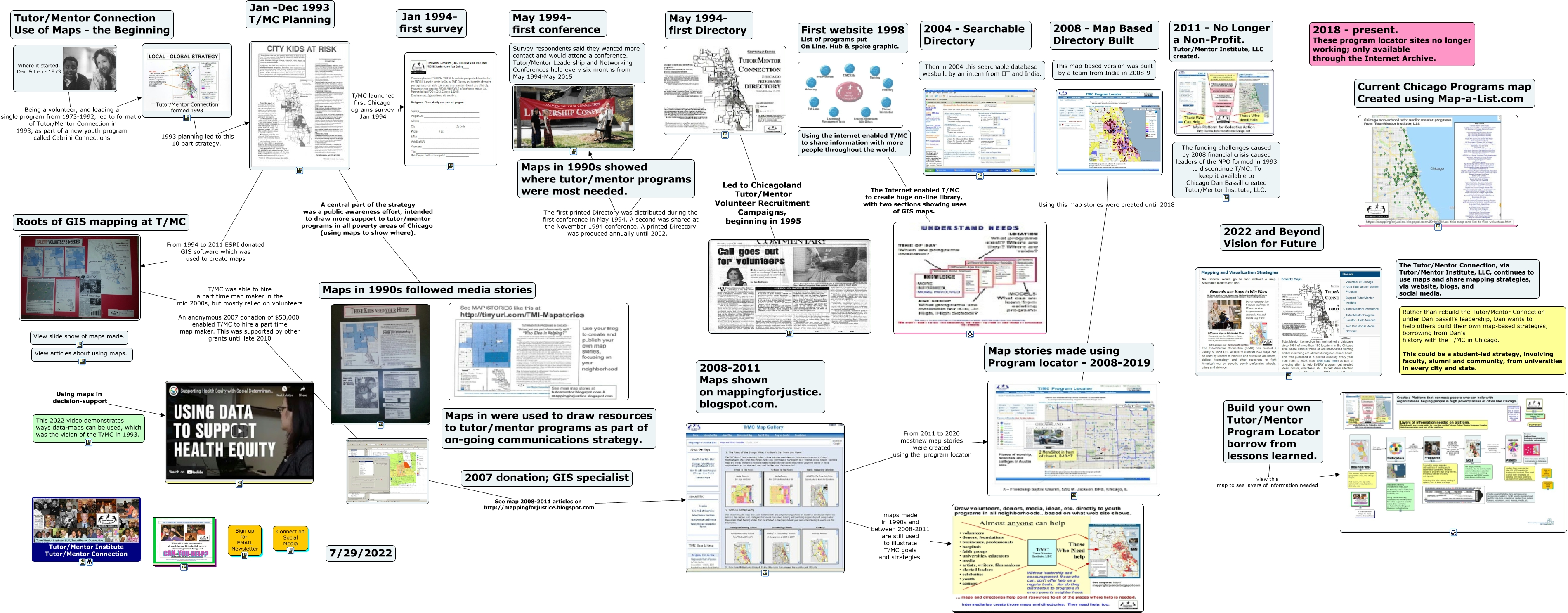 This Concept Map, created with IHMC CmapTools, has information related to: TMC History of Using Maps, From 2011 to 2020 mostnew map stories were created using the program locator, The Internet enabled T/MC to create huge on-line library, with two sections showing uses of GIS maps., T/MC launched first Chicago programs survey in Jan 1994, Tutor/Mentor Connection formed 1993 1993 planning led to this 10 part strategy., A central part of the strategy was a public awareness effort, intended to draw more support to tutor/mentor programs in all poverty areas of Chicago (using maps to show where). Maps in 1990s followed media stories, The first printed Directory was distributed during the first conference in May 1994. A second was shared at the November 1994 conference. A printed Directory was produced annually until 2002., See map 2008-2011 articles on http://mappingforjustice.blogspot.com, Led to Chicagoland Tutor/Mentor Volunteer Recruitment Campaigns, beginning in 1995, ???? T/MC was able to hire a part time map maker in the mid 2000s, but mostly relied on volunteers An anonymous 2007 donation of $50,000 enabled T/MC to hire a part time map maker. This was supported by other grants until late 2010, ???? Using this map stories were created until 2018, maps made in 1990s and between 2008-2011 are still used to illustrate T/MC goals and strategies., Where it started. Dan & Leo - 1973 Being a volunteer, and leading a single program from 1973-1992, led to formation of Tutor/Mentor Connection in 1993, as part of a new youth program called Cabrini Connections. Tutor/Mentor Connection formed 1993, From 1994 to 2011 ESRI donated GIS software which was used to create maps ????, Build your own Tutor/Mentor Program Locator borrow from lessons learned. view this map to see layers of information needed, ???? Using maps in decision-support