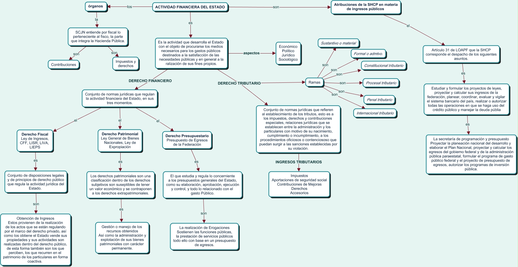 Este Cmap, tiene información relacionada con: ACTIVIDAD FINANCIERA DEL ESTADO, Derecho Presupuestario Presupuesto de Egresos de la Federación es El que estudia y regula lo concerniente a los presupuestos generales del Estado, como su elaboración, aprobación, ejecución y control, y todo lo relacionado con el gasto Público., Ramas son Penal tributario, Derecho Fiscal Ley de Ingresos, CFF, LISR, LIVA, LIEPS es Conjunto de disposiciones legales y de principios de derecho público que regula la actividad jurídica del Estado., ACTIVIDAD FINANCIERA DEL ESTADO es Es la actividad que desarrolla el Estado con el objeto de procurarse los medios necesarios para los gastos públicos destinados a la satisfacción de las necesidades públicas y en general a la ralización de sus fines propios., Ramas son Constitucional tributario, Estudiar y formular los proyectos de leyes, proyectar y calcular sus ingresos de la federación, planear, coordinar, evaluar y vigilar el sistema bancario del país, realizar o autorizar todas las operaciones en que se haga uso del crédito público y manejar la deuda públia es La secretaría de programación y presupuesto Proyectar la planeación nacional del desarrollo y elaborar el Plan Nacional, proyectar y calcular los egresos del gobierno federal y de la administración pública paraestatal, formular el programa de gasto público federal y el proyecto de presupuesto de egresos, autorizar los programas de inversión pública., Conjunto de disposiciones legales y de principios de derecho público que regula la actividad jurídica del Estado. son Obtención de Ingresos Estos provienen de la realización de los actos que se están regulando por el marco del derecho privado, así como los obtiene el Estado vende sus propiedades y sus actividades son realizadas dentro del derecho público, de esta forma también son los que perciben, los que recurren en el patrimonio de los particulares en forma coactiva., Conjunto de normas jurídicas que regulan la actividad financiera del Estado, en sus tres momentos. el Derecho Fiscal Ley de Ingresos, CFF, LISR, LIVA, LIEPS, Es la actividad que desarrolla el Estado con el objeto de procurarse los medios necesarios para los gastos públicos destinados a la satisfacción de las necesidades públicas y en general a la ralización de sus fines propios. DERECHO TRIBUTARIO Conjunto de normas jurídicas que refieren al establecimiento de los tributos, esto es a los impuestos, derechos y contribuciones especiales, relaciones jurídicas que se establecen entre la administración y los particulares con motivo de su nacimiento, cumplimiento o incumplimiento, a los procedimientos oficiosos o contenciososo que puedan surgir a las sanciones establecidas por su violación., Es la actividad que desarrolla el Estado con el objeto de procurarse los medios necesarios para los gastos públicos destinados a la satisfacción de las necesidades públicas y en general a la ralización de sus fines propios. aspectos Económico Político Jurídico Sociológico, Derecho Patrimonial Ley General de Bienes Nacionales, Ley de Expropiación es Los derechos patrimoniales son una clasificación dentro de los derechos subjetivos son suseptibles de tener un valor económico y se contraponen a los derechos extrapatrimoniales., Conjunto de normas jurídicas que refieren al establecimiento de los tributos, esto es a los impuestos, derechos y contribuciones especiales, relaciones jurídicas que se establecen entre la administración y los particulares con motivo de su nacimiento, cumplimiento o incumplimiento, a los procedimientos oficiosos o contenciososo que puedan surgir a las sanciones establecidas por su violación. INGRESOS TRIBUTARIOS Impuestos Aportaciones de seguridad social Contribuciones de Mejoras Derechos Accesorios, Ramas son Formal o admtvo., Ramas son Sustantivo o material, Ramas son Procesal tributario, Conjunto de normas jurídicas que regulan la actividad financiera del Estado, en sus tres momentos. el Derecho Patrimonial Ley General de Bienes Nacionales, Ley de Expropiación, SCJN entiende por fiscal lo perteneciente al fisco, la parte que integra la Hacienda Pública. son Contribuciones, ACTIVIDAD FINANCIERA DEL ESTADO los órganos, Ramas son Internacional tributario, Es la actividad que desarrolla el Estado con el objeto de procurarse los medios necesarios para los gastos públicos destinados a la satisfacción de las necesidades públicas y en general a la ralización de sus fines propios. DERECHO FINANCIERO Conjunto de normas jurídicas que regulan la actividad financiera del Estado, en sus tres momentos.