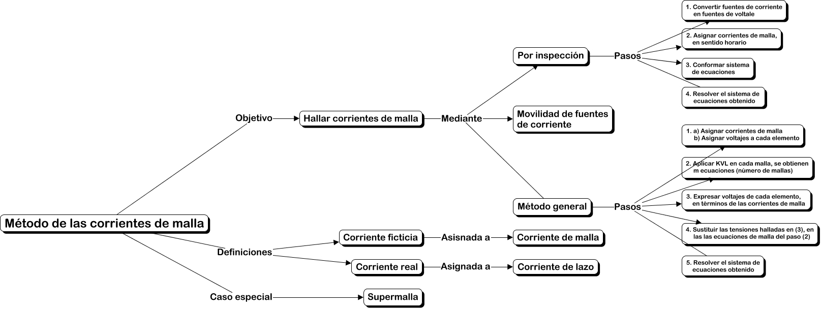 Este Cmap, tiene información relacionada con: Corrientes de malla_Horizontal, Método de las corrientes de malla Objetivo Hallar corrientes de malla, Método general Pasos 3. Expresar voltajes de cada elemento, en términos de las corrientes de malla, Método de las corrientes de malla Definiciones Corriente ficticia, Corriente real Asignada a Corriente de lazo, Método general Pasos 5. Resolver el sistema de ecuaciones obtenido, Por inspección Pasos 3. Conformar sistema de ecuaciones, Corriente ficticia Asisnada a Corriente de malla, Método de las corrientes de malla Definiciones Corriente real, Hallar corrientes de malla Mediante Movilidad de fuentes de corriente, Por inspección Pasos 2. Asignar corrientes de malla, en sentido horario, Método general Pasos 1. a) Asignar corrientes de malla b) Asignar voltajes a cada elemento, Hallar corrientes de malla Mediante Por inspección, Por inspección Pasos 1. Convertir fuentes de corriente en fuentes de voltale, Hallar corrientes de malla Mediante Método general, Método general Pasos 2. Aplicar KVL en cada malla, se obtienen m ecuaciones (número de mallas), Por inspección Pasos 4. Resolver el sistema de ecuaciones obtenido, Método de las corrientes de malla Caso especial Supermalla, Método general Pasos 4. Sustituir las tensiones halladas en (3), en las las ecuaciones de malla del paso (2)