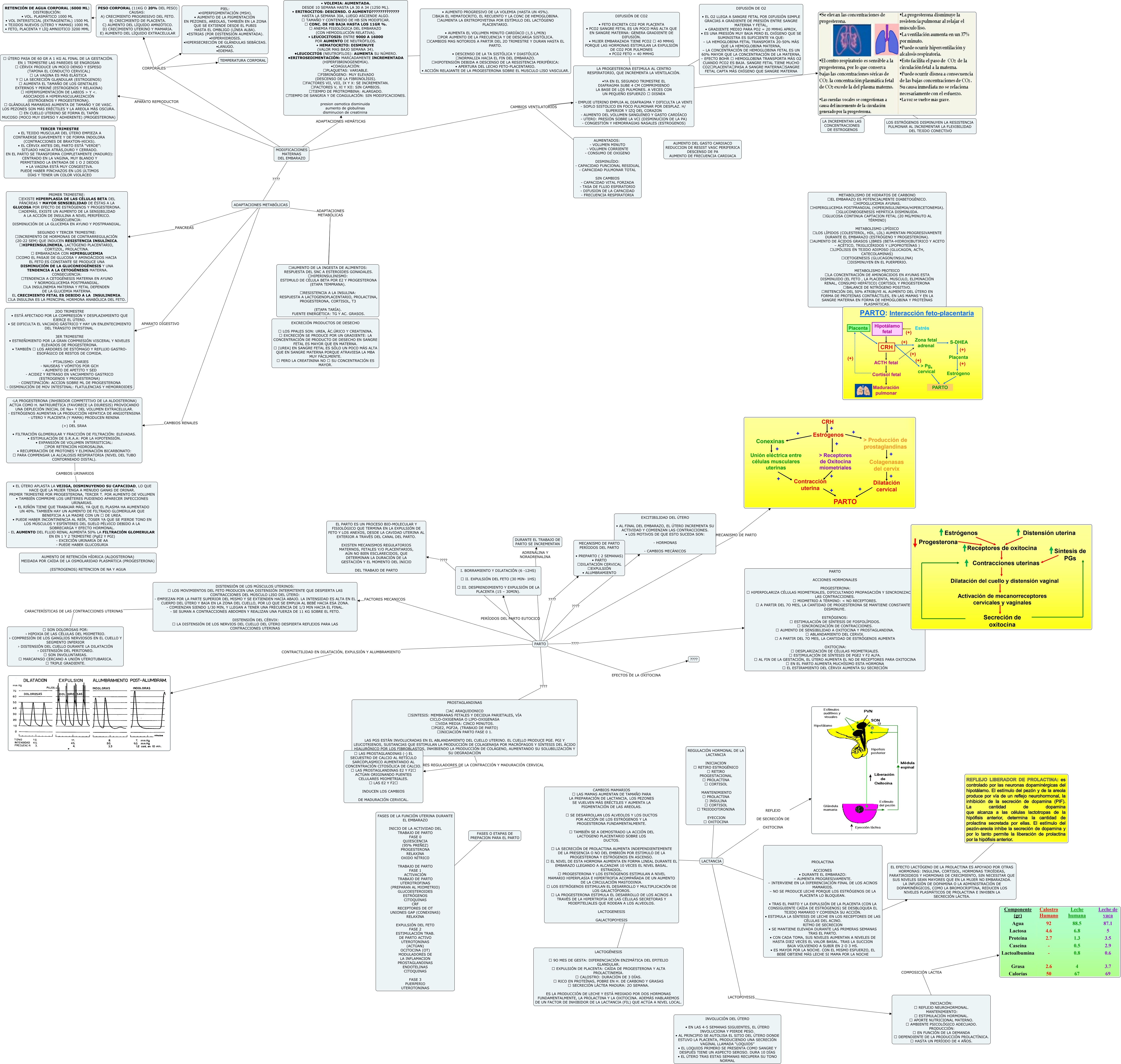 Este Cmap, tiene información relacionada con: PARTO Y LACTANCIA (MODIFICACIONES MATERNAS DEL EMBARAZO) COPIA, -LA PROGESTERONA (INHIBIDOR COMPETITIVO DE LA ALDOSTERONA) ACTÚA COMO H. NATRIURÉTICA (FAVORECE LA DIURESIS) PROVOCANDO UNA DEPLECIÓN INICIAL DE Na+ Y DEL VOLUMEN EXTRACELULAR. - ESTRÓGENOS AUMENTAN LA PRODUCCIÓN HEPATICA DE ANGIOTENSINA - UTERO Y PLACENTA (Y MAMA) PRODUCEN RENINA ⇓ (+) DEL SRAA • FILTRACIÓN GLOMERULAR Y FRACCIÓN DE FILTRACIÓN: ELEVADAS. • ESTIMULACIÓN DE S.R.A.A: POR LA HIPOTENSIÓN. • EXPANSIÓN DE VOLUMEN INTERSITICIAL: POR RETENCIÓN HIDROSALINA. • RECUPERACIÓN DE PROTONES Y ELIMINACIÓN BICARBONATO: PARA COMPENSAR LA ALCALOSIS RESPIRATORIA (NIVEL DEL TUBO CONTORNEADO DISTAL). CAMBIOS URINARIOS • EL ÚTERO APLASTA LA VEJIGA, DISMINUYENDO SU CAPACIDAD, LO QUE HACE QUE LA MUJER TENGA A MENUDO GANAS DE ORINAR. PRIMER TRIMESTRE POR PROGESTERONA, TERCER T. POR AUMENTO DE VOLUMEN • TAMBIÉN COMPRIME LOS URÉTERES PUDIENDO APARECER INFECCIONES URINARIAS. • EL RIÑÓN TIENE QUE TRABAJAR MÁS, YA QUE EL PLASMA HA AUMENTADO UN 40%. TAMBIÉN HAY UN AUMENTO DE FILTRADO GLOMERULAR QUE BENEFICIA A LA MADRE CON UN DE UREA. • PUEDE HABER INCONTINENCIA AL REÍR, TOSER YA QUE SE PIERDE TONO EN LOS MÚSCULOS Y ESFÍNTERES DEL SUELO PÉLVICO DEBIDO A LA SOBRECARGA Y EFECTO HORMONAL. - EL AUMENTO DEL FLUJO RENAL AUMENTA 50% LA FILTRACIÓN GLOMERULAR EN EN 1 Y 2 TRIMESTRE (PgE2 Y PGI) - EXCECIÓN URINARIA DE AA - PUEDE HABER GLUCOSURIA, LACTANCIA ???? PROLACTINA ACCIONES • DURANTE EL EMBARAZO: – AUMENTA PROGRESIVAMENTE. – INTERVIENE EN LA DIFERENCIACIÓN FINAL DE LOS ACINOS MAMARIOS. – NO SE PRODUCE LECHE PORQUE LOS ESTRÓGENOS DE LA PLACENTA LO BLOQUEAN. • TRAS EL PARTO Y LA EXPULSIÓN DE LA PLACENTA (CON LA CONSIGUIENTE CAÍDA DE ESTRÓGENOS) SE DESBLOQUEA EL TEJIDO MAMARIO Y COMIENZA SU ACCIÓN. • ESTIMULA LA SÍNTESIS DE LECHE EN LOS RECEPTORES DE LAS CÉLULAS DEL ACINO. RITMO DE SECRECION • SE MANTIENE ELEVADA DURANTE LAS PRIMERAS SEMANAS TRAS EL PARTO. • CON CADA TOMA, SUS NIVELES AUMENTAN A NIVELES DE HASTA DIEZ VECES EL VALOR BASAL. TRAS LA SUCCION BAJA VOLVIENDO A SUBIR EN 2 O 3 HS. • ES MAYOR POR LA NOCHE. CON EL MISMO ESFUERZO, EL BEBÉ OBTIENE MÁS LECHE SI MAMA POR LA NOCHE, PARTO MECANISMO DE PARTO, MODIFICACIONES MATERNAS DEL EMBARAZO ???? ADAPTACIONES METABÓLICAS, ???? LA INCREMENTAN LAS CONCENTRACIONES DE ESTROGENOS, PARTO ???? EXCITIBILIDAD DEL ÚTERO • AL FINAL DEL EMBARAZO, EL ÚTERO INCREMENTA SU ACTIVIDAD Y COMIENZAN LAS CONTRACCIONES. • LOS MOTIVOS DE QUE ESTO SUCEDA SON: - HORMONAS - CAMBIOS MECÁNICOS, LACTANCIA ???? CAMBIOS MAMARIOS LAS MAMAS AUMENTAN DE TAMAÑO PARA LA PREPARACIÓN DE LACTANCIA, LOS PEZONES SE VUELVEN MÁS ERÉCTILES Y AUMENTA LA PIGMENTACIÓN DE LAS AREOLAS. SE DESARROLLAN LOS ALVEOLOS Y LOS DUCTOS POR ACCIÓN DE LOS ESTRÓGENOS Y LA PROGESTERONA FUNDAMENTALMENTE. TAMBIÉN SE A DEMOSTRADO LA ACCIÓN DEL LACTOGENO PLACENTARIO SOBRE LOS DUCTOS. LA SECRECIÓN DE PROLACTINA AUMENTA INDEPENDIENTEMENTE DE LA PRESENCIA O NO DEL EMBRIÓN POR ESTIMULO DE LA PROGESTERONA Y ESTRÓGENOS EN ASCENSO. EL NIVEL DE ESTA HORMONA AUMENTA EN FORMA LINEAL DURANTE EL EMBARAZO LLEGANDO A ALCANZAR 10 VECES EL NIVEL BASAL. ESTRADIOL. PROGESTERONA Y LOS ESTRÓGENOS ESTIMULAN A NIVEL MAMARIO HIPERPLASIA E HIPERTROFIA ACOMPAÑADA DE UN AUMENTO DE LA CIRCULACIÓN MASTODINIA. LOS ESTRÓGENOS ESTIMULAN EL DESARROLLO Y MULTIPLICACIÓN DE LOS GALACTÓFOROS. LA PROGESTERONA ESTIMULA EL DESARROLLO DE LOS ACINOS A TRAVÉS DE LA HIPERTROFIA DE LAS CÉLULAS SECRETORAS Y MIOEPITELIALES QUE RODEAN A LOS ALVEOLOS. LACTOGENESIS GALACTOPOYESIS, ADAPTACIONES METABÓLICAS ADAPTACIONES METABÓLICAS EXCRECIÓN PRODUCTOS DE DESECHO LOS PPALES SON: UREA, ÁC.ÚRICO Y CREATININA. EXCRECIÓN SE PRODUCE POR UN GRADIENTE: LA CONCENTRACIÓN DE PRODUCTO DE DESECHO EN SANGRE FETAL ES MAYOR QUE EN MATERNA. [UREA] EN SANGRE FETAL ES SÓLO UN POCO MÁS ALTA QUE EN SANGRE MATERNA PORQUE ATRAVIESA LA MBA MUY FÁCILMENTE. PERO LA CREATININA NO SU CONCENTRACIÓN ES MAYOR., LA PROGESTERONA ESTIMULA AL CENTRO RESPIRATORIO, QUE INCREMENTA LA VENTILACIÓN. •YA EN EL SEGUNDO TRIMESTRE EL DIAFRAGMA SUBE 4 CM COMPRIMIENDO LA BASE DE LOS PULMONES. A VECES CON UN PEQUEÑO ESFUERZO DISNEA - EMPUJE UTERINO EMPUJA AL DIAFRAGMA Y DIFICULTA LA VENTI - SOPLO SISTOLICO EN FOCO PULMONAR POR DESPLAZ. H/ SUPERIOR Y IZQ DEL CORAZON - AUMENTO DEL VOLUMEN SANGUÍNEO Y GASTO CARDÍACO - UTERO: PRESIÓN SOBRE LA VCI (DISMINUCION DE LA PA) - CONGESTIÓN Y HEMORRAGIAS NASALES (ESTROGENOS) ???? DIFUSIÓN DE CO2 • FETO EXCRETA CO2 POR PLACENTA • PCO2 SANGRE FETAL ES UN POCO MÁS ALTA QUE EN SANGRE MATERNA: GENERA GRADIENTE DE DIFUSIÓN. • MUJER EMBARAZADA TIENE PCO2 40 MMHG PORQUE LAS HORMONAS ESTIMULAN LA EXPULSIÓN DE CO2 POR PULMONES • PCO2 FETO = 40 MMHG, MODIFICACIONES MATERNAS DEL EMBARAZO CAMBIOS VENTILATORIOS, MODIFICACIONES MATERNAS DEL EMBARAZO CAMBIOS VENTILATORIOS LA PROGESTERONA ESTIMULA AL CENTRO RESPIRATORIO, QUE INCREMENTA LA VENTILACIÓN. •YA EN EL SEGUNDO TRIMESTRE EL DIAFRAGMA SUBE 4 CM COMPRIMIENDO LA BASE DE LOS PULMONES. A VECES CON UN PEQUEÑO ESFUERZO DISNEA - EMPUJE UTERINO EMPUJA AL DIAFRAGMA Y DIFICULTA LA VENTI - SOPLO SISTOLICO EN FOCO PULMONAR POR DESPLAZ. H/ SUPERIOR Y IZQ DEL CORAZON - AUMENTO DEL VOLUMEN SANGUÍNEO Y GASTO CARDÍACO - UTERO: PRESIÓN SOBRE LA VCI (DISMINUCION DE LA PA) - CONGESTIÓN Y HEMORRAGIAS NASALES (ESTROGENOS), LACTANCIA REFLEJO DE SECRECIÓN DE OXITOCINA, ADAPTACIONES METABÓLICAS APARATO DIGESTIVO 2DO TRIMESTRE • ESTÁ AFECTADO POR LA COMPRESIÓN Y DESPLAZAMIENTO QUE EJERCE EL ÚTERO. • SE DIFICULTA EL VACIADO GÁSTRICO Y HAY UN ENLENTECIMIENTO DEL TRÁNSITO INTESTINAL 3ER TRIMESTRE • ESTREÑIMIENTO POR LA GRAN COMPRESIÓN VISCERAL Y NIVELES ELEVADOS DE PROGESTERONA. • TAMBIÉN LOS ARDORES DE ESTÓMAGO Y REFLUJO GASTRO- ESOFÁGICO DE RESTOS DE COMIDA. - PTIALISMO: CARIES - NAUSEAS Y VÓMITOS POR G