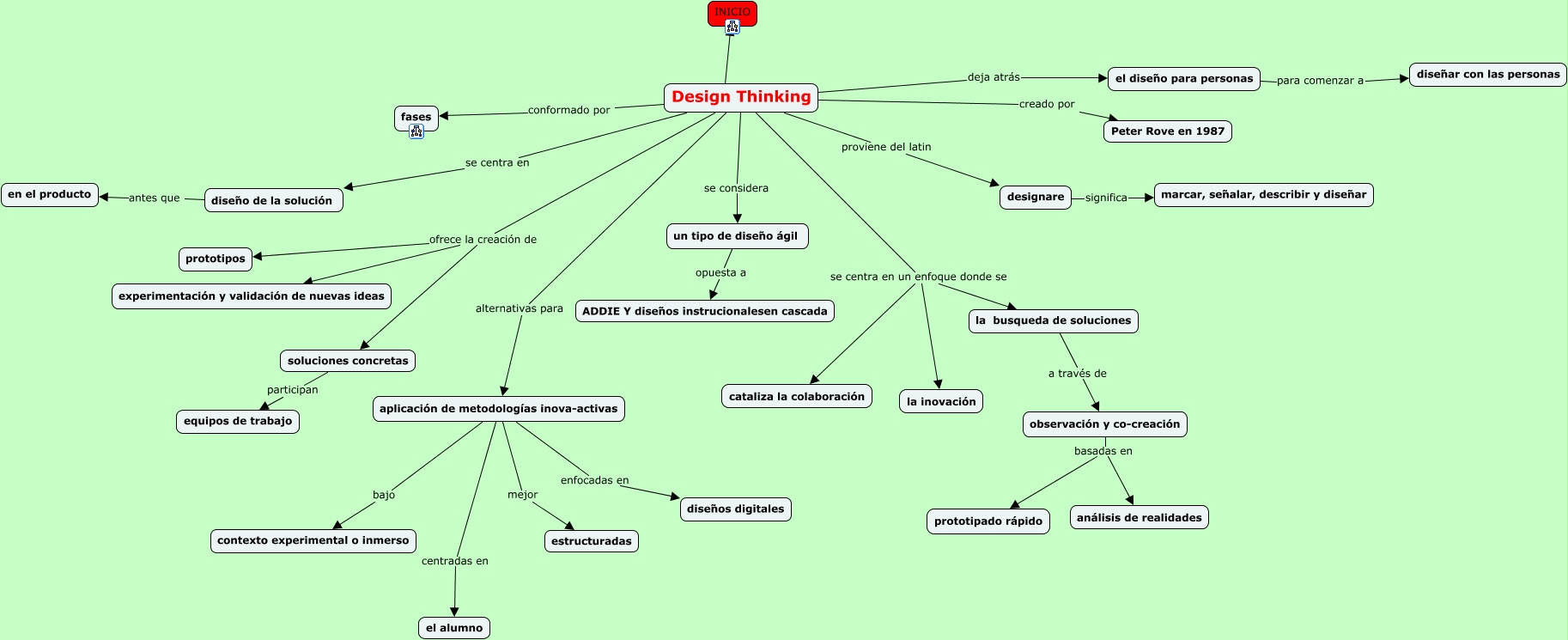 Este Cmap, tiene información relacionada con: Design Thinking, Design Thinking proviene del latin designare, observación y co-creación basadas en prototipado rápido, aplicación de metodologías inova-activas mejor estructuradas, Design Thinking creado por Peter Rove en 1987, la busqueda de soluciones a través de observación y co-creación, Design Thinking ofrece la creación de soluciones concretas, Design Thinking deja atrás el diseño para personas, Design Thinking ???? INICIO, Design Thinking alternativas para aplicación de metodologías inova-activas, Design Thinking conformado por fases, designare significa marcar, señalar, describir y diseñar, un tipo de diseño ágil opuesta a ADDIE Y diseños instrucionalesen cascada, diseño de la solución antes que en el producto, aplicación de metodologías inova-activas enfocadas en diseños digitales, Design Thinking se centra en un enfoque donde se la busqueda de soluciones, soluciones concretas participan equipos de trabajo, Design Thinking se centra en diseño de la solución, observación y co-creación basadas en análisis de realidades, aplicación de metodologías inova-activas bajo contexto experimental o inmerso, Design Thinking se centra en un enfoque donde se cataliza la colaboración
