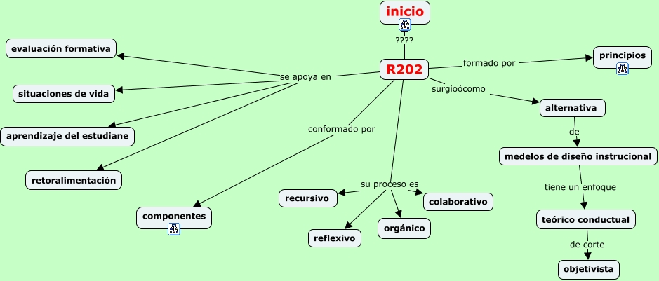 Este Cmap, tiene información relacionada con: R202, R202 se apoya en retoralimentación, R202 ???? inicio, R202 su proceso es orgánico, R202 su proceso es recursivo, R202 se apoya en situaciones de vida, teórico conductual de corte objetivista, R202 surgioócomo alternativa, R202 formado por principios, R202 su proceso es colaborativo, R202 conformado por componentes, R202 se apoya en evaluación formativa, medelos de diseño instrucional tiene un enfoque teórico conductual, alternativa de medelos de diseño instrucional, R202 se apoya en aprendizaje del estudiane, R202 su proceso es reflexivo