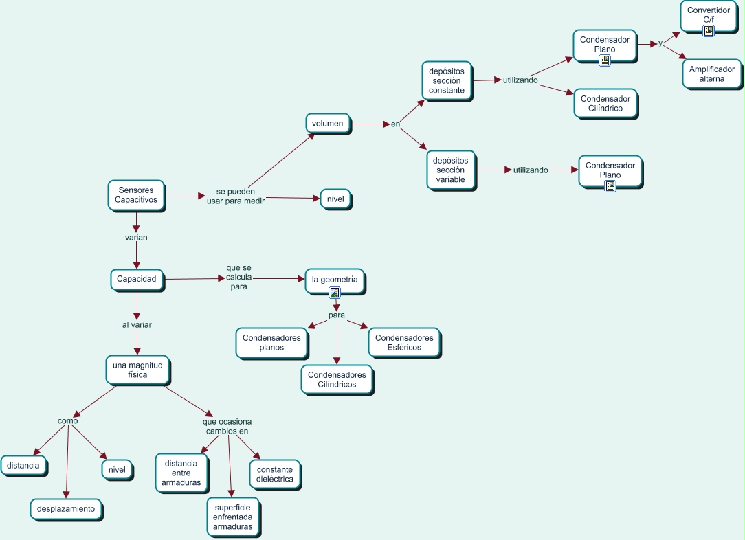 Este Cmap, tiene información relacionada con: 1.- Sensores Capacitivos, la geometría para Condensadores planos, Capacidad que se calcula para la geometría, depósitos sección constante utilizando Condensador Cilíndrico, una magnitud física que ocasiona cambios en superficie enfrentada armaduras, depósitos sección constante utilizando Condensador Plano, Capacidad al variar una magnitud física, Sensores Capacitivos se pueden usar para medir volumen, depósitos sección variable utilizando Condensador Plano, Sensores Capacitivos varian Capacidad, Condensador Plano y Convertidor C/f, la geometría para Condensadores Cilíndricos, una magnitud física que ocasiona cambios en constante dieléctrica, una magnitud física como desplazamiento, volumen en depósitos sección constante, volumen en depósitos sección variable, una magnitud física que ocasiona cambios en distancia entre armaduras, una magnitud física como nivel, la geometría para Condensadores Esféricos, Condensador Plano y Amplificador alterna, Sensores Capacitivos se pueden usar para medir nivel