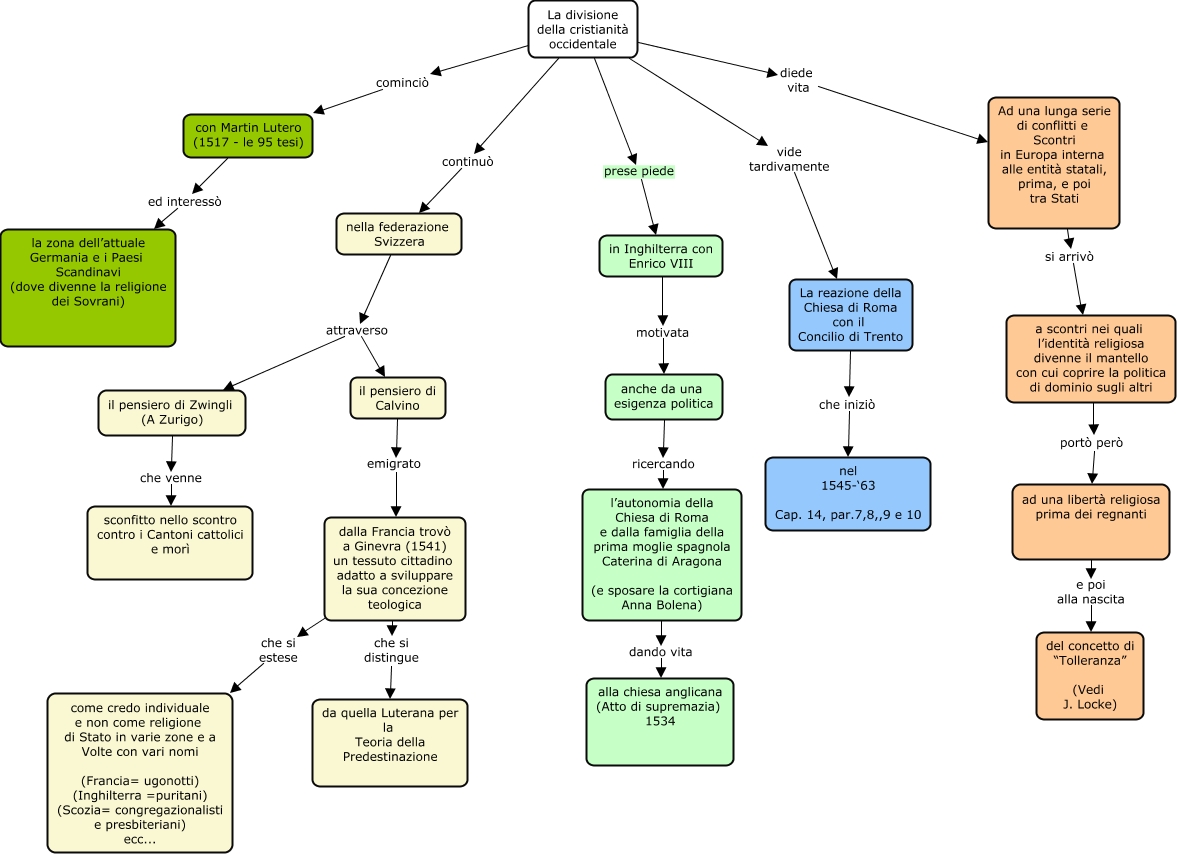 Questa Cmap, creata con IHMC CmapTools, contiene informazioni relative a: Divisione della cristianità, con Martin Lutero (1517 - le 95 tesi) ed interessò la zona dell’attuale Germania e i Paesi Scandinavi (dove divenne la religione dei Sovrani), La divisione della cristianità occidentale continuò nella federazione Svizzera, dalla Francia trovò a Ginevra (1541) un tessuto cittadino adatto a sviluppare la sua concezione teologica che si distingue da quella Luterana per la Teoria della Predestinazione, nella federazione Svizzera attraverso il pensiero di Calvino, il pensiero di Zwingli (A Zurigo) che venne sconfitto nello scontro contro i Cantoni cattolici e morì, La divisione della cristianità occidentale diede vita Ad una lunga serie di conflitti e Scontri in Europa interna alle entità statali, prima, e poi tra Stati, ad una libertà religiosa prima dei regnanti e poi alla nascita del concetto di “Tolleranza” (Vedi J. Locke), La reazione della Chiesa di Roma con il Concilio di Trento che iniziò nel 1545-‘63 Cap. 14, par.7,8,,9 e 10, l’autonomia della Chiesa di Roma e dalla famiglia della prima moglie spagnola Caterina di Aragona (e sposare la cortigiana Anna Bolena) dando vita alla chiesa anglicana (Atto di supremazia) 1534, nella federazione Svizzera attraverso il pensiero di Zwingli (A Zurigo), La divisione della cristianità occidentale cominciò con Martin Lutero (1517 - le 95 tesi), La divisione della cristianità occidentale vide tardivamente La reazione della Chiesa di Roma con il Concilio di Trento, a scontri nei quali l’identità religiosa divenne il mantello con cui coprire la politica di dominio sugli altri portò però ad una libertà religiosa prima dei regnanti, La divisione della cristianità occidentale prese piede in Inghilterra con Enrico VIII, dalla Francia trovò a Ginevra (1541) un tessuto cittadino adatto a sviluppare la sua concezione teologica che si estese come credo individuale e non come religione di Stato in varie zone e a Volte con vari nomi (Francia= ugonotti) (Inghilterra =puritani) (Scozia= congregazionalisti e presbiteriani) ecc..., Ad una lunga serie di conflitti e Scontri in Europa interna alle entità statali, prima, e poi tra Stati si arrivò a scontri nei quali l’identità religiosa divenne il mantello con cui coprire la politica di dominio sugli altri, anche da una esigenza politica ricercando l’autonomia della Chiesa di Roma e dalla famiglia della prima moglie spagnola Caterina di Aragona (e sposare la cortigiana Anna Bolena), in Inghilterra con Enrico VIII motivata anche da una esigenza politica, il pensiero di Calvino emigrato dalla Francia trovò a Ginevra (1541) un tessuto cittadino adatto a sviluppare la sua concezione teologica