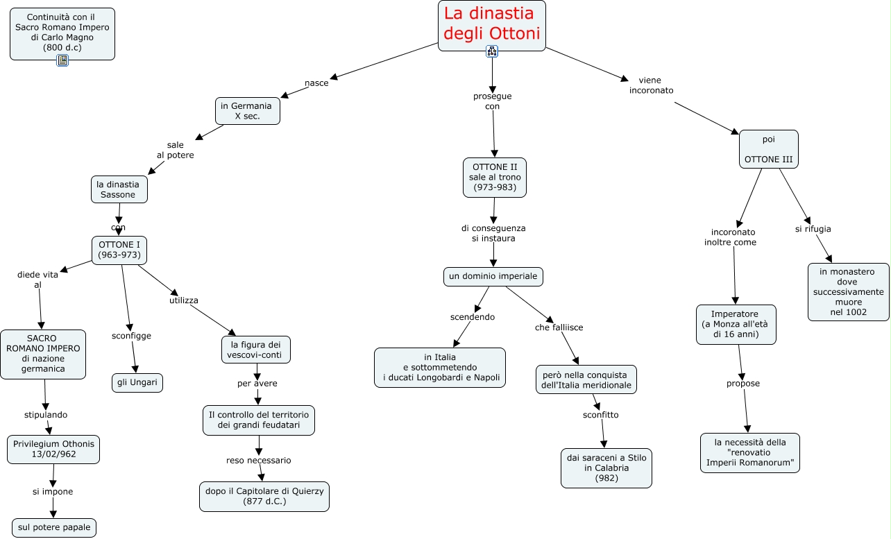 Questa Cmap, creata con IHMC CmapTools, contiene informazioni relative a: Dinastia degli Ottoni, un dominio imperiale scendendo in Italia e sottommetendo i ducati Longobardi e Napoli, Il controllo del territorio dei grandi feudatari reso necessario dopo il Capitolare di Quierzy (877 d.C.), in Germania X sec. sale al potere la dinastia Sassone, OTTONE I (963-973) utilizza la figura dei vescovi-conti, la figura dei vescovi-conti per avere Il controllo del territorio dei grandi feudatari, però nella conquista dell'Italia meridionale sconfitto dai saraceni a Stilo in Calabria (982), poi OTTONE III incoronato inoltre come Imperatore (a Monza all'età di 16 anni), OTTONE I (963-973) diede vita al SACRO ROMANO IMPERO di nazione germanica, OTTONE I (963-973) sconfigge gli Ungari, OTTONE II sale al trono (973-983) di conseguenza si instaura un dominio imperiale, poi OTTONE III si rifugia in monastero dove successivamente muore nel 1002, La dinastia degli Ottoni nasce in Germania X sec., un dominio imperiale che falliisce però nella conquista dell'Italia meridionale, La dinastia degli Ottoni prosegue con OTTONE II sale al trono (973-983), Privilegium Othonis 13/02/962 si impone sul potere papale, SACRO ROMANO IMPERO di nazione germanica stipulando Privilegium Othonis 13/02/962, La dinastia degli Ottoni viene incoronato poi OTTONE III, la dinastia Sassone con OTTONE I (963-973), Imperatore (a Monza all'età di 16 anni) propose la necessità della "renovatio Imperii Romanorum"