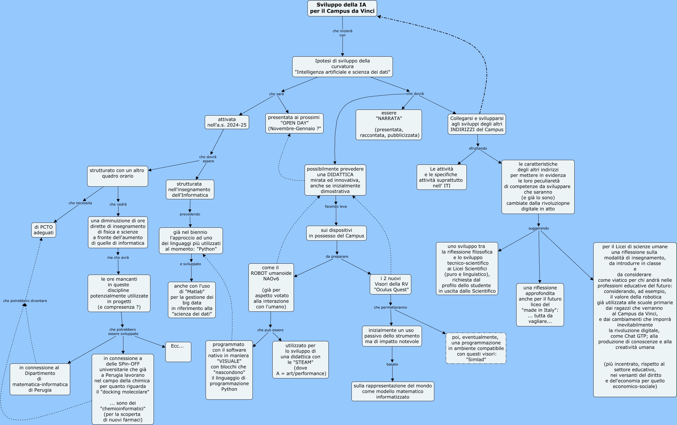 Questa Cmap, creata con IHMC CmapTools, contiene informazioni relative a: Sviluppo della IA per il campus da vinci, possibilmente prevedere una DIDATTICA mirata ed innovativa, anche se inizialmente dimostrativa facendo leva sui dispositivi in possesso del Campus, già nel biennio l'approccio ad uno dei linguaggi più utilizzati al momento: "Python" e sviluppato anche con l'uso di "Matlab" per la gestione dei big data in riferimento alla "scienza dei dati", Collegarsi e svilupparsi agli sviluppi degli altri INDIRIZZI del Campus Sviluppo della IA per il Campus da Vinci, Collegarsi e svilupparsi agli sviluppi degli altri INDIRIZZI del Campus sfruttando Le attività e le specifiche attività suprattutto nell' ITI, Ipotesi di sviluppo della curvatura "Intelligenza artificiale e scienza dei dati" che dovrà essere "NARRATA" (presentata, raccontata, pubblicizzata), in connessione a delle SPin-OFF universitarie che già a Perugia lavorano nel campo della chimica per quanto riguarda il "docking molecolare" ... sono dei "chemioinformatici" (per la scoperta di nuovi farmaci) che potrebbero diventare di PCTO adeguati, come il ROBOT umanoide NAOv6 (già per aspetto votato alla interazione con l'umano) possibilmente prevedere una DIDATTICA mirata ed innovativa, anche se inizialmente dimostrativa, Collegarsi e svilupparsi agli sviluppi degli altri INDIRIZZI del Campus sfruttando le caratteristiche degli altri indirizzi per mettere in evidenza le loro peculiaretà di competenze da sviluppare che saranno (e già lo sono) cambiate dalla rivoluziopne digitale in atto, attivata nell'a.s. 2024-25 che dovrà essere strutturato con un altro quadro orario, le caratteristiche degli altri indirizzi per mettere in evidenza le loro peculiaretà di competenze da sviluppare che saranno (e già lo sono) cambiate dalla rivoluziopne digitale in atto suggerendo per il Licei di scienze umane una riflessione sulla modalità di insegnamento, da introdurre in classe e da considerare come viatico per chi andrà nelle professioni educative del futuro: considerando, ad esempio, il valore della robotica già utilizzata alle scuole primarie dai ragazzi che verranno al Campus da Vinci, e dai cambiamenti che imporrà inevitabilmente la rivoluzione digitale, come Chat GTP; alla produzione di conoscenze e alla creatività umana (più incentrato, rispetto al settore educativo, nei versanti del diritto e del'economia per quello economico-sociale), Ipotesi di sviluppo della curvatura "Intelligenza artificiale e scienza dei dati" che dovrà possibilmente prevedere una DIDATTICA mirata ed innovativa, anche se inizialmente dimostrativa, sui dispositivi in possesso del Campus da preparare come il ROBOT umanoide NAOv6 (già per aspetto votato alla interazione con l'umano), possibilmente prevedere una DIDATTICA mirata ed innovativa, anche se inizialmente dimostrativa presentata ai prossimi "OPEN DAY" (Novembre-Gennaio ?", in connessione al Dipartimento di matematica-informatica di Perugia che potrebbero diventare di PCTO adeguati, le caratteristiche degli altri indirizzi per mettere in evidenza le loro peculiaretà di competenze da sviluppare che saranno (e già lo sono) cambiate dalla rivoluziopne digitale in atto suggerendo una riflessione approfondita anche per il futuro liceo del "made in Italy": ... tutta da vagliare..., come il ROBOT umanoide NAOv6 (già per aspetto votato alla interazione con l'umano) che può essere utilizzato per lo sviluppo di una didattica con le "STEAM" (dove A = art/performance), programmato con il software nativo in maniera "VISUALE" con blocchi che "nascondono" il linguaggio di programmazione Python già nel biennio l'approccio ad uno dei linguaggi più utilizzati al momento: "Python", i 2 nuovi Visori della RV "Oculus Quest" possibilmente prevedere una DIDATTICA mirata ed innovativa, anche se inizialmente dimostrativa, le ore mancanti in queste discipline potenzialmente utilizzate in progetti (e compresenza ?) che potrebbero essere sviluppate Ecc..., Ipotesi di sviluppo della curvatura "Intelligenza artificiale e scienza dei dati" che sarà attivata nell'a.s. 2024-25