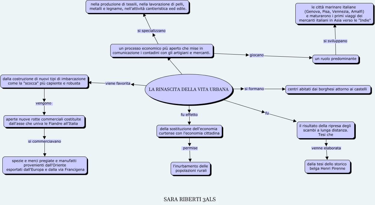 Questa Cmap, creata con IHMC CmapTools, contiene informazioni relative a: la nascita della vita urbana, LA RINASCITA DELLA VITA URBANA si formano centri abitati dai borghesi attorno ai castelli, LA RINASCITA DELLA VITA URBANA fu effetto della sostituzione dell'economia curtense con l'economia cittadina, aperte nuove rotte commerciali costituite dall'asse che univa le Fiandre all'Italia si commerciavano spezie e merci pregiate e manufatti provenienti dall'Oriente esportati dall'Europa e dalla via Francigena, della sostituzione dell'economia curtense con l'economia cittadina permise l'inurbamento delle popolazioni rurali, un processo economico più aperto che mise in comunicazione i contadini con gli artigiani e mercanti. giocano un ruolo predominante, un ruolo predominante si sviluppano le città marinare italiane (Genova, Pisa, Vennezia, Amalfi) e maturarono i primi viaggi dei mercanti italiani in Asia verso le "Indie", un processo economico più aperto che mise in comunicazione i contadini con gli artigiani e mercanti. si specializzano nella produzione di tessili, nella lavorazione di pelli, metalli e legname, nell'attività cantieristica eed edile., LA RINASCITA DELLA VITA URBANA inizia un processo economico più aperto che mise in comunicazione i contadini con gli artigiani e mercanti., dalla costruzione di nuovi tipi di imbarcazione come la "scocca" più capiente e robusta vengono aperte nuove rotte commerciali costituite dall'asse che univa le Fiandre all'Italia, il risultato della ripresa degli scambi a lunga distanza. Tesi che venne elaborata dalla tesi dello storico belga Henri Pirenne, LA RINASCITA DELLA VITA URBANA fu il risultato della ripresa degli scambi a lunga distanza. Tesi che, LA RINASCITA DELLA VITA URBANA viene favorita dalla costruzione di nuovi tipi di imbarcazione come la "scocca" più capiente e robusta