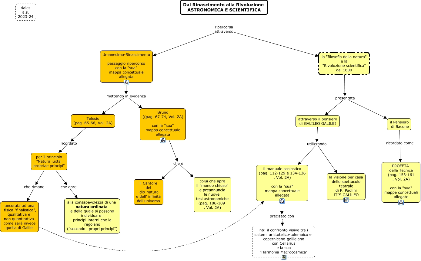 Questa Cmap, creata con IHMC CmapTools, contiene informazioni relative a: Dal Rinascimento allla Rivoluzione ASTRONOMICA E SCIENTIFICA, il Pensiero di Bacone ricordato come PROFETA della Tecnica (pag. 153-161 , Vol. 2A) con la "sue" mappe concettuali allegate, la "filosofia della natura" e la "Rivoluzione scientifica" del 1600 presentata attraverso il pensiero di GALILEO GALILEI, attraverso il pensiero di GALILEO GALILEI utilizzando il manuale scolastico (pag. 112-129 e 134-136 , Vol. 2A) con la "sua" mappa concettuale allegata, Umanesimo-Rinascimento passaggio ripercorso con la "sua" mappa concettuale allegata mettendo in evidenza Telesio (pag. 65-66, Vol. 2A), Dal Rinascimento alla Rivoluzione ASTRONOMICA E SCIENTIFICA ripercorsa attraverso Umanesimo-Rinascimento passaggio ripercorso con la "sua" mappa concettuale allegata, Dal Rinascimento alla Rivoluzione ASTRONOMICA E SCIENTIFICA ripercorsa attraverso la "filosofia della natura" e la "Rivoluzione scientifica" del 1600, Bruno ((pag. 67-74, Vol. 2A) con la "sua" mappa concettuale allegata che è il Cantore del dio-natura e dell' infinità dell'universo, per il principio "Natura iuxta propriae principi" che apre alla consapevolezza di una natura ordinata e della quale si possono individuare i principi interni che la regolano ("secondo i propri principi"), Umanesimo-Rinascimento passaggio ripercorso con la "sua" mappa concettuale allegata mettendo in evidenza Bruno ((pag. 67-74, Vol. 2A) con la "sua" mappa concettuale allegata, Telesio (pag. 65-66, Vol. 2A) ricordato per il principio "Natura iuxta propriae principi", attraverso il pensiero di GALILEO GALILEI utilizzando la visione per casa dello spettacolo teatrale di P. Paolini ITIS GALILEO, la "filosofia della natura" e la "Rivoluzione scientifica" del 1600 presentata il Pensiero di Bacone, per il principio "Natura iuxta propriae principi" che rimane ancorata ad una fisica "finalistica", qualitativa e non quantitativa come sarà invece quella di Galilei, Bruno ((pag. 67-74, Vol. 2A) con la "sua" mappa concettuale allegata che è colui che apre il "mondo chiuso" e preannuncia le nuove tesi astronomiche (pag. 106-109 , Vol. 2A), ancorata ad una fisica "finalistica", qualitativa e non quantitativa come sarà invece quella di Galilei il manuale scolastico (pag. 112-129 e 134-136 , Vol. 2A) con la "sua" mappa concettuale allegata, il manuale scolastico (pag. 112-129 e 134-136 , Vol. 2A) con la "sua" mappa concettuale allegata precisato con nb: il confronto visivo tra i sistemi aristotelico-tolemaico e copernicano-galileiano con Cellarius e la sua "Harmonia Macrocosmica"