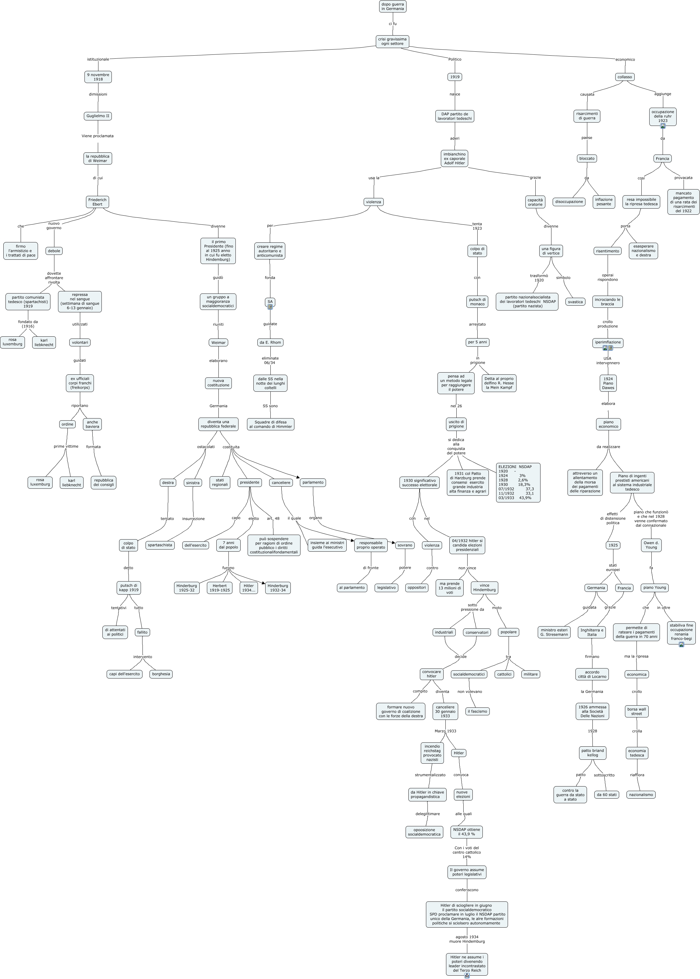 Questa Cmap, creata con IHMC CmapTools, contiene informazioni relative a: weimar nazismo VC, borsa wall street crolla economia tedesca, Hitler di sciogliere in giugno il partito socialdemocratico SPD proclamare in luglio il NSDAP partito unico della Germania, le alre formazioni politiche si sciolsero autonomamente agosto 1934 muore Hindemburg Hitler ne assume i poteri divenendo leader incontrastato del Terzo Reich, piano economico da realizzare attreverso un allentamento della morsa dei pagamenti delle riparazione, popolare tra cattolici, bloccato da inflazione pesante, patto briand kellog sottoscritto da 60 stati, partito comunista tedesco (spartachisti) 1919 fondato da (1916) karl liebknecht, industriali decide convocare hitler, piano Young in oltre stabiliva fine occupazione renania franco-begi, Friederich Ebert che firmo l'armistizio e i trattati di pace, uscito di prigione si dedica alla conquista del potere 1931 col Patto di Harzburg prende consensi esercito grande industria alta finanza e agrari, debole dovette affrontare rivolta partito comunista tedesco (spartachisti) 1919, 1925 stati europei Germania, imbianchino ex caporale Adolf Hitler usa la violenza, parlamento organo sovrano, presidente capo dell'esercito, imbianchino ex caporale Adolf Hitler grazie capacità oratorie, resa impossibile la ripresa tedesca porta risentimento, 9 novembre 1918 dimissioni Guglielmo II, diventa una repubblica federale costituita parlamento