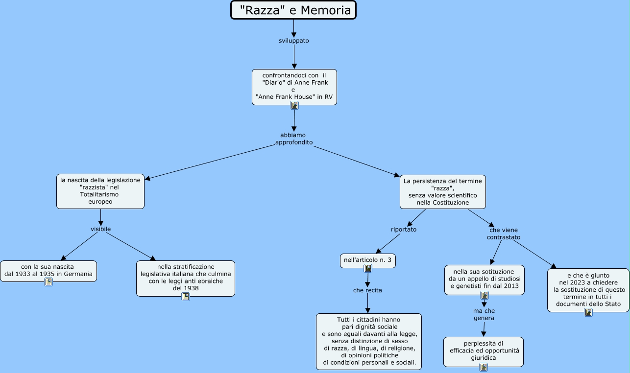 Questa Cmap, creata con IHMC CmapTools, contiene informazioni relative a: razza e memoria Anne Frank e Costituzione campus, "Razza" e Memoria sviluppato confrontandoci con il "Diario" di Anne Frank e "Anne Frank House" in RV, la nascita della legislazione "razzista" nel Totalitarismo europeo visibile con la sua nascita dal 1933 al 1935 in Germania, La persistenza del termine "razza", senza valore scientifico nella Costituzione riportato nell'articolo n. 3, La persistenza del termine "razza", senza valore scientifico nella Costituzione che viene contrastato nella sua sotituzione da un appello di studiosi e genetisti fin dal 2013, confrontandoci con il "Diario" di Anne Frank e "Anne Frank House" in RV abbiamo approfondito la nascita della legislazione "razzista" nel Totalitarismo europeo, confrontandoci con il "Diario" di Anne Frank e "Anne Frank House" in RV abbiamo approfondito La persistenza del termine "razza", senza valore scientifico nella Costituzione, la nascita della legislazione "razzista" nel Totalitarismo europeo visibile nella stratificazione legislativa italiana che culmina con le leggi anti ebraiche del 1938, La persistenza del termine "razza", senza valore scientifico nella Costituzione che viene contrastato e che è giunto nel 2023 a chiedere la sostituzione di questo termine in tutti i documenti dello Stato, nella sua sotituzione da un appello di studiosi e genetisti fin dal 2013 ma che genera perplessità di efficacia ed opportunità giuridica, nell'articolo n. 3 che recita Tutti i cittadini hanno pari dignità sociale e sono eguali davanti alla legge, senza distinzione di sesso di razza, di lingua, di religione, di opinioni politiche di condizioni personali e sociali.