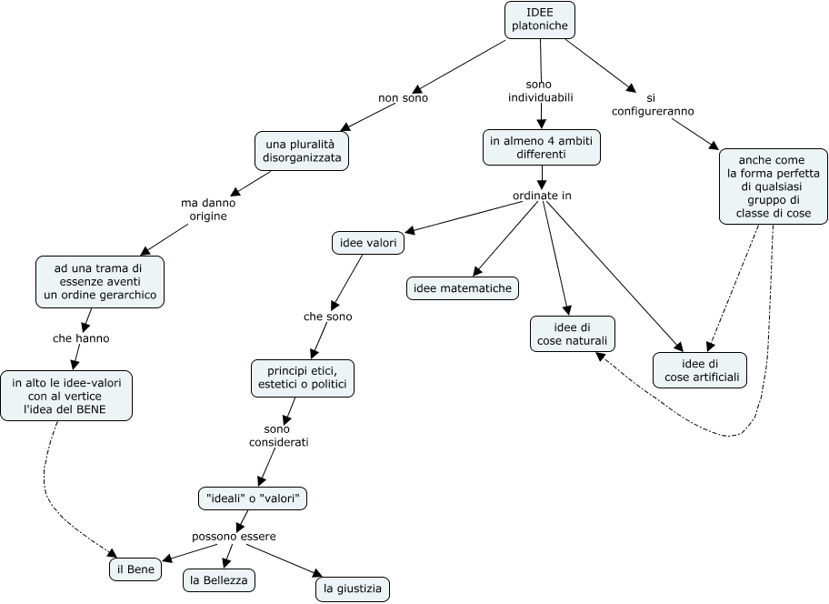 Questa Cmap, creata con IHMC CmapTools, contiene informazioni relative a: idea platonica, in almeno 4 ambiti differenti ordinate in idee valori, anche come la forma perfetta di qualsiasi gruppo di classe di cose idee di cose artificiali, in almeno 4 ambiti differenti ordinate in idee di cose artificiali, principi etici, estetici o politici sono considerati "ideali" o "valori", anche come la forma perfetta di qualsiasi gruppo di classe di cose idee di cose naturali, IDEE platoniche non sono una pluralità disorganizzata, "ideali" o "valori" possono essere la Bellezza, in almeno 4 ambiti differenti ordinate in idee matematiche, in alto le idee-valori con al vertice l'idea del BENE il Bene, in almeno 4 ambiti differenti ordinate in idee di cose naturali, "ideali" o "valori" possono essere la giustizia, IDEE platoniche sono individuabili in almeno 4 ambiti differenti, idee valori che sono principi etici, estetici o politici, IDEE platoniche si configureranno anche come la forma perfetta di qualsiasi gruppo di classe di cose, una pluralità disorganizzata ma danno origine ad una trama di essenze aventi un ordine gerarchico, ad una trama di essenze aventi un ordine gerarchico che hanno in alto le idee-valori con al vertice l'idea del BENE, "ideali" o "valori" possono essere il Bene