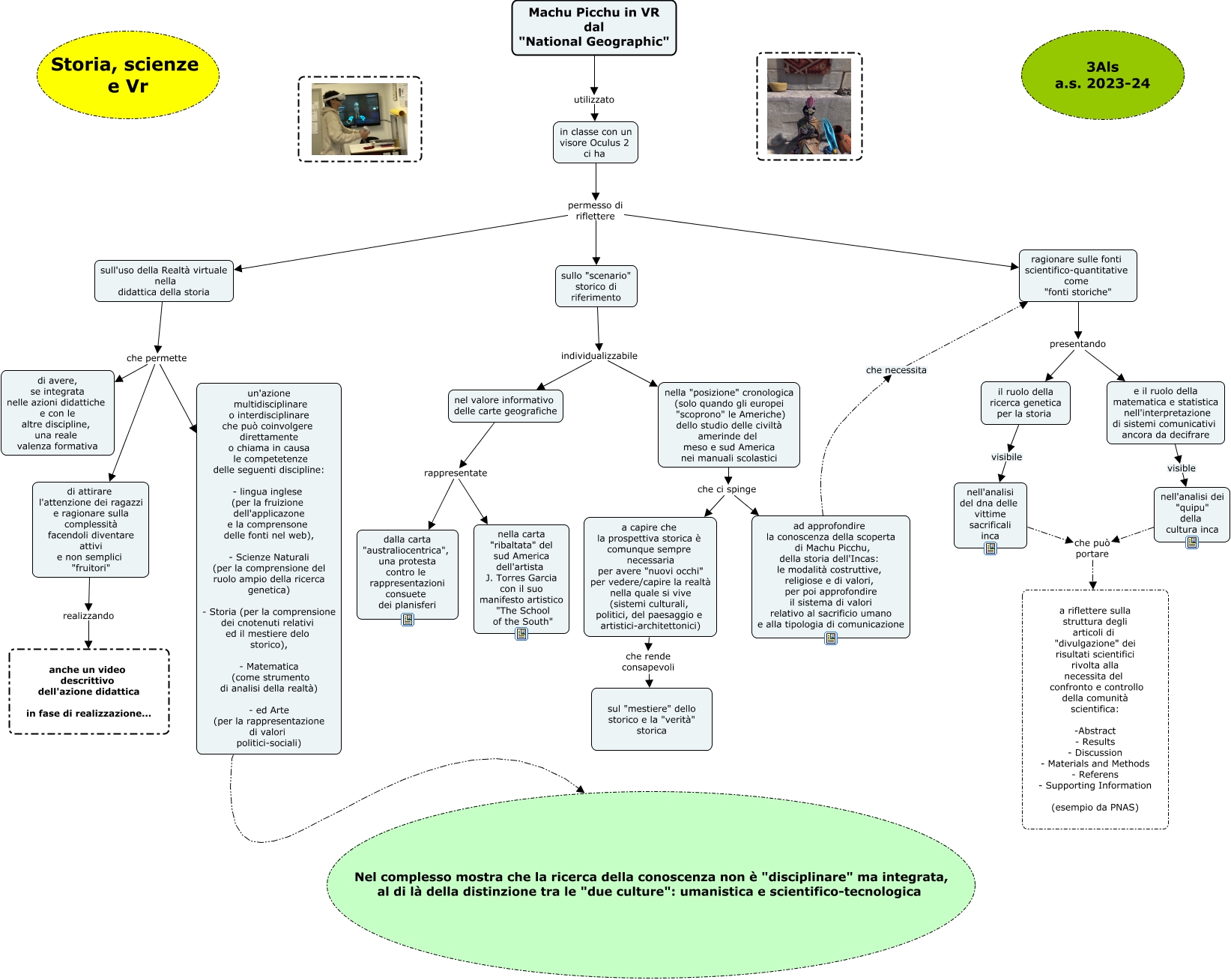 Questa Cmap, creata con IHMC CmapTools, contiene informazioni relative a: Machu Picchu in VR, di attirare l'attenzione dei ragazzi e ragionare sulla complessità facendoli diventare attivi e non semplici "fruitori" realizzando anche un video descrittivo dell'azione didattica in fase di realizzazione..., sull'uso della Realtà virtuale nella didattica della storia che permette di avere, se integrata nelle azioni didattiche e con le altre discipline, una reale valenza formativa, il ruolo della ricerca genetica per la storia visibile nell'analisi del dna delle vittime sacrificali inca, un'azione multidisciplinare o interdisciplinare che può coinvolgere direttamente o chiama in causa le competetenze delle seguenti discipline: - lingua inglese (per la fruizione dell'applicazone e la comprensone delle fonti nel web), - Scienze Naturali (per la comprensione del ruolo ampio della ricerca genetica) - Storia (per la comprensione dei cnotenuti relativi ed il mestiere delo storico), - Matematica (come strumento di analisi della realtà) - ed Arte (per la rappresentazione di valori politici-sociali) Nel complesso mostra che la ricerca della conoscenza non è "disciplinare" ma integrata, al di là della distinzione tra le "due culture": umanistica e scientifico-tecnologica, nell'analisi del dna delle vittime sacrificali inca che può portare a riflettere sulla struttura degli articoli di "divulgazione" dei risultati scientifici rivolta alla necessita del confronto e controllo della comunità scientifica: -Abstract - Results - Discussion - Materials and Methods - Referens - Supporting Information (esempio da PNAS), ad approfondire la conoscenza della scoperta di Machu Picchu, della storia dell'Incas: le modalità costruttive, religiose e di valori, per poi approfondire il sistema di valori relativo al sacrificio umano e alla tipologia di comunicazione che necessita ragionare sulle fonti scientifico-quantitative come "fonti storiche", nel valore informativo delle carte geografiche rappresentate nella carta "ribaltata" del sud America dell'artista J. Torres Garcia con il suo manifesto artistico "The School of the South", nel valore informativo delle carte geografiche rappresentate dalla carta "australiocentrica", una protesta contro le rappresentazioni consuete dei planisferi, sullo "scenario" storico di riferimento individualizzabile nel valore informativo delle carte geografiche, a capire che la prospettiva storica è comunque sempre necessaria per avere "nuovi occhi" per vedere/capire la realtà nella quale si vive (sistemi culturali, politici, del paesaggio e artistici-architettonici) che rende consapevoli sul "mestiere" dello storico e la "verità" storica, sull'uso della Realtà virtuale nella didattica della storia che permette di attirare l'attenzione dei ragazzi e ragionare sulla complessità facendoli diventare attivi e non semplici "fruitori", nella "posizione" cronologica (solo quando gli europei "scoprono" le Americhe) dello studio delle civiltà amerinde del meso e sud America nei manuali scolastici che ci spinge a capire che la prospettiva storica è comunque sempre necessaria per avere "nuovi occhi" per vedere/capire la realtà nella quale si vive (sistemi culturali, politici, del paesaggio e artistici-architettonici), e il ruolo della matematica e statistica nell'interpretazione di sistemi comunicativi ancora da decifrare visible nell'analisi dei "quipu" della cultura inca, in classe con un visore Oculus 2 ci ha permesso di riflettere sull'uso della Realtà virtuale nella didattica della storia, Machu Picchu in VR dal "National Geographic" utilizzato in classe con un visore Oculus 2 ci ha, sullo "scenario" storico di riferimento individualizzabile nella "posizione" cronologica (solo quando gli europei "scoprono" le Americhe) dello studio delle civiltà amerinde del meso e sud America nei manuali scolastici, nell'analisi dei "quipu" della cultura inca che può portare a riflettere sulla struttura degli articoli di "divulgazione" dei risultati scientifici rivolta alla necessita del confronto e controllo della comunità scientifica: -Abstract - Results - Discussion - Materials and Methods - Referens - Supporting Information (esempio da PNAS), ragionare sulle fonti scientifico-quantitative come "fonti storiche" presentando e il ruolo della matematica e statistica nell'interpretazione di sistemi comunicativi ancora da decifrare, nella "posizione" cronologica (solo quando gli europei "scoprono" le Americhe) dello studio delle civiltà amerinde del meso e sud America nei manuali scolastici che ci spinge ad approfondire la conoscenza della scoperta di Machu Picchu, della storia dell'Incas: le modalità costruttive, religiose e di valori, per poi approfondire il sistema di valori relativo al sacrificio umano e alla tipologia di comunicazione, sull'uso della Realtà virtuale nella didattica della storia che permette un'azione multidisciplinare o interdisciplinare che può coinvolgere direttamente o chiama in causa le competetenze delle seguenti discipline: - lingua inglese (per la fruizione dell'applicazone e la comprensone delle fonti nel web), - Scienze Naturali (per la comprensione del ruolo ampio della ricerca genetica) - Storia (per la comprensione dei cnotenuti relativi ed il mestiere delo storico), - Matematica (come strumento di analisi della realtà) - ed Arte (per la rappresentazione di valori politici-sociali)