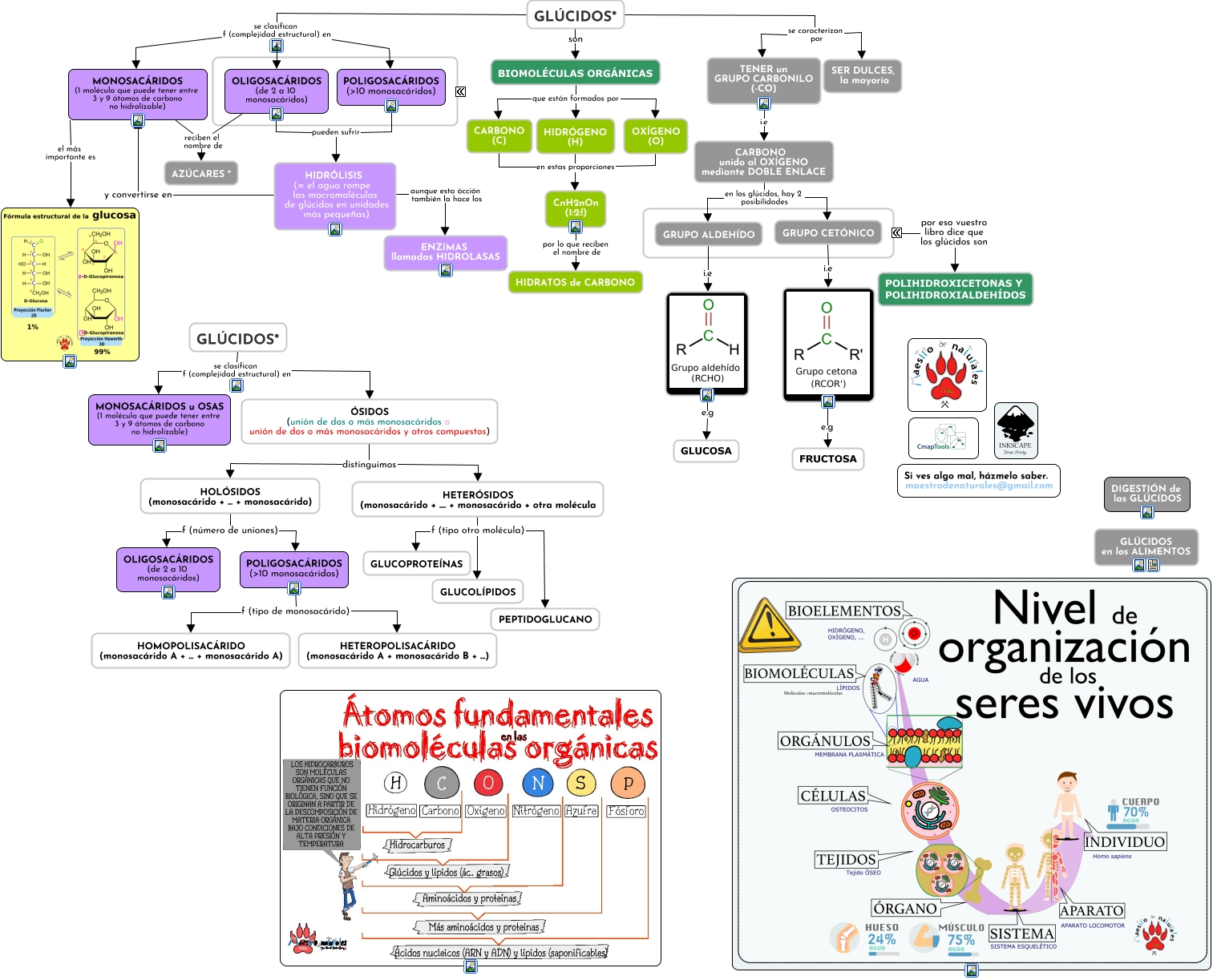 Este Cmap, tiene información relacionada con: 2.1 Qué son los glúcidos, propiedades y clasificación, OLIGOSACÁRIDOS (de 2 a 10 monosacáridos) pueden sufrir HIDRÓLISIS (= el agua rompe las macromoléculas de glúcidos en unidades más pequeñas), HETERÓSIDOS (monosacárido + .... + monosacárido + otra molécula f (tipo otro molécula) GLUCOPROTEÍNAS, HETERÓSIDOS (monosacárido + .... + monosacárido + otra molécula f (tipo otro molécula) GLUCOLÍPIDOS, e.g FRUCTOSA, CARBONO (C) en estas proporciones CnH2nOn (1:2:!), GLÚCIDOS* se clasifican f (complejidad estructural) en MONOSACÁRIDOS (1 molécula que puede tener entre 3 y 9 átomos de carbono no hidrolizable), GLÚCIDOS* se caracterizan por SER DULCES, la mayoría, ÓSIDOS (unión de dos o más monosacáridos o unión de dos o más monosacáridos y otros compuestos) distinguimos HETERÓSIDOS (monosacárido + .... + monosacárido + otra molécula, HIDRÓLISIS (= el agua rompe las macromoléculas de glúcidos en unidades más pequeñas) y convertirse en MONOSACÁRIDOS (1 molécula que puede tener entre 3 y 9 átomos de carbono no hidrolizable), HOLÓSIDOS (monosacárido + ... + monosacárido) f (número de uniones) POLIGOSACÁRIDOS (ᡂ monosacáridos), GLÚCIDOS* son BIOMOLÉCULAS ORGÁNICAS, TENER un GRUPO CARBONILO (-CO) i.e CARBONO unido al OXÍGENO mediante DOBLE ENLACE, CnH2nOn (1:2:!) por lo que reciben el nombre de HIDRATOS de CARBONO, CARBONO unido al OXÍGENO mediante DOBLE ENLACE en los glúcidos, hay 2 posibilidades GRUPO CETÓNICO, HOLÓSIDOS (monosacárido + ... + monosacárido) f (número de uniones) OLIGOSACÁRIDOS (de 2 a 10 monosacáridos), GLÚCIDOS* se clasifican f (complejidad estructural) en ÓSIDOS (unión de dos o más monosacáridos o unión de dos o más monosacáridos y otros compuestos), GLÚCIDOS* se clasifican f (complejidad estructural) en OLIGOSACÁRIDOS (de 2 a 10 monosacáridos), HIDRÓGENO (H) en estas proporciones CnH2nOn (1:2:!), ÓSIDOS (unión de dos o más monosacáridos o unión de dos o más monosacáridos y otros compuestos) distinguimos HOLÓSIDOS (monosacárido + ... + monosacárido), CARBONO unido al OXÍGENO mediante DOBLE ENLACE en los glúcidos, hay 2 posibilidades GRUPO ALDEHÍDO