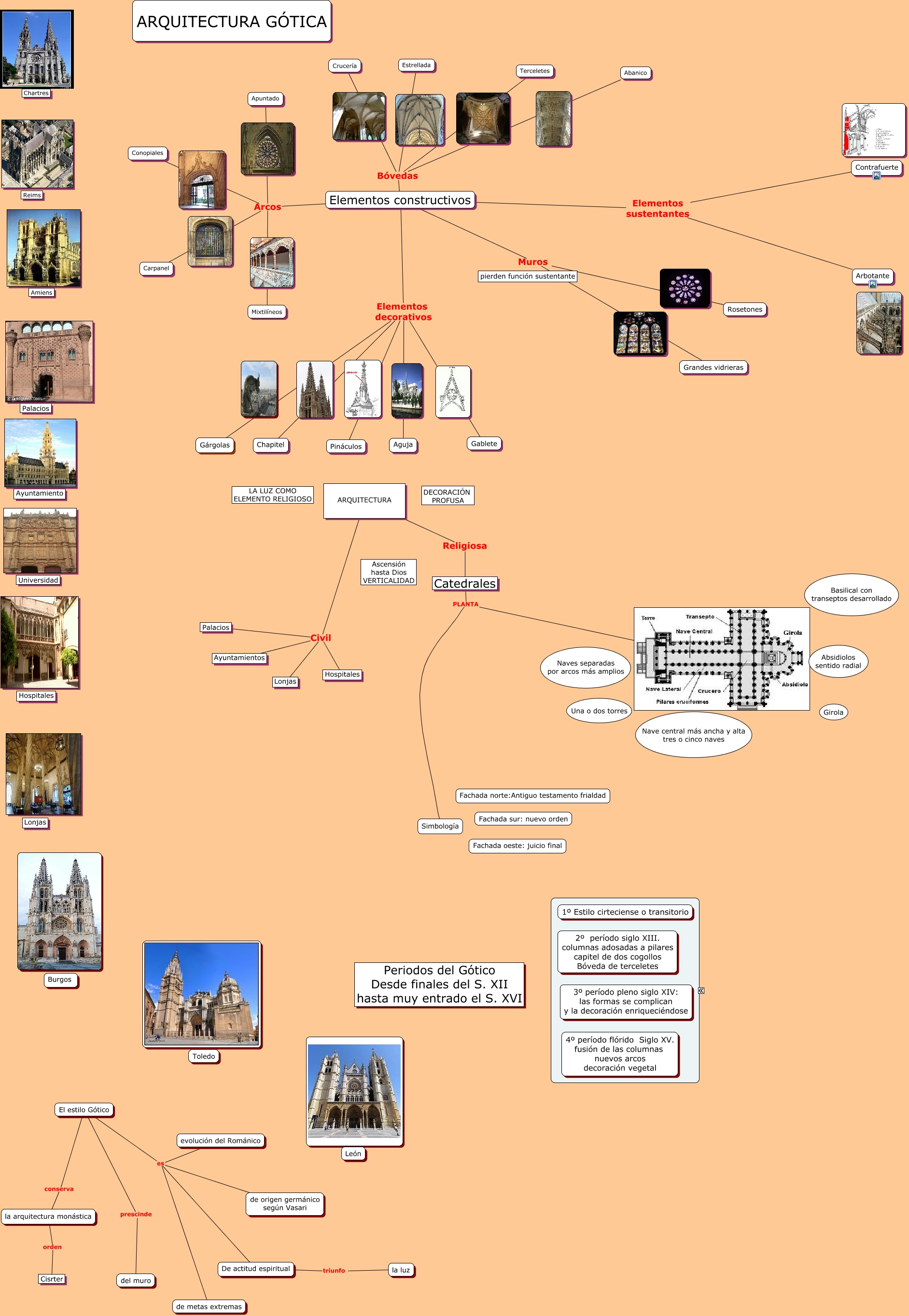 Este Cmap, tiene información relacionada con: Gótico, Elementos constructivos Arcos Apuntado, El estilo Gótico prescinde del muro, Elementos constructivos Arcos Carpanel, El estilo Gótico conserva la arquitectura monástica, Elementos constructivos Elementos sustentantes Contrafuerte, ARQUITECTURA Civil Palacios, Elementos constructivos Bóvedas Abanico, Elementos constructivos Muros Rosetones, Elementos constructivos Elementos decorativos Gárgolas, Elementos constructivos Elementos sustentantes Arbotante, Elementos constructivos Bóvedas Estrellada, Catedrales PLANTA Simbología, El estilo Gótico es de origen germánico según Vasari, Elementos constructivos Arcos Conopiales, Elementos constructivos Elementos decorativos Chapitel, Elementos constructivos Arcos Mixtilíneos, El estilo Gótico es evolución del Románico, ARQUITECTURA Civil Hospitales, ARQUITECTURA Religiosa Catedrales, Catedrales PLANTA