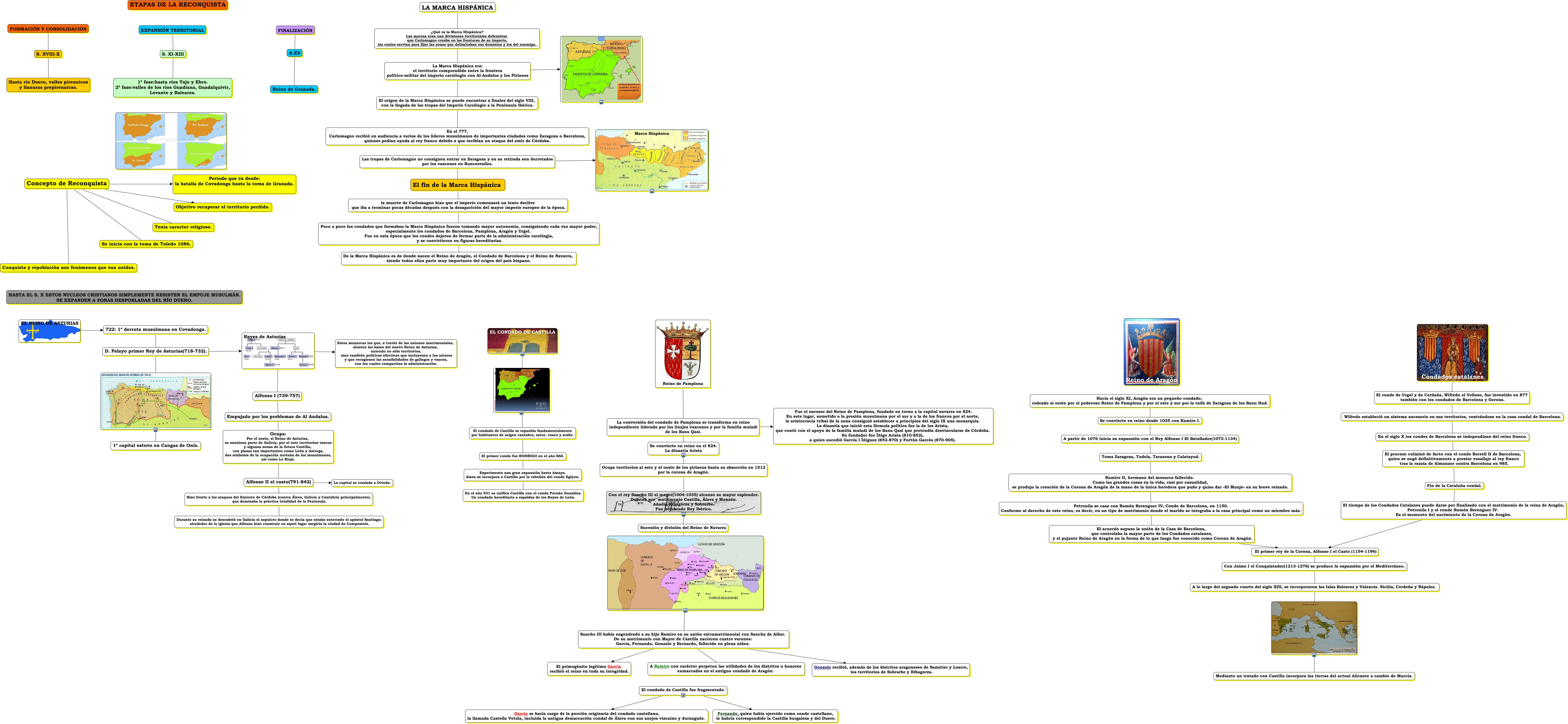 Este Cmap, tiene información relacionada con: Los primeros nucleos cristianos, Hacia el siglo XI, Aragón era un pequeño condado, rodeado al oeste por el poderoso Reino de Pamplona y por el este y sur por la taifa de Zaragoza de los Banu Hud. Se convierte en reino desde 1035 con Ramiro I., El primer rey de la Corona, Alfonso I el Casto (1154-1196) Con Jaime I el Conquistador(1213-1276) se produce la expansión por el Mediterráneo., Concepto de Reconquista Conquista y repoblación son fenómenos que van unidos., FORMACIÓN Y CONSOLIDACIÓN S. XVIII-X, S.XV Reino de Granada., En el siglo X los condes de Barcelona se independizan del reino franco. El proceso culminó de facto con el conde Borrell II de Barcelona, quien se negó definitivamente a prestar vasallaje al rey franco tras la razzia de Almanzor contra Barcelona en 985., Sancho III había engendrado a su hijo Ramiro en su unión extramatrimonial con Sancha de Aibar. De su matrimonio con Mayor de Castilla nacieron cuatro varones: García, Fernando, Gonzalo y Bernardo, fallecido en plena niñez. Gonzalo recibió, además de los distritos aragoneses de Samitier y Loarre, los territorios de Sobrarbe y Ribagorza., Concepto de Reconquista Periodo que va desde: la batalla de Covadonga hasta la toma de Granada., Se convierte en reino desde 1035 con Ramiro I. A partir de 1076 inicia su expansión con el Rey Alfonso I El Batallador(1073-1134), Alfonso I (739-757) Empujado por los problemas de Al Andalus., Reyes de Asturias Estos monarcas los que, a través de las uniones matrimoniales, sienten las bases del nuevo Reino de Asturias, uniendo no sólo territorios, sino también políticas efectivas que incluyesen a los astures y que recogiesen las sensibilidades de gallegos y vascos, con los cuales compartían la administración., Toma Zaragoza, Tudela, Tarazona y Calatayud. Ramiro II, hermano del monarca fallecido. Como las grandes cosas en la vida, casi por casualidad, se produjo la creación de la Corona de Aragón de la mano de la única heredera que pudo y quiso dar «El Monje» en su breve reinado., La conversión del condado de Pamplona se transforma en reino independiente liderado por los linajes vascones y por la familia muladí de los Banu Qasi. Se convierte en reino en el 824. La dinastía Arista, Ramiro II, hermano del monarca fallecido. Como las grandes cosas en la vida, casi por casualidad, se produjo la creación de la Corona de Aragón de la mano de la única heredera que pudo y quiso dar «El Monje» en su breve reinado. Petronila se casa con Ramón Berenguer IV, Conde de Barcelona, en 1150. Conforme al derecho de este reino, es decir, en un tipo de matrimonio donde el marido se integraba a la casa principal como un miembro más., S. XVIII-X Hasta río Duero, valles pirenaicos y llanuras prepirenaicas., Las tropas de Carlomagno no consiguen entrar en Zaragoza y en su retirada son derrotados por los vascones en Roncesvalles. Marca Hispánica, Sancho III había engendrado a su hijo Ramiro en su unión extramatrimonial con Sancha de Aibar. De su matrimonio con Mayor de Castilla nacieron cuatro varones: García, Fernando, Gonzalo y Bernardo, fallecido en plena niñez. A Ramiro con carácter perpetuo las utilidades de los distritos u honores enmarcados en el antiguo condado de Aragón., El acuerdo supuso la unión de la Casa de Barcelona, que controlaba la mayor parte de los Condados catalanes, y el pujante Reino de Aragón en la forma de lo que luego fue conocido como Corona de Aragón. El primer rey de la Corona, Alfonso I el Casto (1154-1196), La conversión del condado de Pamplona se transforma en reino independiente liderado por los linajes vascones y por la familia muladí de los Banu Qasi. Fue el sucesor del Reino de Pamplona, fundado en torno a la capital navarra en 824. En este lugar, sometido a la presión musulmana por el sur y a la de los francos por el norte, la aristocracia tribal de la zona consiguió establecer a principios del siglo IX una monarquía. La dinastía que inició esta fórmula política fue la de los Arista, que contó con el apoyo de la familia muladí de los Banu Qasi que pretendía desvincularse de Córdoba. Su fundador fue Íñigo Arista (810-852), a quien sucedió García I Íñiguez (852-870) y Fortún Garcés (870-905)., El origen de la Marca Hispánica se puede encontrar a finales del siglo VIII, con la llegada de las tropas del Imperio Carolingio a la Península Ibérica. En el 777, Carlomagno recibió en audiencia a varios de los líderes musulmanes de importantes ciudades como Zaragoza o Barcelona, quienes pedían ayuda al rey franco debido a que recibían un ataque del emir de Córdoba.
