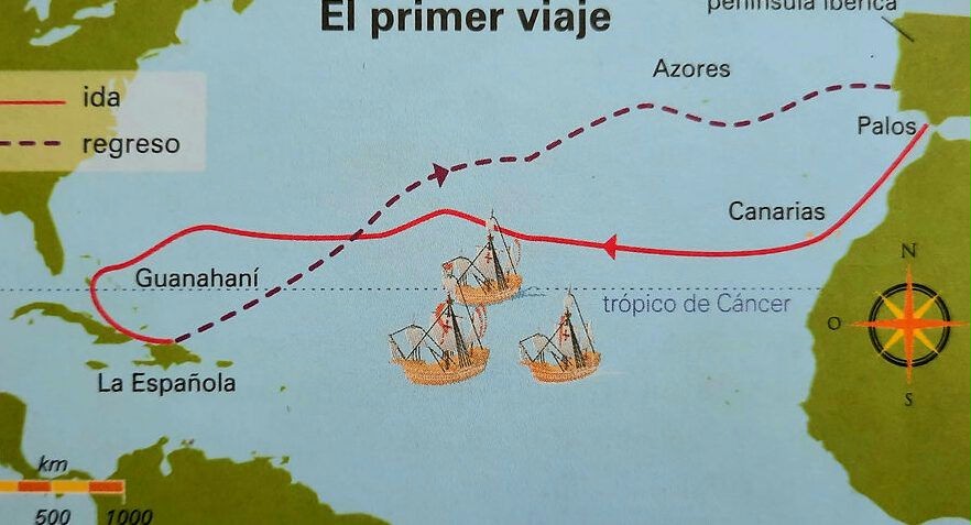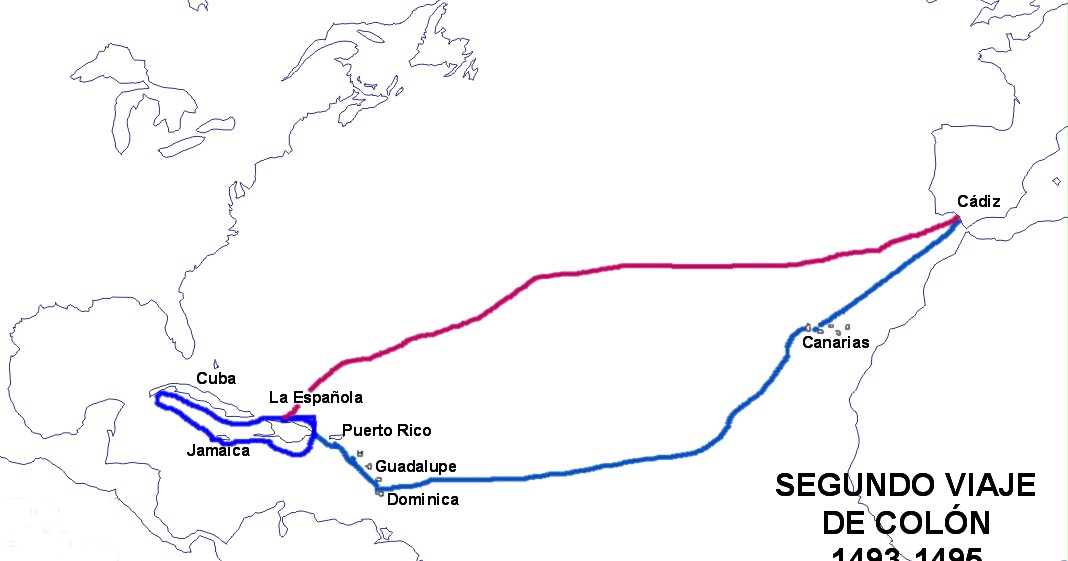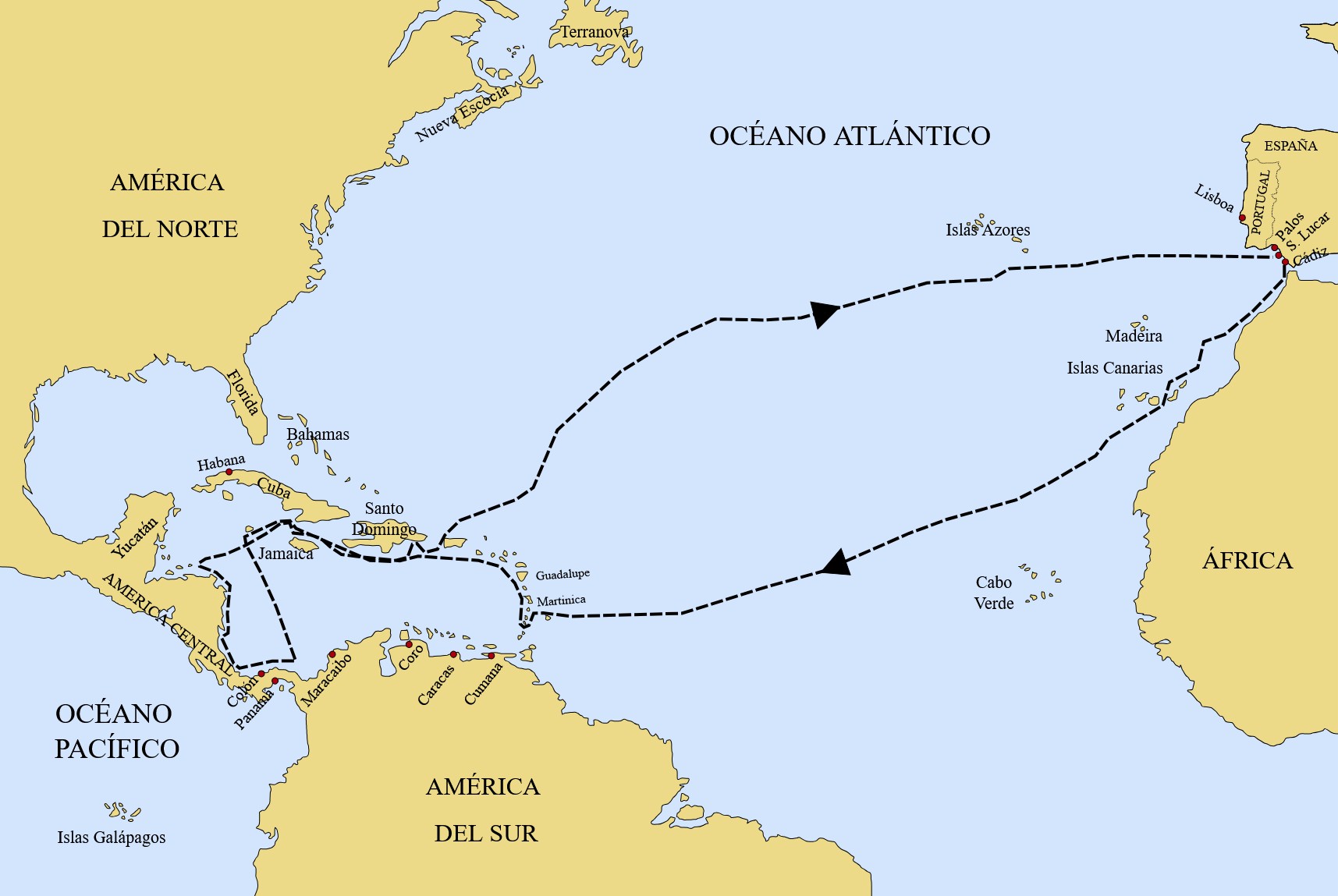 Este Cmap, tiene información relacionada con: Colón, Tr Tres barcos y 90 hombres Destacan los hermanos Pinzón., 4º viaje Cádiz,9 de mayo de 1502 /Sanlúcar de Barrameda, 7 de noviembre de 1504C, Tres barcos y 90 hombres Destacan los hermanos Pinzón. ????, Convence a los Reyes Católicos Colón argumentó que las riquezas del Oriente podrían financiar una nueva cruzada para liberar Jerusalén, un objetivo anhelado desde hacía mucho tiempo por la cristiandad europea. Presentó su viaje no solo como una empresa comercial, sino como una misión divina., El día 3 de noviembre llegaba a la pequeña isla de Dominica, la primera de un nuevo archipiélago: las pequeñas Antillas. Varias de ellas fueron descubiertas los días siguientes (del 3 al 18 de noviembre): Guadalupe, Antigua, Once Mil Vírgenes, etc. Ese 18 de noviembre avistaba el actual Puerto Rico, llamado Borinquén y rebautizado como San Juan Bautista. Por fin el 27 encontraba los restos del fuerte de Navidad con sus 39 marinos aniquilados a manos de un cacique agresivo de la zona según le informaron caciques amigos del primer viaje. Tras pasar la Navidad, el día 6 de enero de 1494 fundaba La Isabela, en la costa norte de la isla de La Española. Nacía la primera población en América. El 24 de abril zarpaba en busca de nuevas tierras y de China, a la que creía muy cercana. Durante todo el verano y el otoño exploraba la costa del sur de Cuba, las costas de Jamaica y la costa sur de la Española. Por fin, el 10 de marzo de 1495 zarpa rumbo a España, llegando a Cádiz el 11 de junio a Cádiz., Toca tierra en las islas Bahamas en Guanahaní La llama San Salvador, Aunque su principal pretensión era establecer una nueva ruta comercial entre Asia y Europa navegando hacia las Indias por el oeste. Convence a los Reyes Católicos, Toca tierra en las islas Bahamas en Guanahaní La llama San Salvador Después de abastecerse de agua y comida, el navegante siguió su periplo por las islas de este archipiélago, llegando a a Cuba, a la que nombró Juana en honor a la hija de los Reyes Católicos, el 28 de octubre., 2º viaje Cádiz, 25 de septiembre de 1493 / Cádiz, 11 de junio de 1495 14 carabelas y tres naos, La expedición parte de Palos de la Frontera 3 de agosto de 1492. Llegada a América el 12 de otubre de 1492. 1º viaje, Después de abastecerse de agua y comida, el navegante siguió su periplo por las islas de este archipiélago, llegando a a Cuba, a la que nombró Juana en honor a la hija de los Reyes Católicos, el 28 de octubre. El 6 de diciembre llegó a Santo Domingo, isla que en adelante sería conocida como La Española y que sería el punto final de este primer viaje de Colón. El día 24 del mismo mes la Santa María encalló a la altura del actual cabo Haitien y sus restos sirvieron para construir un pequeño fuerte, bautizado como Navidad., Recorrió a fondo una parte del continente americano: en concreto, la costa donde actualmente se encuentran Honduras, Nicaragua, Costa Rica y Panamá., Convence a los Reyes Católicos Firma Las capitulciones de Santa Fe 17 de abril de 1492, Qué buscaba: llegar a las Indias. Aunque su principal pretensión era establecer una nueva ruta comercial entre Asia y Europa navegando hacia las Indias por el oeste., 3º viaje Sanlúcar de Barrameda, 30 de mayo de 1498 / Cádiz, noviembre de 1500., Qué buscaba: llegar a las Indias. Parece ser que tenía datos sobre la existencia de islas que acortaban el viaje en una nueva ruta por el Atlántico., El 6 de diciembre llegó a Santo Domingo, isla que en adelante sería conocida como La Española y que sería el punto final de este primer viaje de Colón. El día 24 del mismo mes la Santa María encalló a la altura del actual cabo Haitien y sus restos sirvieron para construir un pequeño fuerte, bautizado como Navidad. Regresa a Palos tras una breve escala en Lisboa (problemas con el rey de Portugal) al puerto de Palos el 15 de marzo de 1493., Tres años tardó en realizar su tercer viaje. Tras hacer la aguada en Canarias se dirigió más al sur, descubriendo el 31 de julio la isla de Trinidad. De ahí recorrió parte de la costa venezolana y confirmó que estaba en tierra firme. Descubrió también la isla Margarita. Llegó a Santo Domingo en el 31 de agosto de 1498. Ahora empezaba su caída imparable. La situación era desastrosa en la colonia y hubo de reprimir todo el año 1499 rebeliones de indios y españoles a la vez. El 24 de agosto de 1500 llegaba Francisco de Bobadilla con órdenes de los Reyes Católicos de detenerlo. Colón y sus dos hermanos fueron llevados presos a Cádiz. Los reyes le convocaron en Granada, donde fue liberado de sus grilletes. Los monarcas le reprobaron su política en la isla y le degradaron, aunque conservó su cargo de Almirante. En España se enteró de que estaban saliendo (y saldrían) viajes a las Indias. Ya sería un mero descubridor sin el monopolio anterior. Nicolás de Ovando sería el nuevo gobernador de las Indias., Regresa a Palos tras una breve escala en Lisboa (problemas con el rey de Portugal) al puerto de Palos el 15 de marzo de 1493. El Tratado de Tordesillas, Tres barcos y 90 hombres Destacan los hermanos Pinzón. Santa María, la Pinta y la Niña