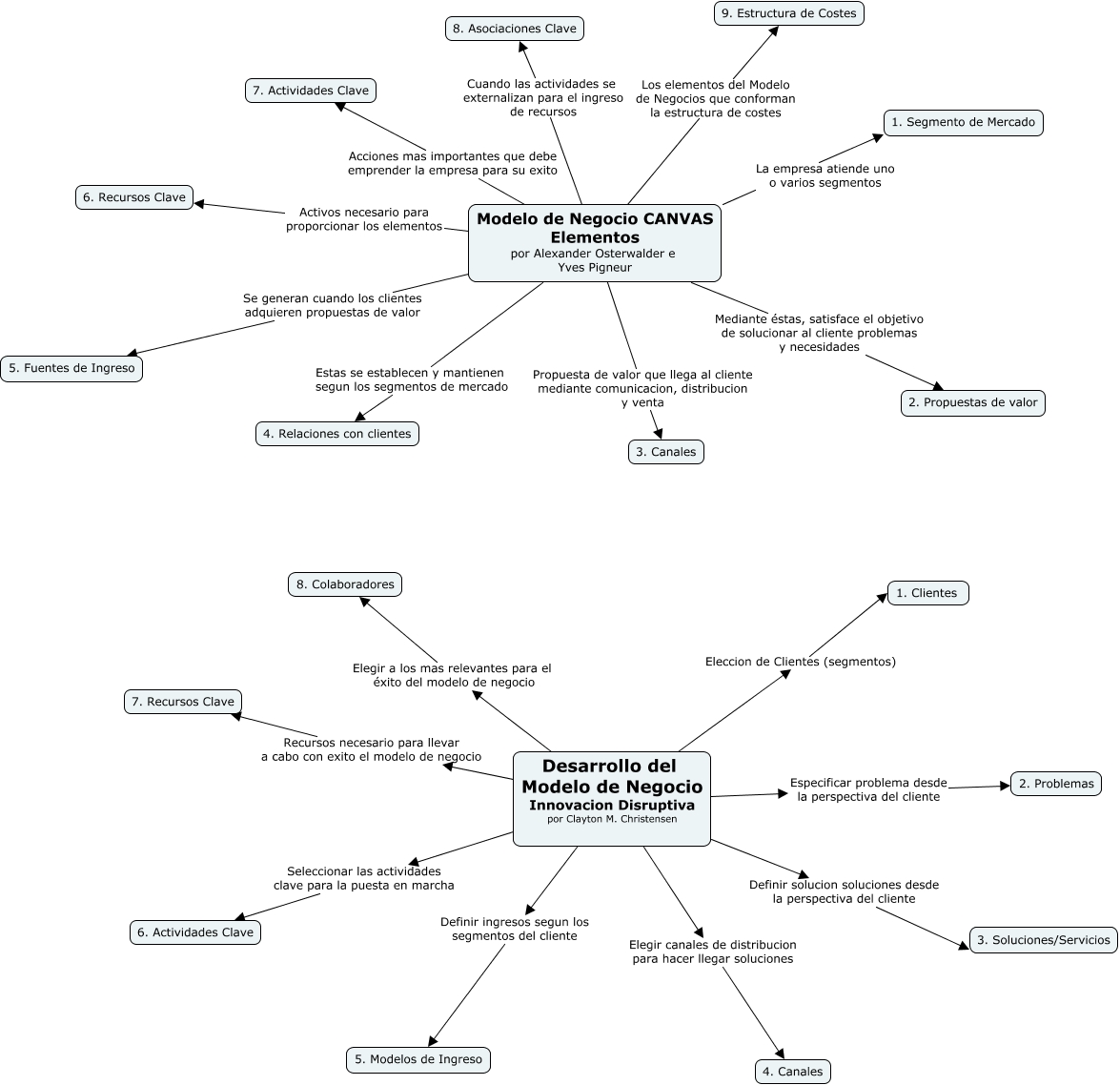 Este Cmap, tiene información relacionada con: Mapa Conceptual Modelos de Negocio JCGR, Desarrollo del Modelo de Negocio Innovacion Disruptiva por Clayton M. Christensen Elegir a los mas relevantes para el éxito del modelo de negocio 8. Colaboradores, Modelo de Negocio CANVAS Elementos por Alexander Osterwalder e Yves Pigneur Mediante éstas, satisface el objetivo de solucionar al cliente problemas y necesidades 2. Propuestas de valor, Modelo de Negocio CANVAS Elementos por Alexander Osterwalder e Yves Pigneur Activos necesario para proporcionar los elementos 6. Recursos Clave, Desarrollo del Modelo de Negocio Innovacion Disruptiva por Clayton M. Christensen Especificar problema desde la perspectiva del cliente 2. Problemas, Modelo de Negocio CANVAS Elementos por Alexander Osterwalder e Yves Pigneur La empresa atiende uno o varios segmentos 1. Segmento de Mercado, Modelo de Negocio CANVAS Elementos por Alexander Osterwalder e Yves Pigneur Cuando las actividades se externalizan para el ingreso de recursos 8. Asociaciones Clave, Modelo de Negocio CANVAS Elementos por Alexander Osterwalder e Yves Pigneur Se generan cuando los clientes adquieren propuestas de valor 5. Fuentes de Ingreso, Desarrollo del Modelo de Negocio Innovacion Disruptiva por Clayton M. Christensen Eleccion de Clientes (segmentos) 1. Clientes, Modelo de Negocio CANVAS Elementos por Alexander Osterwalder e Yves Pigneur Estas se establecen y mantienen segun los segmentos de mercado 4. Relaciones con clientes, Desarrollo del Modelo de Negocio Innovacion Disruptiva por Clayton M. Christensen Definir solucion soluciones desde la perspectiva del cliente 3. Soluciones/Servicios, Desarrollo del Modelo de Negocio Innovacion Disruptiva por Clayton M. Christensen Seleccionar las actividades clave para la puesta en marcha 6. Actividades Clave, Modelo de Negocio CANVAS Elementos por Alexander Osterwalder e Yves Pigneur Propuesta de valor que llega al cliente mediante comunicacion, distribucion y venta 3. Canales, Desarrollo del Modelo de Negocio Innovacion Disruptiva por Clayton M. Christensen Recursos necesario para llevar a cabo con exito el modelo de negocio 7. Recursos Clave, Desarrollo del Modelo de Negocio Innovacion Disruptiva por Clayton M. Christensen Elegir canales de distribucion para hacer llegar soluciones 4. Canales, Modelo de Negocio CANVAS Elementos por Alexander Osterwalder e Yves Pigneur Los elementos del Modelo de Negocios que conforman la estructura de costes 9. Estructura de Costes, Modelo de Negocio CANVAS Elementos por Alexander Osterwalder e Yves Pigneur Acciones mas importantes que debe emprender la empresa para su exito 7. Actividades Clave, Desarrollo del Modelo de Negocio Innovacion Disruptiva por Clayton M. Christensen Definir ingresos segun los segmentos del cliente 5. Modelos de Ingreso