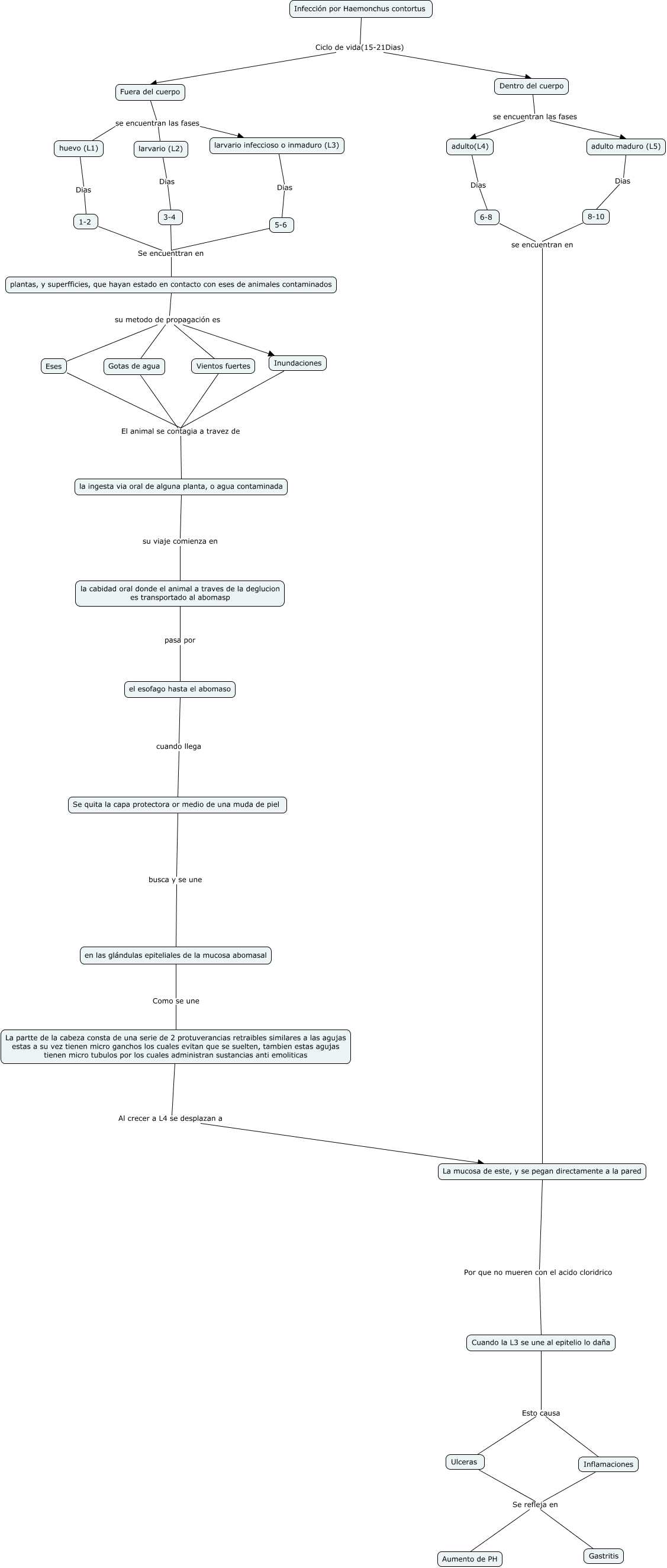 Este Cmap, tiene información relacionada con: fisio patologia, Eses El animal se contagia a travez de la ingesta via oral de alguna planta, o agua contaminada, Inflamaciones Se refleja en Aumento de PH, la ingesta via oral de alguna planta, o agua contaminada su viaje comienza en la cabidad oral donde el animal a traves de la deglucion es transportado al abomasp, plantas, y superfficies, que hayan estado en contacto con eses de animales contaminados su metodo de propagación es Eses, Fuera del cuerpo se encuentran las fases larvario infeccioso o inmaduro (L3), Infección por Haemonchus contortus Ciclo de vida(15-21Dias) Dentro del cuerpo, en las glándulas epiteliales de la mucosa abomasal Como se une La partte de la cabeza consta de una serie de 2 protuverancias retraibles similares a las agujas estas a su vez tienen micro ganchos los cuales evitan que se suelten, tambien estas agujas tienen micro tubulos por los cuales administran sustancias anti emoliticas, Cuando la L3 se une al epitelio lo daña Esto causa Ulceras, adulto(L4) Dias 6-8, larvario infeccioso o inmaduro (L3) Dias 5-6, 6-8 se encuentran en La mucosa de este, y se pegan directamente a la pared, Ulceras Se refleja en Aumento de PH, Inflamaciones Se refleja en Gastritis, Gotas de agua El animal se contagia a travez de la ingesta via oral de alguna planta, o agua contaminada, Ulceras Se refleja en Gastritis, larvario (L2) Dias 3-4, 3-4 Se encuenttran en plantas, y superfficies, que hayan estado en contacto con eses de animales contaminados, huevo (L1) Dias 1-2, Fuera del cuerpo se encuentran las fases huevo (L1), Vientos fuertes El animal se contagia a travez de la ingesta via oral de alguna planta, o agua contaminada