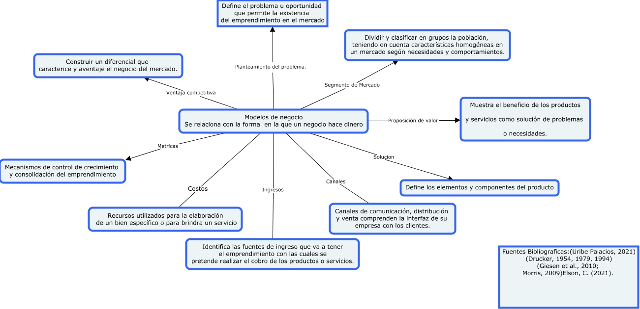 Este Cmap, tiene información relacionada con: MODELO DE NEGOCIOS, Modelos de negocio Se relaciona con la forma en la que un negocio hace dinero Segmento de Mercado Dividir y clasificar en grupos la población, teniendo en cuenta características homogéneas en un mercado según necesidades y comportamientos., Modelos de negocio Se relaciona con la forma en la que un negocio hace dinero Planteamiento del problema. Define el problema u oportunidad que permite la existencia del emprendimiento en el mercado, Modelos de negocio Se relaciona con la forma en la que un negocio hace dinero Costos Recursos utilizados para la elaboración de un bien específico o para brindra un servicio, Modelos de negocio Se relaciona con la forma en la que un negocio hace dinero Canales Canales de comunicación, distribución y venta comprenden la interfaz de su empresa con los clientes., Modelos de negocio Se relaciona con la forma en la que un negocio hace dinero Solucion Define los elementos y componentes del producto, Modelos de negocio Se relaciona con la forma en la que un negocio hace dinero Metricas Mecanismos de control de crecimiento y consolidación del emprendimiento, Modelos de negocio Se relaciona con la forma en la que un negocio hace dinero Proposición de valor Muestra el beneficio de los productos y servicios como solución de problemas o necesidades., Modelos de negocio Se relaciona con la forma en la que un negocio hace dinero Ingresos Identifica las fuentes de ingreso que va a tener el emprendimiento con las cuales se pretende realizar el cobro de los productos o servicios., Modelos de negocio Se relaciona con la forma en la que un negocio hace dinero Ventaja competitiva Construir un diferencial que caracterice y aventaje el negocio del mercado.