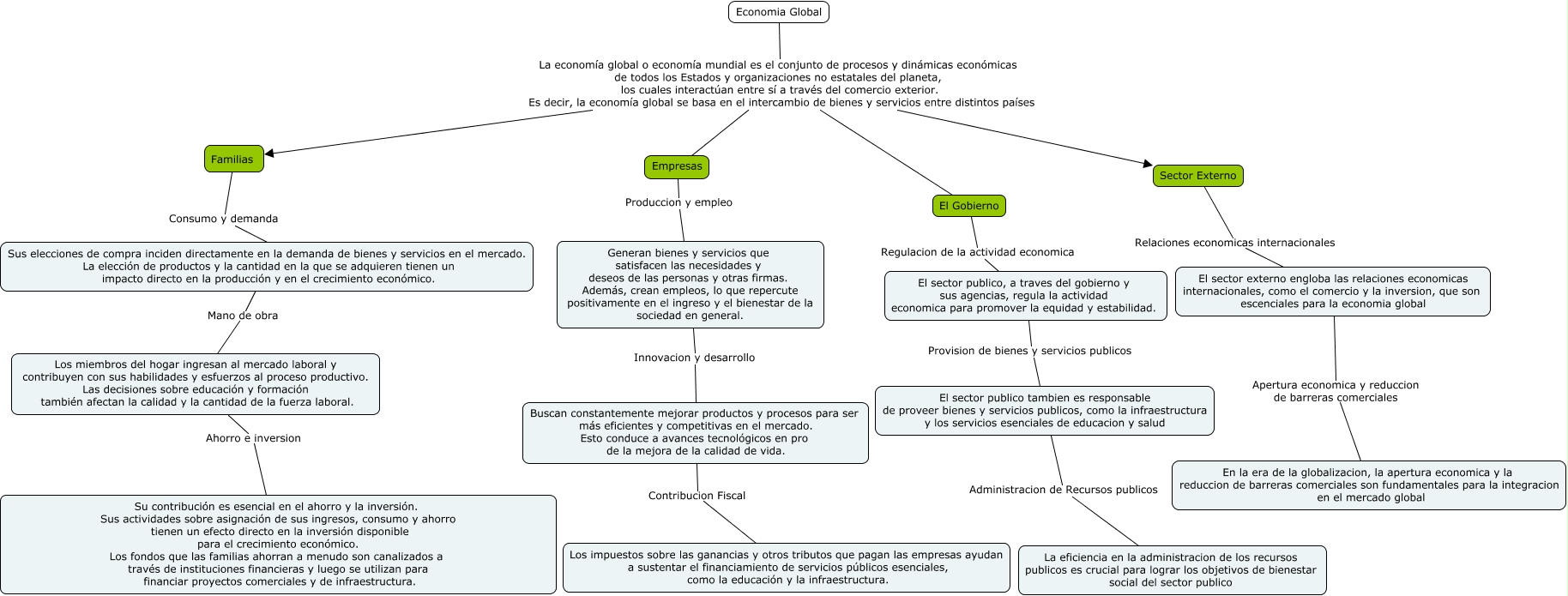 Este Cmap, tiene información relacionada con: Mapa Conceptual economia global, Sector Externo Relaciones economicas internacionales El sector externo engloba las relaciones economicas internacionales, como el comercio y la inversion, que son escenciales para la economia global, El sector publico, a traves del gobierno y sus agencias, regula la actividad economica para promover la equidad y estabilidad. Provision de bienes y servicios publicos El sector publico tambien es responsable de proveer bienes y servicios publicos, como la infraestructura y los servicios esenciales de educacion y salud, Economia Global La economía global o economía mundial es el conjunto de procesos y dinámicas económicas de todos los Estados y organizaciones no estatales del planeta, los cuales interactúan entre sí a través del comercio exterior. Es decir, la economía global se basa en el intercambio de bienes y servicios entre distintos países Familias, Economia Global La economía global o economía mundial es el conjunto de procesos y dinámicas económicas de todos los Estados y organizaciones no estatales del planeta, los cuales interactúan entre sí a través del comercio exterior. Es decir, la economía global se basa en el intercambio de bienes y servicios entre distintos países Empresas, Empresas Produccion y empleo Generan bienes y servicios que satisfacen las necesidades y deseos de las personas y otras firmas. Además, crean empleos, lo que repercute positivamente en el ingreso y el bienestar de la sociedad en general., Economia Global La economía global o economía mundial es el conjunto de procesos y dinámicas económicas de todos los Estados y organizaciones no estatales del planeta, los cuales interactúan entre sí a través del comercio exterior. Es decir, la economía global se basa en el intercambio de bienes y servicios entre distintos países Sector Externo, Los miembros del hogar ingresan al mercado laboral y contribuyen con sus habilidades y esfuerzos al proceso productivo. Las decisiones sobre educación y formación también afectan la calidad y la cantidad de la fuerza laboral. Ahorro e inversion Su contribución es esencial en el ahorro y la inversión. Sus actividades sobre asignación de sus ingresos, consumo y ahorro tienen un efecto directo en la inversión disponible para el crecimiento económico. Los fondos que las familias ahorran a menudo son canalizados a través de instituciones financieras y luego se utilizan para financiar proyectos comerciales y de infraestructura., Buscan constantemente mejorar productos y procesos para ser más eficientes y competitivas en el mercado. Esto conduce a avances tecnológicos en pro de la mejora de la calidad de vida. Contribucion Fiscal Los impuestos sobre las ganancias y otros tributos que pagan las empresas ayudan a sustentar el financiamiento de servicios públicos esenciales, como la educación y la infraestructura., Familias Consumo y demanda Sus elecciones de compra inciden directamente en la demanda de bienes y servicios en el mercado. La elección de productos y la cantidad en la que se adquieren tienen un impacto directo en la producción y en el crecimiento económico., Generan bienes y servicios que satisfacen las necesidades y deseos de las personas y otras firmas. Además, crean empleos, lo que repercute positivamente en el ingreso y el bienestar de la sociedad en general. Innovacion y desarrollo Buscan constantemente mejorar productos y procesos para ser más eficientes y competitivas en el mercado. Esto conduce a avances tecnológicos en pro de la mejora de la calidad de vida., El sector externo engloba las relaciones economicas internacionales, como el comercio y la inversion, que son escenciales para la economia global Apertura economica y reduccion de barreras comerciales En la era de la globalizacion, la apertura economica y la reduccion de barreras comerciales son fundamentales para la integracion en el mercado global, Economia Global La economía global o economía mundial es el conjunto de procesos y dinámicas económicas de todos los Estados y organizaciones no estatales del planeta, los cuales interactúan entre sí a través del comercio exterior. Es decir, la economía global se basa en el intercambio de bienes y servicios entre distintos países El Gobierno, El Gobierno Regulacion de la actividad economica El sector publico, a traves del gobierno y sus agencias, regula la actividad economica para promover la equidad y estabilidad., El sector publico tambien es responsable de proveer bienes y servicios publicos, como la infraestructura y los servicios esenciales de educacion y salud Administracion de Recursos publicos La eficiencia en la administracion de los recursos publicos es crucial para lograr los objetivos de bienestar social del sector publico, Sus elecciones de compra inciden directamente en la demanda de bienes y servicios en el mercado. La elección de productos y la cantidad en la que se adquieren tienen un impacto directo en la producción y en el crecimiento económico. Mano de obra Los miembros del hogar ingresan al mercado laboral y contribuyen con sus habilidades y esfuerzos al proceso productivo. Las decisiones sobre educación y formación también afectan la calidad y la cantidad de la fuerza laboral.