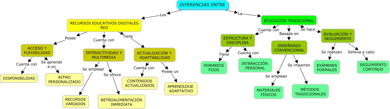Este Cmap, tiene información relacionada con: DIFERENCIAS, DIFERENCIAS ENTRE Los RECURSOS EDUCATIVOS DIGITALES RED, EDUCACIÓN TRADICIONAL Cuenta con ESTRUCTURA Y DISCIPLINA, ESTRUCTURA Y DISCIPLINA Cuenta con INTERACCIÓN PERSONAL, RECURSOS EDUCATIVOS DIGITALES RED Cuenta con INTERACTIVIDAD Y MULTIMEDIA, ACTUALIZACIÓN Y ADAPTABILIDAD Cuenta con CONTENIDOS ACTUALIZADOS, ACTUALIZACIÓN Y ADAPTABILIDAD Posee un APRENDIZAJE ADAPTATIVO, ACCESO Y FLEXIBILIDAD Cuenta con DISPONIBILIDAD, INTERACTIVIDAD Y MULTIMEDIA Se emplean RECURSOS VARIADOS, EVALUACIÓN Y SEGUIMIENTO Selleva a cabo SEGUIMIENTO CONTINUO, RECURSOS EDUCATIVOS DIGITALES RED Tiene ACTUALIZACIÓN Y ADAPTABILIDAD, INTERACTIVIDAD Y MULTIMEDIA Se ofrece RETROALIMENTACIÓN INMEDIATA, ACCESO Y FLEXIBILIDAD Se aprende a un RITMO PERSONALIZADO, EDUCACIÓN TRADICIONAL Basada en ENSEÑANZA CONVENCIONAL, ENSEÑANZA CONVENCIONAL Se imparten MÉTODOS TRADICIONALES, EVALUACIÓN Y SEGUIMIENTO Se realizan EXÁMENES FORMALES, EDUCACIÓN TRADICIONAL Se hace EVALUACIÓN Y SEGUIMIENTO, RECURSOS EDUCATIVOS DIGITALES RED Posee ACCESO Y FLEXIBILIDAD, ESTRUCTURA Y DISCIPLINA Tiene HORARIOS FIJOS, DIFERENCIAS ENTRE La EDUCACIÓN TRADICIONAL, ENSEÑANZA CONVENCIONAL Se emplean MATERIALES FÍSICOS