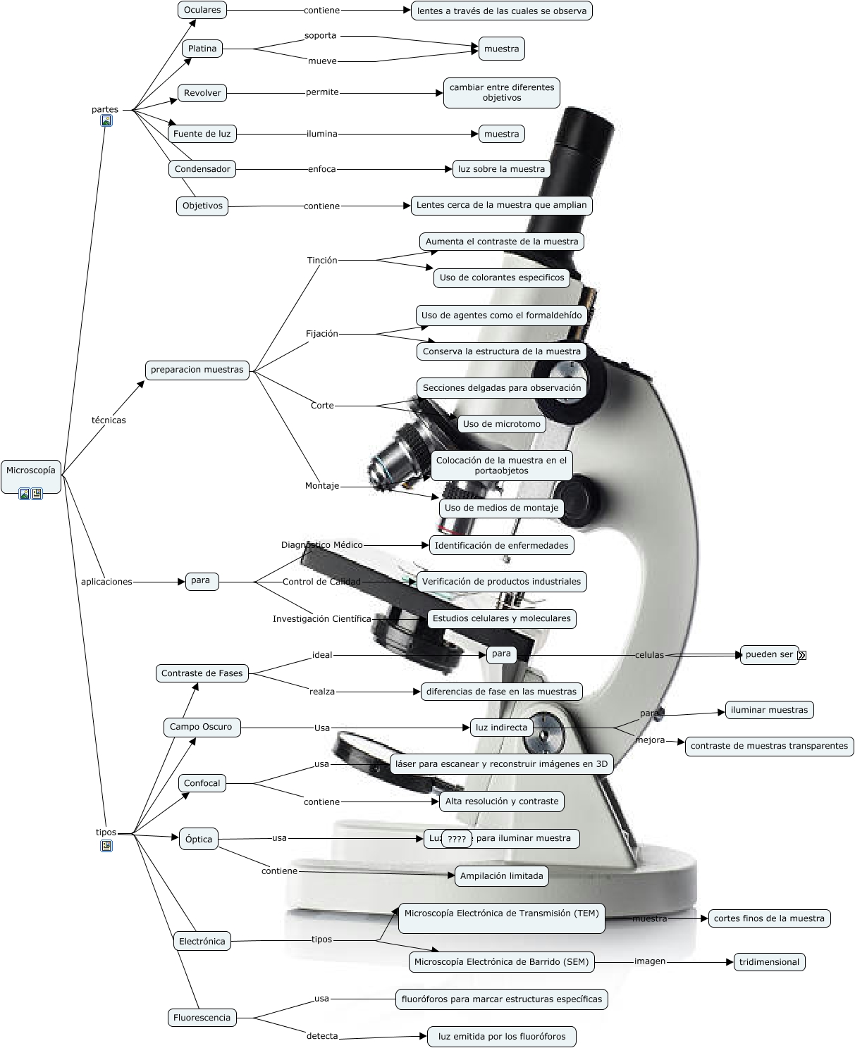 Este Cmap, tiene información relacionada con: microscopia, Microscopía tipos Campo Oscuro, Electrónica tipos Microscopía Electrónica de Barrido (SEM), Microscopía partes Platina, Revolver permite cambiar entre diferentes objetivos, Fluorescencia usa fluoróforos para marcar estructuras específicas, preparacion muestras Fijación Conserva la estructura de la muestra, para Investigación Científica Estudios celulares y moleculares, preparacion muestras Corte Uso de microtomo, Microscopía tipos Contraste de Fases, Microscopía Electrónica de Barrido (SEM) imagen tridimensional, para celulas vivas, Condensador enfoca luz sobre la muestra, preparacion muestras Montaje Uso de medios de montaje, Microscopía técnicas preparacion muestras, Fluorescencia detecta luz emitida por los fluoróforos, Microscopía partes Oculares, preparacion muestras Montaje Colocación de la muestra en el portaobjetos, para Control de Calidad Verificación de productos industriales, Microscopía partes Revolver, Microscopía tipos Fluorescencia