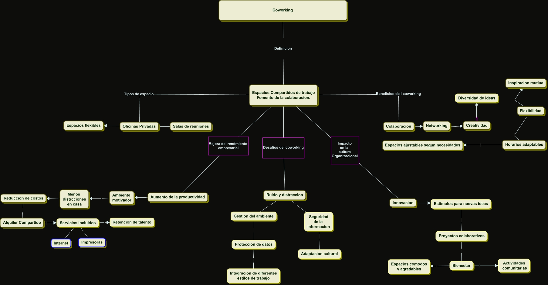 Este Cmap, tiene información relacionada con: Mapa Coneptual, Alquiler Compartido Servicios incluidos, Bienestar Actividades comunitarias, Flexibilidad Inspiracion mutiua, Ambiente motivador Menos distrcciones en casa, Servicios incluidos Retencion de talento, Bienestar Espacios comodos y agradables, Flexibilidad Horarios adaptables, Servicios incluidos Internet, Reduccion de costos Alquiler Compartido, Innovacion Estimulos para nuevas ideas, Oficinas Privadas Espacios flexibles, Gestion del ambiente Proteccion de datos, Proyectos colaborativos Bienestar, Seguridad de la informacion Adaptacion cultural, Horarios adaptables Espacios ajustables segun necesidades, Espacios Compartidos de trabajo Fomento de la colaboracion. Desafios del coworking Ruido y distraccion, Espacios Compartidos de trabajo Fomento de la colaboracion. Impacto en la cultura Organizacional Innovacion, Ruido y distraccion Gestion del ambiente, Networking Creatividad, Colaboracion Networking