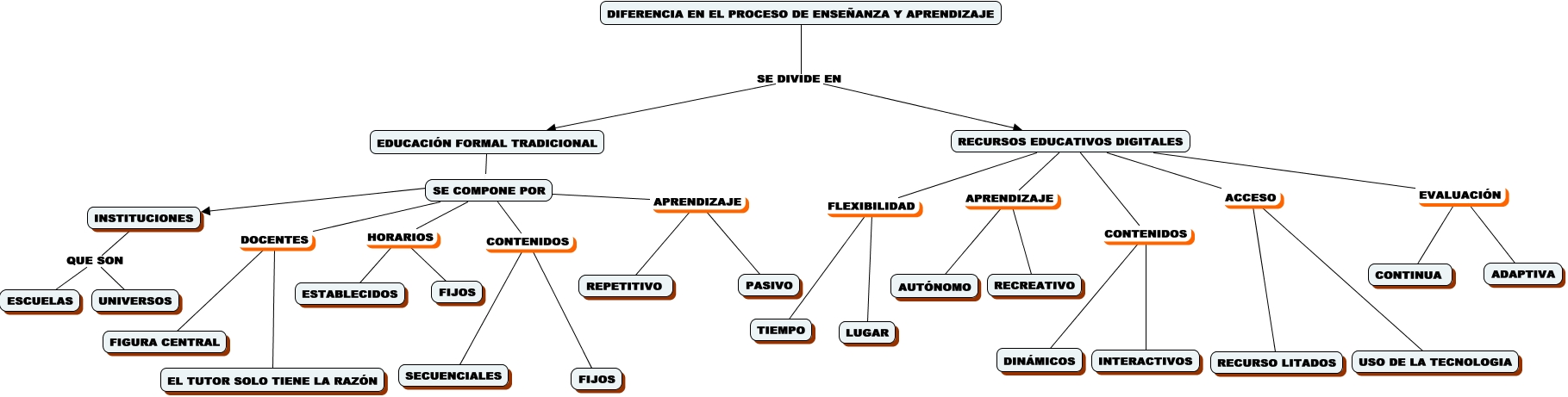 Este Cmap, tiene información relacionada con: educación tradicional vs recursos educativos digitales, RECURSOS EDUCATIVOS DIGITALES CONTENIDOS DINÁMICOS, RECURSOS EDUCATIVOS DIGITALES ACCESO USO DE LA TECNOLOGIA, SE COMPONE POR DOCENTES EL TUTOR SOLO TIENE LA RAZÓN, RECURSOS EDUCATIVOS DIGITALES APRENDIZAJE RECREATIVO, SE COMPONE POR CONTENIDOS FIJOS, RECURSOS EDUCATIVOS DIGITALES FLEXIBILIDAD TIEMPO, RECURSOS EDUCATIVOS DIGITALES EVALUACIÓN ADAPTIVA, RECURSOS EDUCATIVOS DIGITALES EVALUACIÓN CONTINUA, RECURSOS EDUCATIVOS DIGITALES ACCESO RECURSO LITADOS, SE COMPONE POR HORARIOS ESTABLECIDOS, RECURSOS EDUCATIVOS DIGITALES CONTENIDOS INTERACTIVOS, SE COMPONE POR DOCENTES FIGURA CENTRAL, INSTITUCIONES QUE SON ESCUELAS, SE COMPONE POR APRENDIZAJE PASIVO, SE COMPONE POR HORARIOS FIJOS, SE COMPONE POR CONTENIDOS SECUENCIALES, RECURSOS EDUCATIVOS DIGITALES APRENDIZAJE AUTÓNOMO, DIFERENCIA EN EL PROCESO DE ENSEÑANZA Y APRENDIZAJE SE DIVIDE EN EDUCACIÓN FORMAL TRADICIONAL, DIFERENCIA EN EL PROCESO DE ENSEÑANZA Y APRENDIZAJE SE DIVIDE EN RECURSOS EDUCATIVOS DIGITALES, EDUCACIÓN FORMAL TRADICIONAL INSTITUCIONES