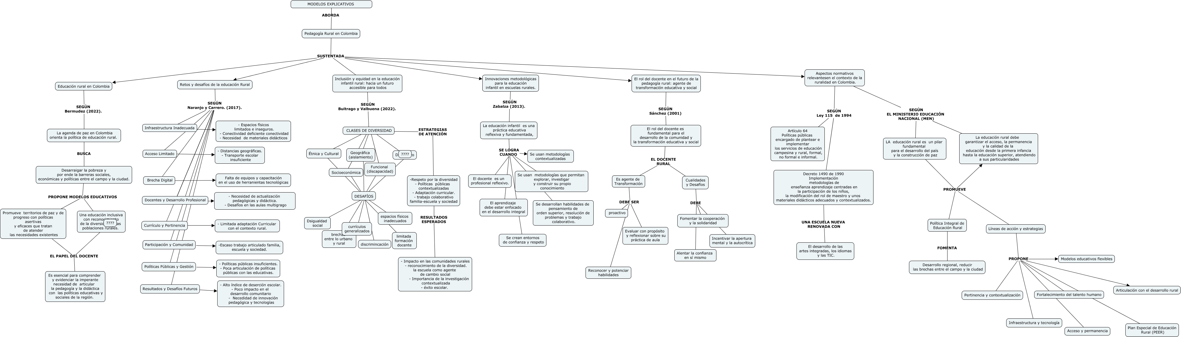 Este Cmap, tiene información relacionada con: MODELOS EXPLICATIVOS SOBRE EDUCACIÓN RURAL EN COLOMBIA, Desarraigar la pobreza y por ende la barreras sociales, económicas y políticas entre el campo y la ciudad. PROPONE MODELOS EDUCATIVOS Una educación inclusiva con reconocimiento de la diversidad en las poblaciones rurales., Desarraigar la pobreza y por ende la barreras sociales, económicas y políticas entre el campo y la ciudad. PROPONE MODELOS EDUCATIVOS Promueve territorios de paz y de progreso con políticas asertivas y eficaces que tratan de atender las necesidades existentes, Aspectos normativos relevantesen el contexto de la ruralidad en Colombia. SEGÚN Ley 115 de 1994 Artículo 64 Políticas públicas encargado de plantear e implementar los servicios de educación campesina y rural, formal, no formal e informal., CLASES DE DIVERSIDAD ???? Geográfica (aislamiento), La educación infantil es una práctica educativa reflexiva y fundamentada, SE LOGRA CUANDO El aprendizaje debe estar enfocado en el desarrollo integral, Líneas de acción y estrategias PROPONE Infraestructura y tecnología, La educación infantil es una práctica educativa reflexiva y fundamentada, SE LOGRA CUANDO Se usan metodologías que permitan explorar, investigar y construir su propio conocimiento, CLASES DE DIVERSIDAD ???? Funcional (discapacidad), CLASES DE DIVERSIDAD ???? Socioeconómica, Inclusión y equidad en la educación infantil rural: hacia un futuro accesible para todos SEGÚN Buitrago y Valbuena (2022). CLASES DE DIVERSIDAD, Retos y desafíos de la educación Rural SEGÚN Naranjo y Carrero. (2017). Infraestructura Inadecuada, Líneas de acción y estrategias PROPONE Acceso y permanencia, LA educación rural es un pilar fundamental para el desarrollo del país y la construcción de paz PROMUEVE Política Integral de Educación Rural, Es agente de Transformación DEBE SER proactivo, -Respeto por la diversidad - Políticas públicas contextualizadas - Adaptación curricular. - trabajo colaborativo familia-escuela y sociedad RESULTADOS ESPERADOS - Impacto en las comunidades rurales - reconocimiento de la diversidad. la escuela como agente de cambio social - Importancia de la investigación contextualizada - éxito escolar., Pedagogía Rural en Colombia SUSTENTADA Aspectos normativos relevantesen el contexto de la ruralidad en Colombia., La educación infantil es una práctica educativa reflexiva y fundamentada, SE LOGRA CUANDO Se desarrollan habilidades de pensamiento de orden superior, resolución de problemas y trabajo colaborativo., DESAFÍOS ???? limitada formación docente, Líneas de acción y estrategias PROPONE Modelos educativos flexibles, Educación rural en Colombia SEGÚN Bermudez (2022). La agenda de paz en Colombia orienta la política de educación rural.