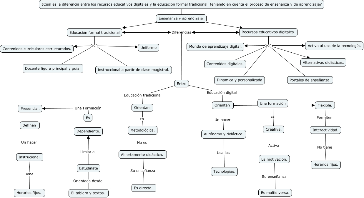 Este Cmap, tiene información relacionada con: Mapa, Educación formal tradicional Son instruccional a partir de clase magistral., Presencial. Definen, Educación formal tradicional Diferencias Entre, Orientan ???? Flexible., Autónomo y didáctico. Usa las Tecnologías., Recursos educativos digitales Son Contenidos digitales., Orientan Una Formación Es, Recursos educativos digitales Son Mundo de aprendizaje digital., Creativa. Activa La motivación., Recursos educativos digitales Son Portales de enseñanza., Definen Un hacer Instrucional., Orientan Una Formación Presencial., Recursos educativos digitales Son Alternativas didácticas., La motivación. Su enseñanza Es multidiversa., Estudinate Limita al Dependiente., Educación formal tradicional Son Uniforme, Abiertamente didáctica. Su enseñanza Es directa., Educación formal tradicional Son Contenidos curriculares estructurados., Recursos educativos digitales Son Dinamica y personalizada, ¿Cuál es la diferencia entre los recursos educativos digitales y la educación formal tradicional, teniendo en cuenta el proceso de enseñanza y de aprendizaje? Educación formal tradicional