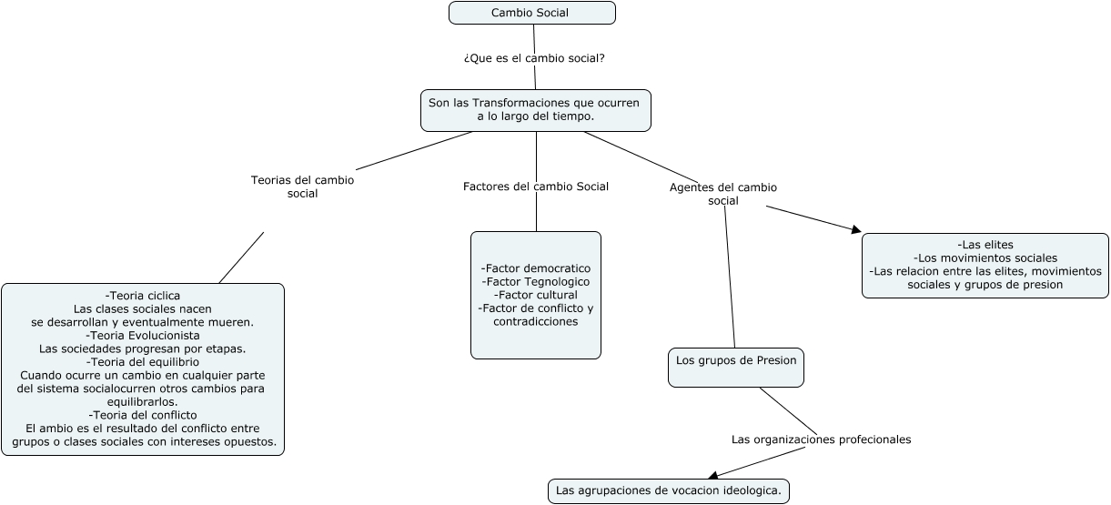 Este Cmap, tiene información relacionada con: A1clau, Son las Transformaciones que ocurren a lo largo del tiempo. Agentes del cambio social Los grupos de Presion, Son las Transformaciones que ocurren a lo largo del tiempo. Teorias del cambio social -Teoria ciclica Las clases sociales nacen se desarrollan y eventualmente mueren. -Teoria Evolucionista Las sociedades progresan por etapas. -Teoria del equilibrio Cuando ocurre un cambio en cualquier parte del sistema socialocurren otros cambios para equilibrarlos. -Teoria del conflicto El ambio es el resultado del conflicto entre grupos o clases sociales con intereses opuestos., Cambio Social ¿Que es el cambio social? Son las Transformaciones que ocurren a lo largo del tiempo., Los grupos de Presion Las organizaciones profecionales Las agrupaciones de vocacion ideologica., Son las Transformaciones que ocurren a lo largo del tiempo. Factores del cambio Social -Factor democratico -Factor Tegnologico -Factor cultural -Factor de conflicto y contradicciones, Son las Transformaciones que ocurren a lo largo del tiempo. Agentes del cambio social -Las elites -Los movimientos sociales -Las relacion entre las elites, movimientos sociales y grupos de presion