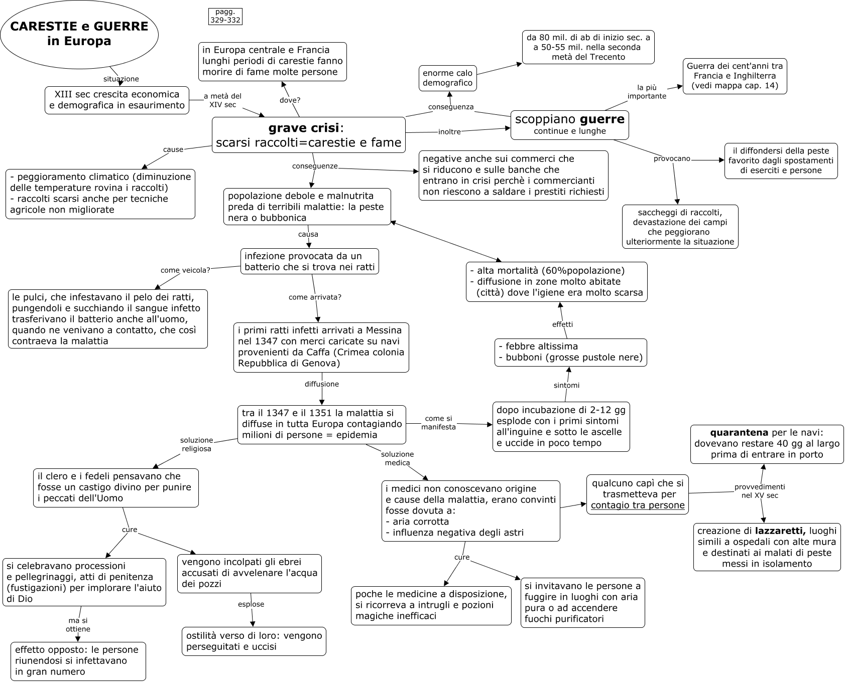 Questa Cmap, creata con IHMC CmapTools, contiene informazioni relative a: Carestie e guerre_Europa_web, grave crisi: scarsi raccolti=carestie e fame conseguenze negative anche sui commerci che si riducono e sulle banche che entrano in crisi perchè i commercianti non riescono a saldare i prestiti richiesti, qualcuno capì che si trasmetteva per contagio tra persone provvedimenti nel XV sec quarantena per le navi: dovevano restare 40 gg al largo prima di entrare in porto, infezione provocata da un batterio che si trova nei ratti come arrivata? i primi ratti infetti arrivati a Messina nel 1347 con merci caricate su navi provenienti da Caffa (Crimea colonia Repubblica di Genova), grave crisi: scarsi raccolti=carestie e fame conseguenze popolazione debole e malnutrita preda di terribili malattie: la peste nera o bubbonica, infezione provocata da un batterio che si trova nei ratti come veicola? le pulci, che infestavano il pelo dei ratti, pungendoli e succhiando il sangue infetto trasferivano il batterio anche all'uomo, quando ne venivano a contatto, che così contraeva la malattia, scoppiano guerre continue e lunghe provocano il diffondersi della peste favorito dagli spostamenti di eserciti e persone, grave crisi: scarsi raccolti=carestie e fame inoltre scoppiano guerre continue e lunghe, i primi ratti infetti arrivati a Messina nel 1347 con merci caricate su navi provenienti da Caffa (Crimea colonia Repubblica di Genova) diffusione tra il 1347 e il 1351 la malattia si diffuse in tutta Europa contagiando milioni di persone = epidemia, dopo incubazione di 2-12 gg esplode con i primi sintomi all'inguine e sotto le ascelle e uccide in poco tempo sintomi - febbre altissima - bubboni (grosse pustole nere), grave crisi: scarsi raccolti=carestie e fame cause - peggioramento climatico (diminuzione delle temperature rovina i raccolti) - raccolti scarsi anche per tecniche agricole non migliorate, qualcuno capì che si trasmetteva per contagio tra persone provvedimenti nel XV sec creazione di lazzaretti, luoghi simili a ospedali con alte mura e destinati ai malati di peste messi in isolamento, i medici non conoscevano origine e cause della malattia, erano convinti fosse dovuta a: - aria corrotta - influenza negativa degli astri ???? qualcuno capì che si trasmetteva per contagio tra persone, si celebravano processioni e pellegrinaggi, atti di penitenza (fustigazioni) per implorare l'aiuto di Dio ma si ottiene effetto opposto: le persone riunendosi si infettavano in gran numero, enorme calo demografico ???? da 80 mil. di ab di inizio sec. a a 50-55 mil. nella seconda metà del Trecento, scoppiano guerre continue e lunghe conseguenza enorme calo demografico, tra il 1347 e il 1351 la malattia si diffuse in tutta Europa contagiando milioni di persone = epidemia soluzione religiosa il clero e i fedeli pensavano che fosse un castigo divino per punire i peccati dell'Uomo, CARESTIE e GUERRE in Europa situazione XIII sec crescita economica e demografica in esaurimento, il clero e i fedeli pensavano che fosse un castigo divino per punire i peccati dell'Uomo cure si celebravano processioni e pellegrinaggi, atti di penitenza (fustigazioni) per implorare l'aiuto di Dio, scoppiano guerre continue e lunghe la più importante Guerra dei cent'anni tra Francia e Inghilterra (vedi mappa cap. 14), scoppiano guerre continue e lunghe provocano saccheggi di raccolti, devastazione dei campi che peggiorano ulteriormente la situazione