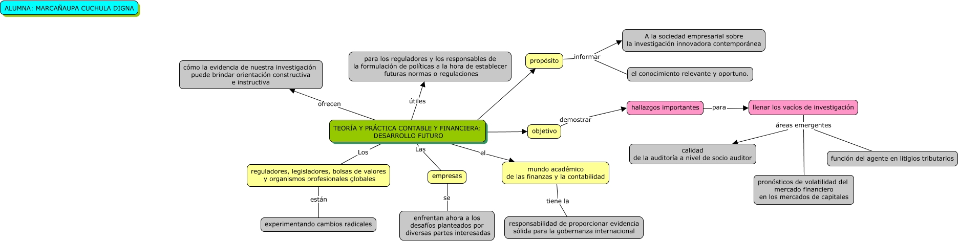 Este Cmap, tiene información relacionada con: MAPA DE ARTICULO TEORIA Y PRACTICA CONTABLE Y FINANCIERA, TEORÍA Y PRÁCTICA CONTABLE Y FINANCIERA: DESARROLLO FUTURO ???? propósito, TEORÍA Y PRÁCTICA CONTABLE Y FINANCIERA: DESARROLLO FUTURO útiles para los reguladores y los responsables de la formulación de políticas a la hora de establecer futuras normas o regulaciones, llenar los vacíos de investigación áreas emergentes calidad de la auditoría a nivel de socio auditor, TEORÍA Y PRÁCTICA CONTABLE Y FINANCIERA: DESARROLLO FUTURO Las empresas, objetivo demostrar hallazgos importantes, TEORÍA Y PRÁCTICA CONTABLE Y FINANCIERA: DESARROLLO FUTURO Los reguladores, legisladores, bolsas de valores y organismos profesionales globales, propósito informar el conocimiento relevante y oportuno., mundo académico de las finanzas y la contabilidad tiene la responsabilidad de proporcionar evidencia sólida para la gobernanza internacional, llenar los vacíos de investigación áreas emergentes función del agente en litigios tributarios, hallazgos importantes para llenar los vacíos de investigación, propósito informar A la sociedad empresarial sobre la investigación innovadora contemporánea, empresas se enfrentan ahora a los desafíos planteados por diversas partes interesadas, TEORÍA Y PRÁCTICA CONTABLE Y FINANCIERA: DESARROLLO FUTURO ofrecen cómo la evidencia de nuestra investigación puede brindar orientación constructiva e instructiva, TEORÍA Y PRÁCTICA CONTABLE Y FINANCIERA: DESARROLLO FUTURO el mundo académico de las finanzas y la contabilidad, llenar los vacíos de investigación áreas emergentes pronósticos de volatilidad del mercado financiero en los mercados de capitales, TEORÍA Y PRÁCTICA CONTABLE Y FINANCIERA: DESARROLLO FUTURO ???? objetivo, reguladores, legisladores, bolsas de valores y organismos profesionales globales están experimentando cambios radicales