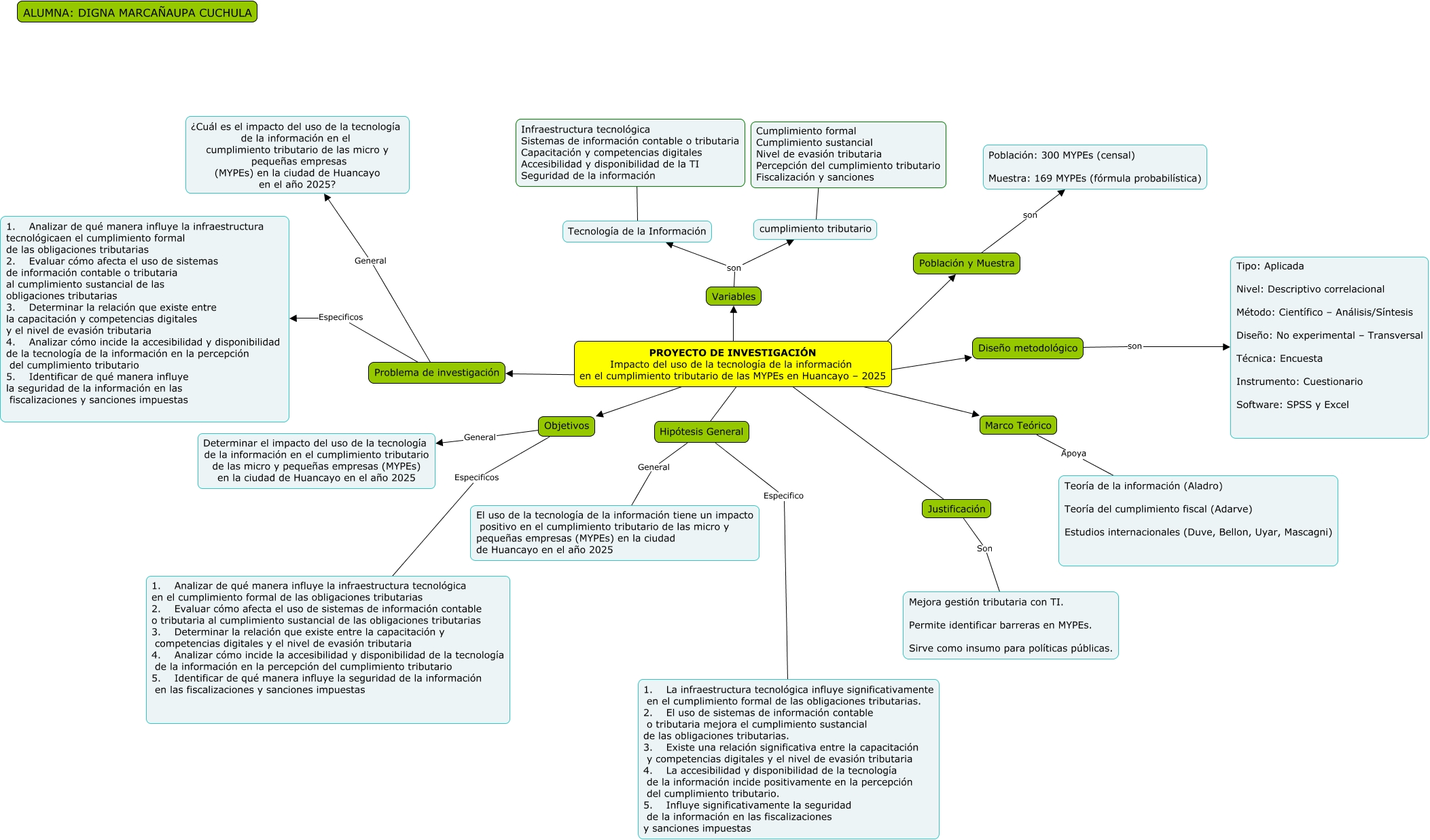 Este Cmap, tiene información relacionada con: PROYECTO DE INVESTIGACION, Justificación Son Mejora gestión tributaria con TI. Permite identificar barreras en MYPEs. Sirve como insumo para políticas públicas., PROYECTO DE INVESTIGACIÓN Impacto del uso de la tecnología de la información en el cumplimiento tributario de las MYPEs en Huancayo – 2025 ???? Justificación, Variables son cumplimiento tributario, cumplimiento tributario ???? Cumplimiento formal Cumplimiento sustancial Nivel de evasión tributaria Percepción del cumplimiento tributario Fiscalización y sanciones, Problema de investigación Especificos 1. Analizar de qué manera influye la infraestructura tecnológicaen el cumplimiento formal de las obligaciones tributarias 2. Evaluar cómo afecta el uso de sistemas de información contable o tributaria al cumplimiento sustancial de las obligaciones tributarias 3. Determinar la relación que existe entre la capacitación y competencias digitales y el nivel de evasión tributaria 4. Analizar cómo incide la accesibilidad y disponibilidad de la tecnología de la información en la percepción del cumplimiento tributario 5. Identificar de qué manera influye la seguridad de la información en las fiscalizaciones y sanciones impuestas, Objetivos General Determinar el impacto del uso de la tecnología de la información en el cumplimiento tributario de las micro y pequeñas empresas (MYPEs) en la ciudad de Huancayo en el año 2025, PROYECTO DE INVESTIGACIÓN Impacto del uso de la tecnología de la información en el cumplimiento tributario de las MYPEs en Huancayo – 2025 ???? Población y Muestra, Marco Teórico Apoya Teoría de la información (Aladro) Teoría del cumplimiento fiscal (Adarve) Estudios internacionales (Duve, Bellon, Uyar, Mascagni), Tecnología de la Información ???? Infraestructura tecnológica Sistemas de información contable o tributaria Capacitación y competencias digitales Accesibilidad y disponibilidad de la TI Seguridad de la información, Variables son Tecnología de la Información, Población y Muestra son Población: 300 MYPEs (censal) Muestra: 169 MYPEs (fórmula probabilística), PROYECTO DE INVESTIGACIÓN Impacto del uso de la tecnología de la información en el cumplimiento tributario de las MYPEs en Huancayo – 2025 ???? Variables, Hipótesis General General El uso de la tecnología de la información tiene un impacto positivo en el cumplimiento tributario de las micro y pequeñas empresas (MYPEs) en la ciudad de Huancayo en el año 2025, Hipótesis General Especifico 1. La infraestructura tecnológica influye significativamente en el cumplimiento formal de las obligaciones tributarias. 2. El uso de sistemas de información contable o tributaria mejora el cumplimiento sustancial de las obligaciones tributarias. 3. Existe una relación significativa entre la capacitación y competencias digitales y el nivel de evasión tributaria 4. La accesibilidad y disponibilidad de la tecnología de la información incide positivamente en la percepción del cumplimiento tributario. 5. Influye significativamente la seguridad de la información en las fiscalizaciones y sanciones impuestas, Objetivos Especificos 1. Analizar de qué manera influye la infraestructura tecnológica en el cumplimiento formal de las obligaciones tributarias 2. Evaluar cómo afecta el uso de sistemas de información contable o tributaria al cumplimiento sustancial de las obligaciones tributarias 3. Determinar la relación que existe entre la capacitación y competencias digitales y el nivel de evasión tributaria 4. Analizar cómo incide la accesibilidad y disponibilidad de la tecnología de la información en la percepción del cumplimiento tributario 5. Identificar de qué manera influye la seguridad de la información en las fiscalizaciones y sanciones impuestas, PROYECTO DE INVESTIGACIÓN Impacto del uso de la tecnología de la información en el cumplimiento tributario de las MYPEs en Huancayo – 2025 ???? Objetivos, Problema de investigación General ¿Cuál es el impacto del uso de la tecnología de la información en el cumplimiento tributario de las micro y pequeñas empresas (MYPEs) en la ciudad de Huancayo en el año 2025?, PROYECTO DE INVESTIGACIÓN Impacto del uso de la tecnología de la información en el cumplimiento tributario de las MYPEs en Huancayo – 2025 ???? Problema de investigación, PROYECTO DE INVESTIGACIÓN Impacto del uso de la tecnología de la información en el cumplimiento tributario de las MYPEs en Huancayo – 2025 ???? Hipótesis General, PROYECTO DE INVESTIGACIÓN Impacto del uso de la tecnología de la información en el cumplimiento tributario de las MYPEs en Huancayo – 2025 ???? Diseño metodológico