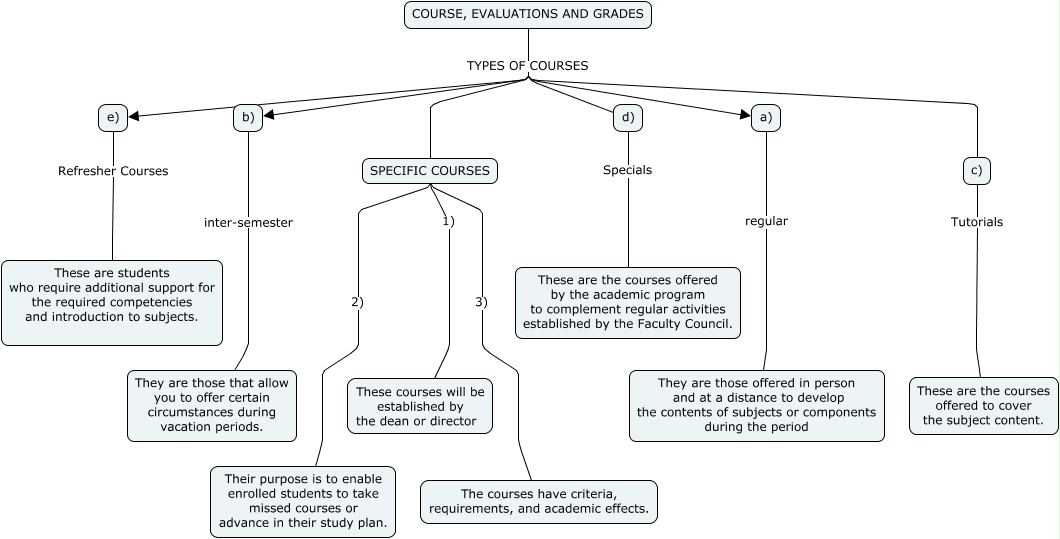Este Cmap, tiene información relacionada con: mapa conceptual, e) Refresher Courses These are students who require additional support for the required competencies and introduction to subjects., SPECIFIC COURSES 1) These courses will be established by the dean or director, d) Specials These are the courses offered by the academic program to complement regular activities established by the Faculty Council., COURSE, EVALUATIONS AND GRADES TYPES OF COURSES b), COURSE, EVALUATIONS AND GRADES TYPES OF COURSES d), SPECIFIC COURSES 2) Their purpose is to enable enrolled students to take missed courses or advance in their study plan., COURSE, EVALUATIONS AND GRADES TYPES OF COURSES e), b) inter-semester They are those that allow you to offer certain circumstances during vacation periods., SPECIFIC COURSES 3) The courses have criteria, requirements, and academic effects., COURSE, EVALUATIONS AND GRADES TYPES OF COURSES c), a) regular They are those offered in person and at a distance to develop the contents of subjects or components during the period, COURSE, EVALUATIONS AND GRADES TYPES OF COURSES SPECIFIC COURSES, COURSE, EVALUATIONS AND GRADES TYPES OF COURSES a), c) Tutorials These are the courses offered to cover the subject content.