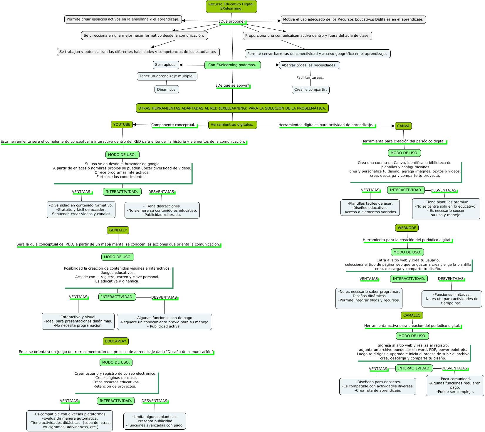 Este Cmap, tiene información relacionada con: RED EXELEARNING, Abarcar todas las necesidades. Facilitar tareas. Crear y compartir., INTERACTIVIDAD. VENTAJAS - Diseñado para docentes. -Es compatible con actividades diversas. -Crea ruta de aprendizaje., Ser rapidos. ???? Dinámicos., Recurso Educativo Digital. EXelearning. ¿Qué propone? Se direcciona en una mejor hacer formativo desde la comunicación., Recurso Educativo Digital. EXelearning. ¿Qué propone? Con EXelearning podemos., Recurso Educativo Digital. EXelearning. ¿Qué propone? Proporciona una comunicaicon activa dentro y fuera del aula de clase., Con EXelearning podemos. ???? Abarcar todas las necesidades., CANVA Herramienta para creación del periódico digital. MODO DE USO., INTERACTIVIDAD. DESVENTAJAS -Algunas funciones son de pago. -Requiere un conocimiento previo para su manejo. - Publicidad activa., Recurso Educativo Digital. EXelearning. ¿Qué propone? Motiva el uso adecuado de los Recursos Educativos Diditales en el aprendizaje., INTERACTIVIDAD. VENTAJAS -Plantillas fáciles de usar. -Diseños educativos. -Acceso a elementos variados., Herramientras digitales. Herramientas digitales para actividad de aprendizaje. CANVA, WEBNODE Herramienta para la creación del periódico digital. MODO DE USO., Herramientras digitales. Componente conceptual. YOUTUBE, MODO DE USO. Su uso se da desde el buscador de google A partir de enlaces o nombres propios se pueden ubicar diversidad de videos. Ofrece programas interactivos. Fortalece los conocimientos. INTERACTIVIDAD., INTERACTIVIDAD. VENTAJAS -Interactivo y visual. -Ideal para presentaciones dinánimas. -No necesita programación., Recurso Educativo Digital. EXelearning. ¿Qué propone? Se trabajan y potencializan las diferentes habilidades y competencias de los estudiantes, MODO DE USO. Entra al sitio web y crea tu usuario, selecciona el tipo de página web que te gustaria crear, elige la plantilla crea. descarga y comparte tu diseño. INTERACTIVIDAD., MODO DE USO. Posibilidad la creación de contenidos visuales e interactivos. Juegos educativos. Accede con el registro, correo y clave personal. Es educativa y dinámica. INTERACTIVIDAD., Recurso Educativo Digital. EXelearning. ¿Qué propone? Permite crear espacios activos en la enseñana y el aprendizaje.